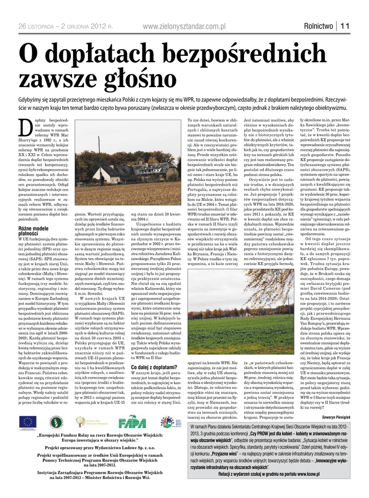 26 listopada – 2 grudnia 2012 r. Rolnictwo | 11 www.zielonysztandar.com.pl O dopłatach bezpośrednich zawsze głośno Gdybyśmy się zapytali przeciętnego mieszkańca Polski z czym kojarzy się mu WPR, to zapewne odpowiedziałby, że z dopłatami bezpośrednimi. Rzeczywiście w naszym kraju ten temat bardzo często bywa poruszany (zwłaszcza w okresie przedwyborczym), często jednak z brakiem należytego obiektywizmu. D opłaty bezpośrednie zostały wprowadzone w ramach reformy WPR Mac Sharry’ego z 1992 r., a ich znaczenie wzmocniły kolejne reformy WPR na przełomie XX i XXI w. Celem wprowadzenia dopłat bezpośrednich (zwanych też kompensacyjnymi) było rekompensowanie rolnikom spadku ich dochodów, co powodowały obniżki cen gwarantowanych. Odtąd kolejne znaczne redukcje cen gwarantowanych i interwencyjnych realizowane w ramach reform WPR, odbywały się równocześnie z zwiększeniem poziomu dopłat bezpośrednich. Różne modele płatności W UE funkcjonują dwa systemy płatności: system płatności jednolitej (SPS) oraz system jednolitej płatności obszarowej (SAPS). SPS stosowany jest w krajach starej Unii, a także przez dwa nowe kraje członkowskie (Maltę i Słowenię). W ramach tego systemu funkcjonują trzy modele: historyczny, regionalny i mieszany. Dominującym rozwiązaniem w Europie Zachodniej jest model historyczny. W tym przypadku wysokość płatności bezpośrednich jest obliczana na podstawie kwoty płatności przyznanych każdemu rolnikowi w wybranym okresie odniesienia (na ogół w latach 20002002). Każdą płatność bezpośrednią wylicza się, dzieląc kwotę referencyjną przez liczbę hektarów zakwalifikowanych do uzyskanego wsparcia. Wsparcie to powiązali z produkcją w maksymalnym stopniu Francuzi. Państwa członkowskie mogą również zdecydować się na przydzielanie płatności na poziomie regionalnym. Wtedy należy ustalić pułapy regionalne i podzielić je przez liczbę rolników w re- gionie. Wartość przysługujących im uprawnień ustala się, dzieląc pulę środków finansowych przez liczbę hektarów zgłoszonych w pierwszym roku stosowania systemu. Wszystkie uprawnienia do płatności w danym regionie mają tę samą wartość jednostkową. System ten obowiązuje na terenie Malty i Słowenii. Państwa członkowskie mogą też sięgnąć po model stanowiący połączenie dwóch wcześniejszych rozwiązań, czyli tzw. model mieszany. Tę drogę wybrali m.in. Szwedzi. W now ych k r ajach U E (z wyjątkiem Malty i Słowenii) zastosowano prostszy system płatności obszarowej (SAPS). W ramach tego systemu płatności wypłacane są na hektar użytków rolnych utrzymywanych w dobrej kulturze rolnej na dzień 30 czerwca 2003 r. Polska przystępując do UE, u zysk a ła w ra mach W PR znacznie niższy niż w państwach UE-15 poziom płatności bezpośrednich w przeliczeniu na 1 ha kwalifikowanych użytków rolnych, z możliwością ich corocznego zwiększania (poprzez środki z budżetu krajowego tzw. uzupełniające płatności obszarowe) tak, by w 2013 r. osiągnąć poziom wsparcia jak w krajach UE-15 wg stanu na dzień 30 kwietnia 2004 r. Uzupełnienie z budżetu krajowego dopłat bezpośrednich zostało wynegocjowane na słynnym szczycie w Kopenhadze w 2002 r. przez ówczesnego wicepremiera i ministra rolnictwa Jarosława Kalinowskiego. Początkowo Polsce proponowano tylko 25 proc. ówczesnej średniej płatności unijnej i była to już propozycja praktycznie ostateczna. Nie chciał się na nią zgodzić właśnie Kalinowski, który nie opuszczał stołu negocjacyjnego i zaproponował uzupełnienie płatności środkami krajowymi, które ostatecznie ustalano na poziomie 55 proc. średniej unijnej. W kolejnych latach poziom dofinansowania unijnego miał być stopniowo zwiększany, natomiast udział środków krajowych zmniejszany. Także wtedy Polska wynegocjowała największe udziały w funduszach z całego budżetu WPR na II filar. Co dalej z dopłatami? W naszym kraju, jeśli poruszany jest temat dopłat bezpośrednich, to najczęściej w kontekście podkreślenia faktu, że polscy rolnicy nadal otrzymują mniejsze dopłaty bezpośrednie niż rolnicy w starej Unii. Europejski Fundusz Rolny na rzecz Rozwoju Obszarów Wiejskich „Europejski Fundusz Rolny na rzecz Rozwoju Obszarów Wiejskich: Europa inwestująca w obszary wiejskie.” Projekt opracowany przez Wydawnictwo Ludowe Sp. z. o.o. Projekt współfinansowany ze środków Unii Europejskiej w ramach Pomocy Technicznej Programu Rozwoju Obszarów Wiejskich na lata 2007-2013. Instytucja Zarządzająca Programem Rozwoju Obszarów Wiejskich na lata 2007-2013 – Minister Rolnictwa i Rozwoju Wsi. To nie dziwi, bowiem w zbliżonych warunkach naturalnych i zbliżonych kosztach stanowi to poważne naruszenie zasad równej konkurencji. Ale w rzeczywistości problem jest o wiele bardziej złożony. Przede wszystkim zróżnicowanie wielkości dopłat bezpośrednich wcale nie biegnie tak jednoznacznie, po linii nowe i stare kraje UE, bo np. Polska ma wyższy poziom płatności bezpośrednich niż Portugalia, a najwyższe dopłaty przyznawane są rolnikom na Malcie, która wstąpiła do UE w 2004 r. Temat płatności bezpośrednich (I filar WPR) trudno omawiać w oderwaniu od II filaru WPR. Polska w ramach II filaru (czyli wsparcia na inwestycje w gospodarstwach i rozwój obszarów wiejskich) otrzymywała w przeliczeniu na ha o wiele więcej niż takie kraje jak Wielka Brytania, Francja i Niemcy. W Polsce rzadko o tym się wspomina, a to każe szerzej Jest natomiast możliwe, aby różnice w wysokościach dopłat bezpośrednich wynikały nie z historycznych tytułów do płatności, ale z właśnie obiektywnych kryteriów, takich jak to, czy gospodarstwo leży na terenach górskich lub czy jest tam realizowany program rolnośrodowiskowy. Ten postulat od dłuższego czasu podnosi strona polska. Oczywiście jest to zadanie trudne, a w dzisiejszych realiach chyba niewykonalne. Już propozyc