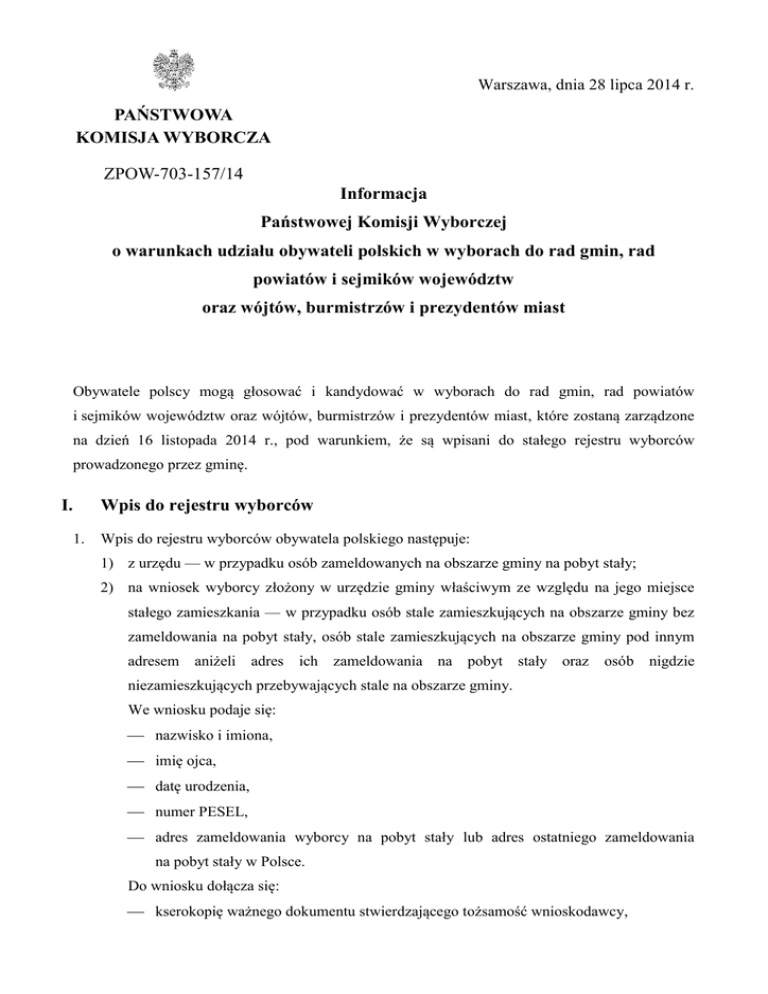 Warszawa, dnia 28 lipca 2014 r. PAŃSTWOWA KOMISJA WYBORCZA ZPOW-703-157/14 Informacja Państwowej Komisji Wyborczej o warunkach udziału obywateli polskich w wyborach do rad gmin, rad powiatów i sejmików województw oraz wójtów, burmistrzów i prezydentów miast Obywatele polscy mogą głosować i kandydować w wyborach do rad gmin, rad powiatów i sejmików województw oraz wójtów, burmistrzów i prezydentów miast, które zostaną zarządzone na dzień 16 listopada 2014 r., pod warunkiem, że są wpisani do stałego rejestru wyborców prowadzonego przez gminę. I. 1. Wpis do rejestru wyborców Wpis do rejestru wyborców obywatela polskiego następuje: 1) z urzędu — w przypadku osób zameldowanych na obszarze gminy na pobyt stały; 2) na wniosek wyborcy złożony w urzędzie gminy właściwym ze względu na jego miejsce stałego zamieszkania — w przypadku osób stale zamieszkujących na obszarze gminy bez zameldowania na pobyt stały, osób stale zamieszkujących na obszarze gminy pod innym adresem aniżeli adres ich zameldowania na pobyt stały oraz osób nigdzie niezamieszkujących przebywających stale na obszarze gminy. We wniosku podaje się: nazwisko i imiona, imię ojca, datę urodzenia, numer PESEL, adres zameldowania wyborcy na pobyt stały lub adres ostatniego zameldowania na pobyt stały w Polsce. Do wniosku dołącza się: kserokopię ważnego dokumentu stwierdzającego tożsamość wnioskodawcy, -2 pisemną deklarację, w której wnioskodawca podaje: 2. o swoje obywatelstwo, o adres stałego zamieszkania na terytorium Rzeczypospolitej Polskiej. Przepisy nie wskazują terminu, do którego najpóźniej wniosek o wpisanie do rejestru wyborców musi zostać złożony, aby wyborca mógł wziąć udział w wyborach. Jednakże należy mieć na uwadze, że wójt (burmistrz, prezydent miasta) ma 3 dni na rozpatrzenie wniosku. 3. Wzory wniosku o wpisanie do rejestru wyborców oraz pisemnej deklaracji załączanej do wniosku są dostępne w urzędach gmin oraz na stronie internetowej Państwowej Komisji Wyborczej www.pkw.gov.pl. II. Czynne prawo wyborcze (prawo wybierania) i bierne prawo wyborcze (prawo wybieralności) 1. Czynne prawo wyborcze, tj. prawo udziału w głosowaniu (prawo wybierania) w wyborach do rady gminy, rady powiatu i sejmiku województwa oraz wyborach wójta (burmistrza, prezydenta miasta) ma obywatel polski, który: najpóźniej w dniu głosowania kończy 18 lat, stale zamieszkuje na obszarze danej jednostki samorządu terytorialnego, nie został pozbawiony praw publicznych prawomocnym orzeczeniem sądu, nie został pozbawiony praw wyborczych prawomocnym orzeczeniem Trybunału Stanu, nie został ubezwłasnowolniony prawomocnym orzeczeniem sądu (art. 10 § 1 pkt 3 i 4 oraz § 2 Kodeksu wyborczego). Powyższe dotyczy również prawa udziału w głosowaniu w wyborach do rady dzielnicy m. st. Warszawy. Wyborca jest wpisywany do spisu wyborców. Można być wpisanym tylko do jednego spisu. 2. Bierne prawo wyborcze (prawo wybieralności) w wyborach do rady gminy, rady powiatu i sejmiku województwa ma obywatel polski mający prawo wybierania w wyborach do tej danej rady. Prawa wybieralności nie ma osoba: skazana prawomocnym wyrokiem na karę pozbawienia wolności za przestępstwo umyślne ścigane z oskarżenia publicznego lub umyślne przestępstwo skarbowe, W przypadku skazania prawomocnym wyrokiem na karę pozbawienia wolności za przestępstwo umyślne ścigane z oskarżenia publicznego lub umyślne przestępstwo skarbowe, osoby, wobec których zapadł taki wyrok nie mają biernego prawa wyborczego, -3tj. nie mogą kandydować w wyborach do organów jednostek samorządu terytorialnego w okresie, w którym są wpisane do ewidencji Krajowego Rejestru Karnego. wobec której wydano prawomocne orzeczenie sądu stwierdzające utratę prawa wybieralności w związku ze złożeniem niezgodnego z prawdą oświadczenia lustracyjnego (art. 11 § 1 pkt 5 i § 2 Kodeksu wyborczego). Powyższe dotyczy również prawa wybieralności w wyborach do rady dzielnicy m. st. Warszawy. 3. Bierne prawo wyborcze (prawo wybieralności) w wyborach wójta, burmistrza, prezydenta miasta ma obywatel polski mający prawo wybierania w wyborach do rad, który najpóźniej w dniu głosowania kończy 25 lat. Kandydat na wójta, burmistrza, prezydenta miasta nie musi stale zamieszkiwać na obszarze gminy, w której kandyduje. Prawa wybieralności nie ma osoba: skazana prawomocnym wyrokiem na karę pozbawienia wolności za przestępstwo umyślne ścigane z oskarżenia publicznego lub umyślne przestępstwo skarbowe, W przypadku skazania prawomocnym wyrokiem na karę pozbawienia wolności za przestępstwo umyślne ścigane z oskarżenia publicznego lub umyślne przestępstwo skarbowe, osoby, wobec których zapadł taki wyrok nie mają biernego prawa wyborczego, tj. nie mogą kandydować w wyborach do organów jednostek samorządu terytorialnego w okresie, w którym są wpisane do ewidencji Krajowego Rejestru Karnego. wobec której wydano prawomocne orzeczenie sądu stwierdzające utratę prawa wybieralności w związku ze złożeniem niezgodnego z prawdą oświadczenia lustracyjnego (art. 11 § 1 pkt 6 i § 2 Kodeksu wyborczego). III. Warunki udziału w głosowaniu Głosowanie w wyborach do rad gmin, rad powiatów i sejmików województw oraz w wyborach wójtów, burmistrzów i prezydentów miast odbywa się wyłącznie na terytorium Rzeczypospolitej Polskiej. Wyborcy głosują w obwodzie głosowania właściwym dla miejsca ich stałego zamieszkania, za wyjątkiem osób przebywających w szpitalach, domach pomocy społecznej, zakładach karnych i aresztach śledczych. Zaświadczeń o prawie do głosowania poza miejscem stałego zamieszkania nie wydaje się. -41. Głosowanie w miejscu stałego zamieszkania Wyborca zameldowany na pobyt stały na obszarze gminy, który nie złożył wniosku o wpisanie do stałego rejestru wyborców w innym miejscu oraz wyborca wpisany do rejestru wyborców na 