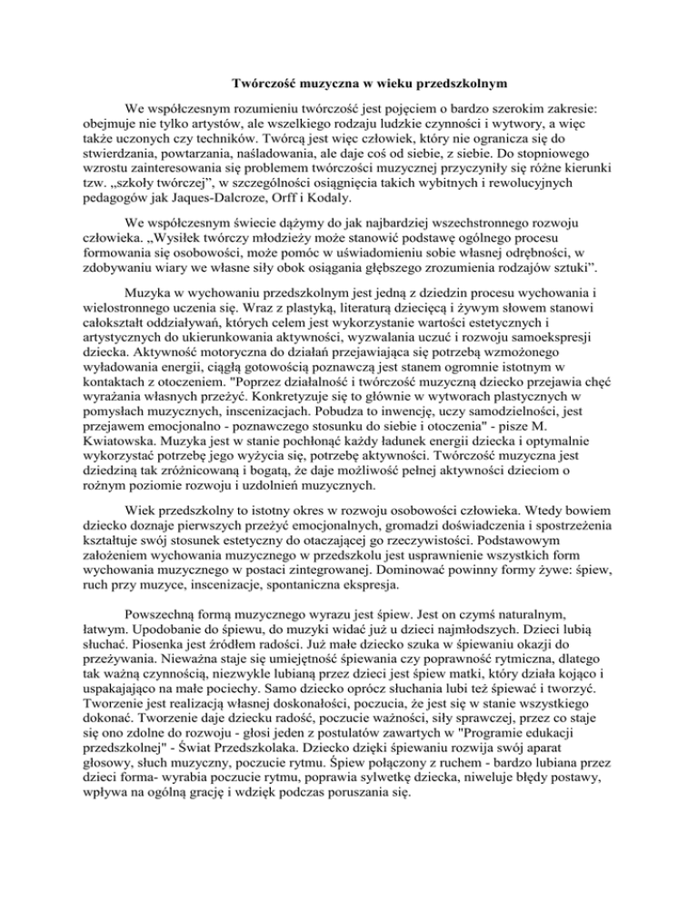 Twórczość muzyczna w wieku przedszkolnym We współczesnym rozumieniu twórczość jest pojęciem o bardzo szerokim zakresie: obejmuje nie tylko artystów, ale wszelkiego rodzaju ludzkie czynności i wytwory, a więc także uczonych czy techników. Twórcą jest więc człowiek, który nie ogranicza się do stwierdzania, powtarzania, naśladowania, ale daje coś od siebie, z siebie. Do stopniowego wzrostu zainteresowania się problemem twórczości muzycznej przyczyniły się różne kierunki tzw. „szkoły twórczej”, w szczególności osiągnięcia takich wybitnych i rewolucyjnych pedagogów jak Jaques-Dalcroze, Orff i Kodaly. We współczesnym świecie dążymy do jak najbardziej wszechstronnego rozwoju człowieka. „Wysiłek twórczy młodzieży może stanowić podstawę ogólnego procesu formowania się osobowości, może pomóc w uświadomieniu sobie własnej odrębności, w zdobywaniu wiary we własne siły obok osiągania głębszego zrozumienia rodzajów sztuki”. Muzyka w wychowaniu przedszkolnym jest jedną z dziedzin procesu wychowania i wielostronnego uczenia się. Wraz z plastyką, literaturą dziecięcą i żywym słowem stanowi całokształt oddziaływań, których celem jest wykorzystanie wartości estetycznych i artystycznych do ukierunkowania aktywności, wyzwalania uczuć i rozwoju samoekspresji dziecka. Aktywność motoryczna do działań przejawiająca się potrzebą wzmożonego wyładowania energii, ciągłą gotowością poznawczą jest stanem ogromnie istotnym w kontaktach z otoczeniem. "Poprzez działalność i twórczość muzyczną dziecko przejawia chęć wyrażania własnych przeżyć. Konkretyzuje się to głównie w wytworach plastycznych w pomysłach muzycznych, inscenizacjach. Pobudza to inwencję, uczy samodzielności, jest przejawem emocjonalno - poznawczego stosunku do siebie i otoczenia" - pisze M. Kwiatowska. Muzyka jest w stanie pochłonąć każdy ładunek energii dziecka i optymalnie wykorzystać potrzebę jego wyżycia się, potrzebę aktywności. Twórczość muzyczna jest dziedziną tak zróżnicowaną i bogatą, że daje możliwość pełnej aktywności dzieciom o rożnym poziomie rozwoju i uzdolnień muzycznych. Wiek przedszkolny to istotny okres w rozwoju osobowości człowieka. Wtedy bowiem dziecko doznaje pierwszych przeżyć emocjonalnych, gromadzi doświadczenia i spostrzeżenia kształtuje swój stosunek estetyczny do otaczającej go rzeczywistości. Podstawowym założeniem wychowania muzycznego w przedszkolu jest usprawnienie wszystkich form wychowania muzycznego w postaci zintegrowanej. Dominować powinny formy żywe: śpiew, ruch przy muzyce, inscenizacje, spontaniczna ekspresja. Powszechną formą muzycznego wyrazu jest śpiew. Jest on czymś naturalnym, łatwym. Upodobanie do śpiewu, do muzyki widać już u dzieci najmłodszych. Dzieci lubią słuchać. Piosenka jest źródłem radości. Już małe dziecko szuka w śpiewaniu okazji do przeżywania. Nieważna staje się umiejętność śpiewania czy poprawność rytmiczna, dlatego tak ważną czynnością, niezwykle lubianą przez dzieci jest śpiew matki, który działa kojąco i uspakajająco na małe pociechy. Samo dziecko oprócz słuchania lubi też śpiewać i tworzyć. Tworzenie jest realizacją własnej doskonałości, poczucia, że jest się w stanie wszystkiego dokonać. Tworzenie daje dziecku radość, poczucie ważności, siły sprawczej, przez co staje się ono zdolne do rozwoju - głosi jeden z postulatów zawartych w "Programie edukacji przedszkolnej" - Świat Przedszkolaka. Dziecko dzięki śpiewaniu rozwija swój aparat głosowy, słuch muzyczny, poczucie rytmu. Śpiew połączony z ruchem - bardzo lubiana przez dzieci forma- wyrabia poczucie rytmu, poprawia sylwetkę dziecka, niweluje błędy postawy, wpływa na ogólną grację i wdzięk podczas poruszania się. Piosenka, muzyka i rytm rozbudzają u dziecka wrażliwość i muzyczną kulturę. Kontakt z muzyką rozwija też wrażliwość emocjonalną. Charakter słuchanego utworu i muzyki można odczytać z wyrazu twarzy, z mimiki dziecka. Odpowiednio dobrana wprowadza w pogodny i radosny nastrój, działa kojąco na układ nerwowy. Zajęcia umuzykalniające mogą też być okazją do rozwijania twórczości dziecka, korzystnie wpływają na kształtowanie twórczej postawy. Dziecko charakteryzuje naturalna wrażliwość na muzykę. "Poprzez muzykę dzieci kształcą swoje zdolności, zainteresowania, uczą się prostych operacji myślowych takich jak: porównywanie, analiza, abstrahowanie. Muzyka uczy oznajmiać i komunikować swoje myśli i doświadczenia", wycisza nadmierne emocje negatywne, pobudza pozytywne. Spontaniczna ekspresja jest ważnym elementem twórczości muzycznej. "Bodźcem inspirującym może być piosenka, obrazek, byleby tylko pobudzona została pomysłowość dziecka. Wszelkie samodzielne pomysły dziecka związane z muzyką, niezależnie od materiału użytego przez dziecko będą spontaniczną twórczością dziecięcą". "Radość dostarczana dzieciom przez muzykę jest wielostronna; wynika przede wszystkim z czynnego jej uprawiania; jest to zadowolenie wywołane własną aktywnościąwyładowaniem nagromadzonej energii, samorealizacją, satysfakcją działania i tworzenia wylicza M. Przychodzińska-Kaciszak. Do grona funkcji jakie spełnia muzyka we wszechstronnym rozwoju osobowości dziecka (poznawcza, kształcąca, wychowawcza) zaliczyć też trzeba funkcję terapeutyczno-kompensacyjną". "Muzyka stwarza dzieciom możliwość artystycznego wyżycia się, kompensowania braków w zakresie zaspakajania potrzeb ekspresyjnych, podniesienia poczucia własnej wartości i uznania". Muzyka uczy słuchać i słyszeć, angażuje wysiłek w celu poznania aktywnego, a poprzez słuch - najbogatszy ze wszystkich bodźców zmysłowych, kontaktuje się ze światem zamieszkałym przez melodię, dźwięki, które wychowują ludzi. Dźwięki przenikają do świata wewnętrznego, zwłaszcza u mał
