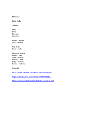 Wrzesień Hello Hello Słówka: I am… Hello Bye, bye Goodbye Happy - wesoły Sad – smutny Big - duży Small - mały Mummy - mama Daddy - tata Sister - siostra Brother - brat Baby – dziecko Family – rodzina Piosenki: https://www.youtube.com/watch?v=ajKQ1MdLxF0 https://www.youtube.com/watch?v=SBhhJi0QdTU https://www.youtube.com/watch?v=LFrKYjrIDs8