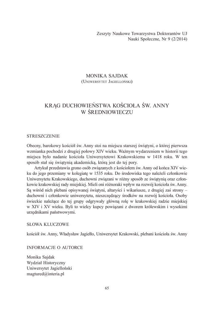 Zeszyty Naukowe Towarzystwa Doktorantów UJ Nauki Społeczne, Nr 9 (2/2014) MONIKA SAJDAK (Uniwersytet Jagielloński) KRĄG DUCHOWIEŃSTWA KOŚCIOŁA ŚW. ANNY W ŚREDNIOWIECZU STRESZCZENIE Obecny, barokowy kościół św. Anny stoi na miejscu starszej świątyni, o której pierwsza wzmianka pochodzi z drugiej połowy XIV wieku. Ważnym wydarzeniem w historii tego miejsca było nadanie kościoła Uniwersytetowi Krakowskiemu w 1418 roku. W ten sposób stał się świątynią akademicką, którą jest do tej pory. Artykuł przedstawia grono osób związanych z kościołem św. Anny od końca XIV wieku do jego przemiany w kolegiatę w 1535 roku. Do środowiska tego należeli członkowie Uniwersytetu Krakowskiego, duchowni związani w różny sposób ze świątynią oraz członkowie krakowskiej rady miejskiej. Mieli oni różnoraki wpływ na rozwój kościoła św. Anny. Są wśród nich plebani opisywanej świątyni, altaryści i wikariusze, z drugiej zaś strony – duchowni i członkowie uniwersytetu, nieszczędzący środków na rozwój kościoła. Osoby świeckie należące do tej grupy odgrywały główną rolę w krakowskiej radzie miejskiej w XIV i XV wieku. Byli to wielcy kupcy powiązani z dworem królewskim i wysokimi urzędnikami państwowymi. SŁOWA KLUCZOWE kościół św. Anny, Władysław Jagiełło, Uniwersytet Krakowski, plebani kościoła św. Anny INFORMACJE O AUTORCE Monika Sajdak Wydział Historyczny Uniwersytet Jagielloński [email protected] 65 Monika Sajdak Obecny, barokowy gmach kościoła św. Anny stoi mniej więcej na miejscu starszej, gotyckiej świątyni, której opis znajduje się w wydanym na początku XVII wieku anonimowym Przewodniku abo kościołów krakowskich krótkim opisaniu…1 oraz późniejszym dziele autorstwa Piotra Hiacynta Pruszcza Stołecznego miasta Krakowa kościoły i klejnoty…2. W 1689 roku rozpoczęła się rozbiórka starej świątyni i przygotowanie miejsca pod nowy, bardziej okazały i imponujący budynek. Tym samym skończył się ważny etap w historii zarówno kościoła św. Anny, jak i Uniwersytetu Krakowskiego. Niedługo potem Andrzej Stanisław Buchowski napisał monografię Gloria Domini, super templum s. suum…3, w której znalazło się miejsce na krótką informację o poprzednim kościele. Z opracowań uwzględniających czasy istnienia dawnej świątyni wydano jeszcze: Wiadomości historyczne… Ludwika Kosickiego (1833)4, Kościół akademicki św. Anny… Juliana Bukowskiego (1900)5, prepozyta omawianego kościoła, Krótką wiadomość historyczno-artystyczną… tegoż autora (1903). W 1935 roku Henryk Barycz napisał Z dziejów kościoła św. Anny...6. Liczne odniesienia do starej świątyni znajdują się w książce Władysława Gasidły Wokół konfesji św. Jana z Kęt…7; istotne dla poruszanego tematu są również niektóre artykuły z publikacji zbiorowej Studia z dziejów kościoła św. Anny …8, a zwłaszcza prace Elżbiety Piwowarczyk Legaty testamentowe na kościół św. Anny (1400–1530)… oraz Andrzeja Włodarka Grób i nagrobek św. Jana Kantego... Praca Ewy Piwowarczyk powstała na bazie ksiąg przechowywanych w Archiwum Państwowym w Krakowie: Liber Testamentorum, Consularia Cracoviensia i Scabinalia Cracoviensia. Autorka zebrała testamenty Przewodnik abo kościołów krakowskich krótkie opisanie z widokami Krakowa, którego już nie ma, Kraków 2000, s. 85–86. 2 P. H. Pruszcz, Stołecznego miasta Krakowa kościoły i klejnoty, co w nich jest widzenia godnego i zacnego krótko opisane przez Piotra Pruszcza Sczepana, Kraków 1647. 3 A. S. Buchowski, Gloria Domini, super templum s. suum, ad solennes Encaenior primitias Ecclesiae Collegiatae Crac. S. Annae ope Divinae Providentiae recenter à fundamentis erectae, relucens: et posteris brevibus literarum modulis, M. Andreae Buchowski, ejusdem ecclesiae S. Annae, Canonici, enarrata. Die 21. Octobris. Anno Domini 1703, Kraków 1703. 4 L. Kosicki, Wiadomości historyczne o kościele akademickim św. Anny w Krakowie, Kraków 1833. 5 J. Bukowski, Kościół akademicki św. Anny. Monografia historyczna, Kraków 1900. 6 H. Barycz, Z dziejów kościoła św. Anny w Krakowie, Kraków 1935. 7 W. Gasidło, Wokół konfesji św. Jana z Kęt w kolegiacie św. Anny w Krakowie, Kraków 2003. 8 Studia z dziejów kościoła św. Anny w Krakowie, red. Z. Kliś i T. Węcławowicz, Kraków 2009. 1 66 Krąg duchowieństwa kościoła św. Anny w średniowieczu mieszczan krakowskich, a w nich także te, które zawierały zapisy na rzecz kościoła św. Anny. Szereg wzmianek o opisywanej świątyni znajdziemy w obszernej literaturze poświęconej pochowanemu w kościele św. Anny świętemu Janowi z Kęt. Publikacje te zebrał Roman Maria Zawadzki9. Interesujące informacje zawierają także opracowania dotyczące historii Uniwersytetu Jagiellońskiego10. Biogramy duchownych, niektórych plebanów, prałatów i kanoników kościoła św. Anny znajdują się w Słowniku polskich teologów katolickich11oraz w książce Mieczysława Markowskiego na temat Wydziału Teologicznego Uniwersytetu Krakowskiego12, a także w Słowniku historii i tradycji Uniwersytetu Jagiellońskiego Janusza Sondla13. Temat ten poruszał ponadto Jan Nepomucen Fijałek14. Należy także przypomnieć literaturę poświęconą średniowiecznemu szkolnictwu, w której znajdują się informacje o szkole parafialnej przy kościele św. Anny oraz jej nauczycielach. Chodzi przede wszystkim o monumentalne dzieło Antoniego Karbowiaka15, a także o nowsze prace Jana Krukowskiego16. W niniejszym artykule podjęto próbę przedstawienia w zarysie grupy ludzi skupionych wokół kościoła św. Anny od końca XIV wieku do czasów utworzenia kolegiaty w 1535 roku. Był to okres interesujący pod względem zachodzących zmian. Warto wspomnieć choćby o nadaniu kościoła św. Anny Uniwersytetowi Krakowskiemu. Grono osób związanych z kościołem obejmowało jego gospodarzy, którzy posiadali w źródłach t