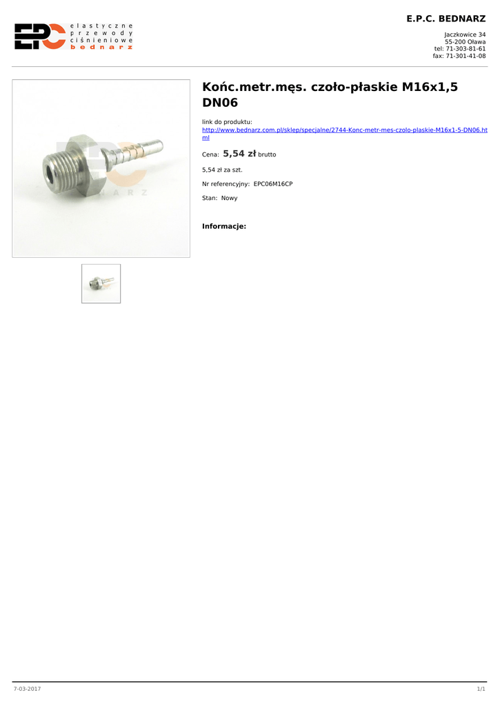 E.P.C. BEDNARZ Jaczkowice 34 55-200 Oława tel: 71-303-81-61 fax: 71-301-41-08 Końc.metr.męs. czoło-płaskie M16x1,5 DN06 link do produktu: http://www.bednarz.com.pl/sklep/specjalne/2744-Konc-metr-mes-czolo-plaskie-M16x1-5-DN06.ht ml Cena: 5,54 zł brutto 5,54 zł za szt. Nr referencyjny: EPC06M16CP Stan: Nowy Informacje: 7-03-2017 1/1