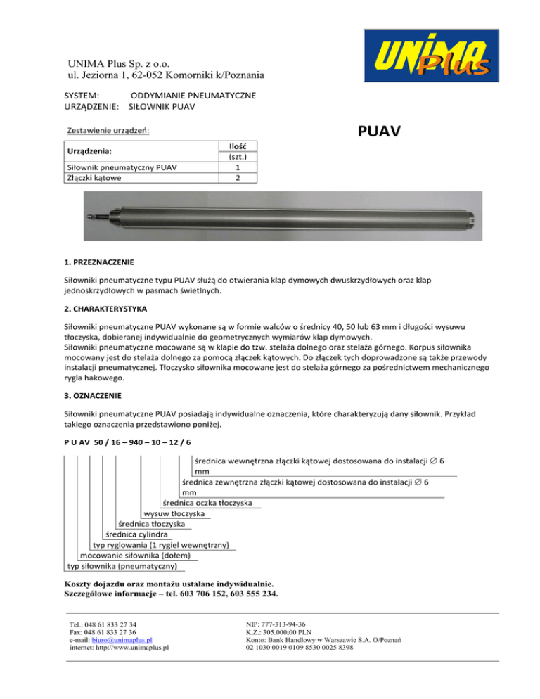 Plus UNIMA Plus Sp. z o.o. ul. Jeziorna 1, 62-052 Komorniki k/Poznania SYSTEM: ODDYMIANIE PNEUMATYCZNE URZĄDZENIE: SIŁOWNIK PUAV PUAV Zestawienie urządzeń: Urządzenia: Siłownik pneumatyczny PUAV Złączki kątowe Ilość (szt.) 1 2 1. PRZEZNACZENIE Siłowniki pneumatyczne typu PUAV służą do otwierania klap dymowych dwuskrzydłowych oraz klap jednoskrzydłowych w pasmach świetlnych. 2. CHARAKTERYSTYKA Siłowniki pneumatyczne PUAV wykonane są w formie walców o średnicy 40, 50 lub 63 mm i długości wysuwu tłoczyska, dobieranej indywidualnie do geometrycznych wymiarów klap dymowych. Siłowniki pneumatyczne mocowane są w klapie do tzw. stelaża dolnego oraz stelaża górnego. Korpus siłownika mocowany jest do stelaża dolnego za pomocą złączek kątowych. Do złączek tych doprowadzone są także przewody instalacji pneumatycznej. Tłoczysko siłownika mocowane jest do stelaża górnego za pośrednictwem mechanicznego rygla hakowego. 3. OZNACZENIE Siłowniki pneumatyczne PUAV posiadają indywidualne oznaczenia, które charakteryzują dany siłownik. Przykład takiego oznaczenia przedstawiono poniżej. P U AV 50 / 16 – 940 – 10 – 12 / 6 średnica wewnętrzna złączki kątowej dostosowana do instalacji ∅ 6 mm średnica zewnętrzna złączki kątowej dostosowana do instalacji ∅ 6 mm średnica oczka tłoczyska wysuw tłoczyska średnica tłoczyska średnica cylindra typ ryglowania (1 rygiel wewnętrzny) mocowanie siłownika (dołem) typ siłownika (pneumatyczny) Koszty dojazdu oraz montażu ustalane indywidualnie. Szczegółowe informacje – tel. 603 706 152, 603 555 234. Tel.: 048 61 833 27 34 Fax: 048 61 833 27 36 e-mail: [email protected] internet: http://www.unimaplus.pl NIP: 777-313-94-36 K.Z.: 305.000,00 PLN Konto: Bank Handlowy w Warszawie S.A. O/Poznań 02 1030 0019 0109 8530 0025 8398