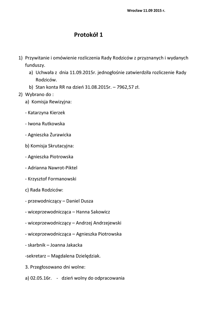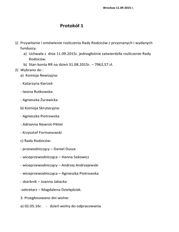 Wrocław 11.09 2015 r. Protokół 1 1) Przywitanie i omówienie rozliczenia Rady Rodziców z przyznanych i wydanych funduszy. a) Uchwała z dnia 11.09.2015r. jednogłośnie zatwierdziła rozliczenie Rady Rodziców. b) Stan konta RR na dzień 31.08.2015r. – 7962,57 zł. 2) Wybrano do : a) Komisja Rewizyjna: - Katarzyna Kierzek - Iwona Rutkowska - Agnieszka Żurawicka b) Komisja Skrutacyjna: - Agnieszka Piotrowska - Adrianna Nawrot-Piktel - Krzysztof Formanowski c) Rada Rodziców: - przewodniczący – Daniel Dusza - wiceprzewodnicząca – Hanna Sakowicz - wiceprzewodniczący – Andrzej Andrzejewski - wiceprzewodnicząca – Agnieszka Piotrowska - skarbnik – Joanna Jakacka -sekretarz – Magdalena Dzielędziak. 3. Przegłosowano dni wolne: a) 02.05.16r. - dzień wolny do odpracowania b)27.05.2016r. - do szkoły 4.Kolejne terminy zebrań RR: a) 27.10.2015r. b) 01.12.2015r. c) 23.02.2016r. d) 26.04.2016r. e)31.05.2016r. 5. Przeprowadzono głosowanie na temat podniesienia składki na Radę Rodziców do kwoty 40 zł. Uprawnionych do głosowania 19 osób – większością głosów zatwierdzono podwyższenie składki . 6. Rozmowa na temat boiska szkolnego . Osoby oddelegowane do prowadzenia działań z ramienia Rady Rodziców to: Zofia Gnacek i Andrzej Andrzejewski. 7.Dyskusja na temat ubezpieczenia w szkole. Utworzenie komisji decydującej o zwolnieniu dziecka z ubezpieczenia po złożeniu wniosku przez rodzica/opiekuna do 20.09.2015r. Skład komisji: - przewodniczący Rady Rodziców Daniel Dusza - pedagog szkolny Violetta Orska - Hanna Sakowicz - Katarzyna Araszkiewicz. Sekretarz Magdalena Dzielędziak