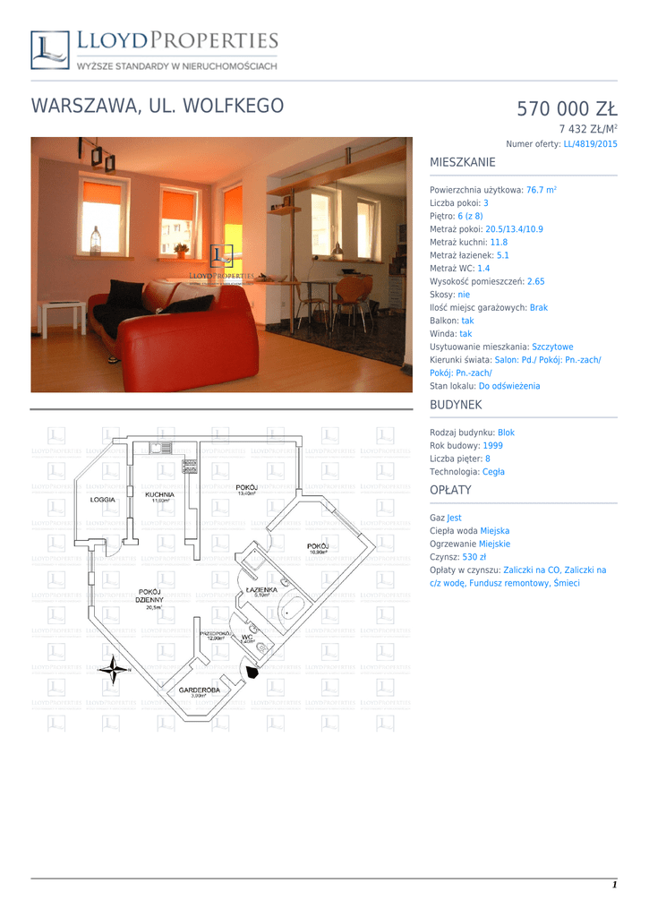 WARSZAWA, UL. WOLFKEGO 570 000 ZŁ 7 432 ZŁ/M2 Numer oferty: LL/4819/2015 MIESZKANIE Powierzchnia użytkowa: 76.7 m2 Liczba pokoi: 3 Piętro: 6 (z 8) Metraż pokoi: 20.5/13.4/10.9 Metraż kuchni: 11.8 Metraż łazienek: 5.1 Metraż WC: 1.4 Wysokość pomieszczeń: 2.65 Skosy: nie Ilość miejsc garażowych: Brak Balkon: tak Winda: tak Usytuowanie mieszkania: Szczytowe Kierunki świata: Salon: Pd./ Pokój: Pn.-zach/ Pokój: Pn.-zach/ Stan lokalu: Do odświeżenia BUDYNEK Rodzaj budynku: Blok Rok budowy: 1999 Liczba pięter: 8 Technologia: Cegła OPŁATY Gaz Jest Ciepła woda Miejska Ogrzewanie Miejskie Czynsz: 530 zł Opłaty w czynszu: Zaliczki na CO, Zaliczki na c/z wodę, Fundusz remontowy, Śmieci 1 OPIS Zapraszam do zapoznania się z ofertą sprzedaży słonecznego mieszkania na Bemowie. Mieszkanie mierzy 76,7m2 i składa się z pokoju dziennego (20,5m2), z którego prowadzi wejście do oddzielnej otwartej na pokój kuchni (11,60m2) oraz sporej loggi (8m2). Część dzienna wraz z kuchnią skierowana jest na południe. Z przedpokoju jest wejście do garderoby (3m2),wc (1,40m2), łazienki (5,10m2), części dziennej i dwóch sypialni (13,40m2 oraz 10,90m2). Mieszkanie jest w dobrym stanie, jednak nowi właściciele powinni odświeżyć pomieszczenia. Istnieje możliwość nowej aranżacji kuchni oraz większej sypialni. Czynsz na wynosi 530 zł miesięcznie wraz z zaliczkami za wodę oraz CO. Mieszkanie znajduje się na 6 PIĘTRZE ośmiopiętrowego budynku z 1999 roku. Klatka jest przestronna z windą. W obrębie budynku znajduje się teren zielony wraz z placem zabaw, boiskiem wraz z bieżnią oraz basenem krytym. Do budynku przynależy podziemne miejsce garażowe, które można dokupić. W pobliżu mieszkania znajduje się rozwinięta sieć komunikacji miejskiej, łącząca Bemowo z pobliskim Żoliborzem, Bielanami oraz Wolą i Centrum do którego dojazd zajmuje około 30 minut. Pobliskie Centrum Handlowe Bemowo wraz z kompleksami rozrywkowo-kinowymi oraz pobliska sieć sklepów osiedlowych sprzyjają komfortowi robienia zakupów oraz odpoczynku. W pobliżu osiedla znajdują szkoły oraz przedszkola. 2