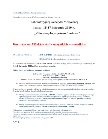 Oddział Kształcenia Podyplomowego Uprzejmie informuje, iż planowany jest kurs z zakresu: Laboratoryjnej Genetyki Medycznej w terminie 15-17 listopada 2010 r. „Diagnostyka przedurodzeniowa” Koszt kursu: 335zł koszt dla wszystkich uczestników SYMBOLE KURSU: GP-8 V/1/2010 -dla specjalizacji podstawowej GU-8V/1/2010 -dla specjalizacji uzupełniającej Po ukazaniu się informacji o kosztach kursu dowody wpłaty należy dostarczyć najpóźniej do dnia 2 listopada 2010r. (faxem, mailem, pocztą) Opłaty winny być wpłacane wyłącznie na konto: Uniwersytet Medyczny, Al. Kościuszki 4, 90-419 Łódź, ING BANK ŚLĄSKI ŁÓDŹ 31 1050 1461 1000 0022 9084 1481, KONIECZNIE : w rubryce tytułem należy podać symbol kursu oraz dopisek 708-04- 078 Prosimy o dokładne i czytelne wypełnienie formularza, włącznie z aktualnym numerem telefonu, datą i podpisem – umożliwi to szybkie przekazanie informacji w przypadku wszelkich zmian. W przypadku rezygnacji z udziału w szkoleniu prosimy o niezwłoczne zawiadomienie o tym pracowników Sekretariatu Oddziału Kształcenia Podyplomowego. Osoby zainteresowane otrzymaniem FAKTURY wystawionej przez UM dla podmiotu gospodarczego opłacającego szkolenie powinny wypełnić druk przelewu/ wpłaty gotówkowej podając w rubryce nazwa zleceniodawcy- nazwę i adres podmiotu gospodarczego, a w rubryce tytułem dodatkowo obok w/w : nazwisko i imię kursanta. Osoby fizyczne wypełniają druk podając swoje dane, a jeśli chcą otrzymać fakturę w rubryce tytułem obok symbolu kursu i dopisku 708-04- 078 zamieszczają dopisek Faktura. Podstawą do wystawienia faktury jest druk wpłaty (nie formularz zgłoszeniowy). Prawidłowo wypełniony druk wpłaty powinien zawierać wszystkie powyżej podane dane. Nazwa wpisanego podmiotu gospodarczego na druku wpłaty musi być zgodna z danymi na formularzu zgłoszenia. Na druku wpłaty nie ma konieczności wpisywania NIP. PLAN ↓ Moduł V „Genetyka kliniczna” Kurs specjalizacyjny w ramach specjalizacji z laboratoryjnej genetyki medycznej: „Diagnostyka przedurodzeniowa” GP-8V/1/2010; GU-8V/1/2010 Łódź, 15-17 listopada 2010 r. 24 h + 1 h zaliczenie kursu Zajęcia w Instytucie Centrum Zdrowia Matki Polki w Łodzi 93-338 Łódź, ul. Rzgowska 281/289, Budynek A, Poziom 1 15 listopada 2010 - aula dr hab. n. med. Lucjusz Jakubowski, Z-d Genetyki I CZMP, prof. nadzw. UM w Łodzi 9.00-9.45 Rozwój i przyszłośd diagnostyki przedurodzeniowej. Program badao prenatalnych w Polsce. (wykład) 1 godz. dr n. med. Lech Dudarewicz, Z-d Genetyki I CZMP Nieinwazyjne badania przesiewowe w I i II trymestrze ciąży. 9.45-10.30 Zasady kalkulacji ryzyka wystąpienia wybranych typów chorób i aberracji chromosomowych. (wykład) 1 godz. 10.3010.40 10 min. przerwa dr n. med. Wojciech Ałaszewski, Z-d Genetyki I CZMP 10.4011.25 Wskazania do inwazyjnej diagnostyki przedurodzeniowej. (wykład) 1 godz. 11.2512.10 Inwazyjne badania prenatalne: biopsja kosmówki, amniopunkcja, kordocenteza. (wykład) 1 godz. 12.1012.55 przerwa 45 min. mgr Magdalena Kozłowska, Z-d Genetyki I CZMP 12.5513.40 13.4014.25 Fizjopatologia płynu owodniowego. (wykład) 1 godz. Hodowle komórkowe w diagnostyce przedurodzeniowej. 1 godz. (wykład) 14.2514.35 przerwa 10 min. mgr Wanda Hawuła, Z-d Genetyki I CZMP 14.3515.20 Algorytm postępowania diagnostycznego w przypadkach strukturalnych aberracji chromosomowych. (wykład) 1 godz. 15.2016.05 Trudności metodologiczne i interpretacyjne w przedurodzeniowej diagnostyce cytogenetycznej płodu. (wykład) 1 godz. 16 listopada - wykłady: sala dydaktyczna 1, warsztaty: Zakład Genetyki mgr Wanda Hawuła, Z-d Genetyki I CZMP 8.00-9.30 Techniki o wysokiej rozdzielczości w przedurodzeniowych badaniach genomowego DNA płodu. (wykład) 2 godz. 9.30-9.40 przerwa 10 min. dr n. przyr. Anna Jeziorowska, Z-d Genetyki I CZMP Badania biochemiczne w surowicy krwi kobiety ciężarnej 9.40-10.25 oraz w płynie owodniowym pod kątem wybranych typów wad rozwojowych płodu. (wykład) 10.2511.10 Znaczenie badao molekularnych w diagnostyce wad płodu. (wykład) 1 godz. 1 godz. mgr Anna Krzymioska, Z-d Genetyki I CZMP 11.1011.55 Szybkie testy molekularne w kierunku aneuploidii u płodu. Zalety i wady. (wykład) 1 godz. 11.5512.45 przerwa 50 min. Zapoznanie się z procedurami - zajęcia warsztatowe w 4 blokach: blok I mgr Wanda Hawuła, Z-d Genetyki I CZMP blok II mgr Anna Ulaoska, Z-d Genetyki I CZMP blok III mgr Magdalena Kozłowska, Z-d Genetyki I CZMP blok IV dr A. Jeziorowska Z-d Genetyki I CZMP 4 godz. blok I 12.4515.45 Technika FISH-detekcja aneuploidii w niehodowanych amniocytach.- cz I, metodologia (po 1 godz. dla każdej z grup) 4 godz. blok II 12.4515.45 Technika FISH-detekcja aneuploidii w niehodowanych amniocytach - cz. II, ocena mikroskopowa (po 1 godz. dla każdej z grup) 4 godz. 12.4515.45 blok III Zakładanie hodowli komórek płynu owodniowego (po 1 godz. dla każdej z grup) 4 godz. blok IV 12.4515.45 Badanie biochemiczne próbek płynu owodniowego w kierunku obecności acetylocholinoesterazy (AChE). (po 1 godz. dla każdej z grup) 17 listopada 2010 - wykłady: sala dydaktyczna 1 dr n. med. L. Dudarewicz, Z-d Genetyki I CZMP 8.00-8.45 Prenatalne badania obrazowe. (wykład) 1 godz. Ocena fenotypu płodu jako narzędzie w skriningu 8.45-9.30 przedurodzeniowym i diagnostyce prenatalnej. Dysmorfologia w ujęciu prenatalnym. (wykład) 1 godz. 9.30-9.40 10 min przerwa prof. dr hab. n. med. Maria Respondek-Liberska, Zakład Diagnostyki i Nadzoru Wad Wrodzonych ICZMP 9.40-10.25 Echokardiografia płodowa jako narzędzie oceny fenotypu płodu. (wykład) 1 godz. dr n. med. L. Dudarewicz, Z-d Genetyki I CZMP 10.2510.35 Terapia przedurodzeniowa płodu. (wykład) 1 godz. 10.3510.50 przerwa 15 min. mgr Joanna Witkowska, „Novum” Warszawa 10.5012.20 Diagnostyka prekoncepcyjna i preinplantacyjna (wykład) 2 godz. 12.2013.00 przerwa 40 min. dr hab. n. med. Lucjusz Jakubowski, Z-d Genetyki I CZMP, prof. nadzw. UM w Łodzi 13.0013