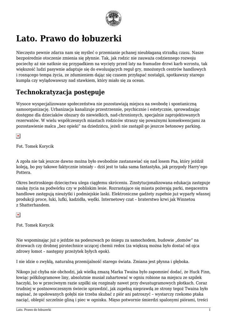 Lato. Prawo do łobuzerki Nieczęsto pewnie zdarza nam się myśleć o przemianie pchanej nieubłaganą strzałką czasu. Nasze bezpośrednie otoczenie zmienia się płynnie. Tak, jak rodzic nie zauważa codziennego rozwoju pociechy aż nie natknie się przypadkiem na wycięty przed laty na framudze drzwi karb wzrostu, tak większość ludzi pasywnie adaptuje się do ewoluujących reguł gry, mnożonych centrów handlowych i rosnącego tempa życia, ze zdumieniem dając się czasem przyłapać nostalgii, spotkawszy starego kumpla czy wylądowawszy nad stawkiem, który miało się za ocean. Technokratyzacja postępuje Wysoce wyspecjalizowane społeczeństwa nie pozostawiają miejsca na swobodę i spontaniczną samoorganizację. Urbanizacja kanalizuje przestrzennie, psychicznie i estetycznie, sprowadzając dostępne dla dzieciaków obszary do niewielkich, nad-chronionych, specjalnie zaprojektowanych rezerwatów. W wielu współczesnych miastach rodziców straszy się poważnymi konsekwencjami za pozostawienie malca „bez opieki” na dziedzińcu, jeżeli nie zastąpił go jeszcze betonowy parking. Fot. Tomek Korycik A zgoła nie tak jeszcze dawno można było swobodnie zastanawiać się nad losem Psa, który jeździł koleją, bo psy takowe faktycznie istniały – dziś jest to taka sama fantastyka, jak przygody Harry’ego Pottera. Okres beztroskiego dziecięctwa ulega ciągłemu skróceniu. Zinstytucjonalizowana edukacja zastępuje naukę życia na podwórku czy w pobliskim lesie. Rozrastające się miasta pożerają parki, megacentra handlowe zastępują nieużytki i podmiejskie laski. Elektroniczne gadżety zupełnie już wyparły własnej produkcji proce, łuki, lufki, kadzidła, wędki. Internetowy czat – braterstwo krwi jak Winnetou z Shatterhandem. Fot. Tomek Korycik Nie wspominając już o jeździe na podeszwach po śniegu za samochodem, budowie „domów” na drzewach czy drobnej pirotechnice uczącej chemii redox (za większą można było dostać od ojca zdrowy łomot – następny przeżytek byłych epok). I nie idzie o zwykłą, naturalną przemijalność starego świata. Zmiana jest płynna i głęboka. Nikogo już chyba nie obchodzi, jak wielką zmazą Marka Twaina było zapomnieć dodać, że Huck Finn, łowiąc półkilogramowe liny, absolutnie musiał zahartować w ogniu robione na miejscu ze szpilek haczyki, bo w przeciwnym razie szpilki się rozginały nawet przy dwustugramowych płotkach. Coraz trudniej w postnowoczesnym świecie sprawdzić, jak zupełną nieprawdą ze strony tegoż Twaina było napisać, że upolowanych gołębi nie trzeba skubać z piór ani patroszyć – wystarczy rzekomo ptaka naciąć, oblepić szczelnie gliną i piec w ognisku. Mięso potwornie śmierdzi spalonymi piórami, treści Lato. Prawo do łobuzerki 1 jelit oblepiają wszystko, a wiara w rzetelną literaturę tonie w pobliskim stawku. Tylko ta dziewczynka z sąsiedztwa tak podobna do Becky Thatcher. Znika Ziemia Niczyja, to dziewicze Nieznane, które, na wyprawie, o jakiej, jak nam się zdaje, nic nie wiedzą rodzice, można odkryć i wziąć w posiadanie, postawić dyskretny szałas i bronić kumplowsko tajemnicy przed konkurentami i dorosłymi – bo miewają świętokradcze, wielkoskalowe i niszczycielskie pomysły. Nasze pociechy „muszą” być coraz to bardziej konkurencyjne na przyszłych rynkach pracy i płacą za to amputacją części fantazji i dzieciństwa. Fot. Tomek Korycik Kilka lat temu z przerażeniem dowiedziałem się, że żyjący w Tokio znajomi zostawiają pięcioletniego syna w szkoło-przedszkolu na dwie doby i trzy razy po dziesięć godzin w tygodniu i że wielu japońskich rodziców zostawia tak dzieci na całe pięć dni. Znajomi byli zdumieni moim niedowierzaniem, tłumacząc, że przecież powierzają dziecko specjalistom, dzięki czemu jego czas jest optymalnie wykorzystywany na naukę i gry edukacyjne, a prawie wszystkie weekendy są razem. Jeżeli w sobotę udają się wspólnie do centrów handlowych, a w niedzielę odpoczywają w domu, to ten młody człowiek prawdopodobnie nie był jeszcze na świeżym powietrzu poza przestrzenią zurbanizowaną. Ku naiwnej uciesze rodziców, prawdopodobnie nigdy nie oparzył się, nie rozbił kolana, nie ubabrał w błocie. I nie próbował być ani Piratem, ani Piotrusiem Panem. Opowiadana czy czytana dziecku historia niewątpliwie musi być przygodą. Ale i podawać w wątpliwość normy świata dorosłych, indukować ten cudowny mechanizm pozwalający późniejszej młodzieży na bunt, który w kilku istotnych przypadkach zakwitnie dojrzałą postawą w wieku dorosłym – dystansem do narzuconych, nieprawdziwych autorytetów, aksjomatycznych prawd, a przede wszystkim do samego siebie. Kto wie, czy idąc tym tropem, genialna krnąbrność Pippi Langstrump i jej stawianie wszystkiego do góry nogami nie przygotowały pojęciowego gruntu pod wydarzenia z maja ’68 i powstanie późniejszych ruchów demokratycznych. Tak czy owak, nie przypadkiem postać rudego piegusa weszła na stałe do ikonografii dojrzałej kontestacji. Astrid Lindgren obaliła zresztą więcej mitów kulturowych kalkowanych na świat dzieci, a Pippi nie jest jej jedynym dziewczyńskim łobuzem. Zachwycająca historia Ronji, córki zbójnika, pełna jest zderzeń płaskiego, stereotypowego pojmowania rzeczy przez dorosłych i dosłownego, świeżego, rozbrajająco prawdziwego pojmowania tychże rzeczy przez młodego człowieka. Pewnego dnia ojciec Mattis, wychodząc do pracy, przykazuje Ronji absolutnie uważać na skaliste urwisko nad rzeką, na co Ronja ochoczo przystaje. Wracając lasem, widzi jak córka podśpiewując skacze z jednej półki skalnej na drugą i następną. Przerażony, łapie córkę i robi jej gorzki wyrzut, że ani trochę nie wzięła do serca jego uwag i bawi się na krawędzi niebezpiecznego urwiska, na które miała uważać. W odpowiedzi słyszy od przerażonej jego gwałtowną reakcją Ronii, że właśnie wyk