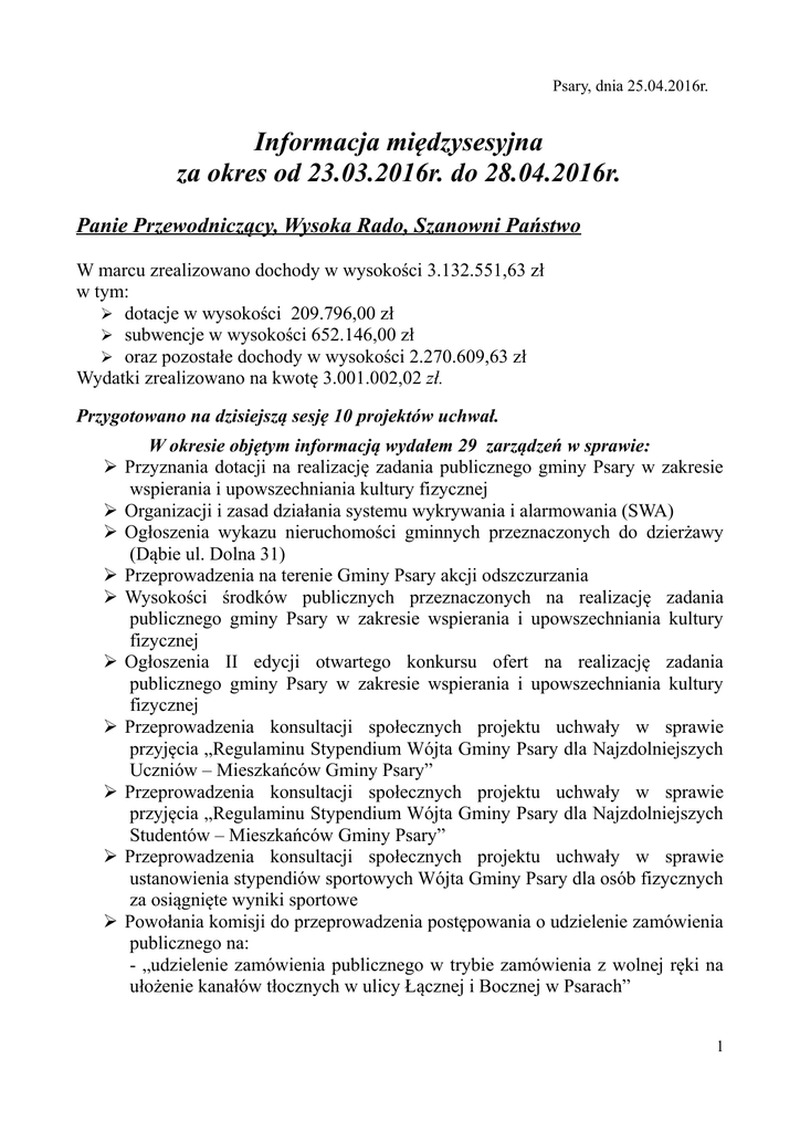 Informacja międzysesyjna za okres od 23.03.2016r. do 28.04.2016r.