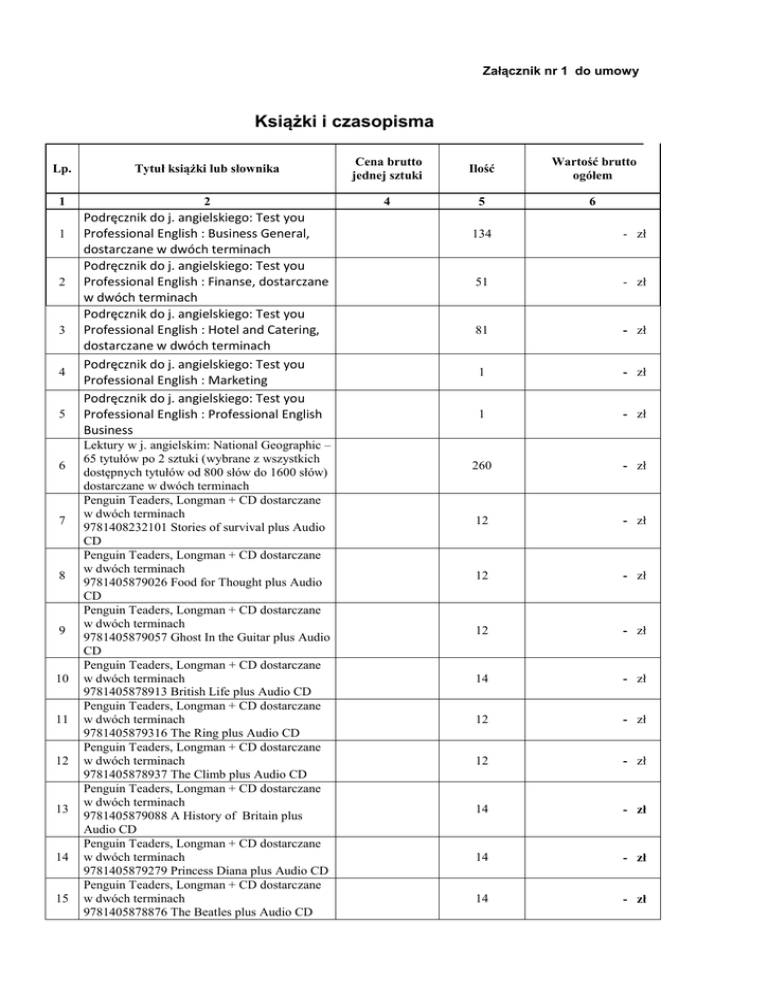 Załącznik nr 1 do umowy Książki i czasopisma Lp. Tytuł książki lub słownika Cena brutto jednej sztuki Ilość Wartość brutto ogółem 1 2 4 5 6 1 2 3 4 5 6 7 8 9 10 11 12 13 14 15 Podręcznik do j. angielskiego: Test you Professional English : Business General, dostarczane w dwóch terminach Podręcznik do j. angielskiego: Test you Professional English : Finanse, dostarczane w dwóch terminach Podręcznik do j. angielskiego: Test you Professional English : Hotel and Catering, dostarczane w dwóch terminach Podręcznik do j. angielskiego: Test you Professional English : Marketing Podręcznik do j. angielskiego: Test you Professional English : Professional English Business Lektury w j. angielskim: National Geographic – 65 tytułów po 2 sztuki (wybrane z wszystkich dostępnych tytułów od 800 słów do 1600 słów) dostarczane w dwóch terminach Penguin Teaders, Longman + CD dostarczane w dwóch terminach 9781408232101 Stories of survival plus Audio CD Penguin Teaders, Longman + CD dostarczane w dwóch terminach 9781405879026 Food for Thought plus Audio CD Penguin Teaders, Longman + CD dostarczane w dwóch terminach 9781405879057 Ghost In the Guitar plus Audio CD Penguin Teaders, Longman + CD dostarczane w dwóch terminach 9781405878913 British Life plus Audio CD Penguin Teaders, Longman + CD dostarczane w dwóch terminach 9781405879316 The Ring plus Audio CD Penguin Teaders, Longman + CD dostarczane w dwóch terminach 9781405878937 The Climb plus Audio CD Penguin Teaders, Longman + CD dostarczane w dwóch terminach 9781405879088 A History of Britain plus Audio CD Penguin Teaders, Longman + CD dostarczane w dwóch terminach 9781405879279 Princess Diana plus Audio CD Penguin Teaders, Longman + CD dostarczane w dwóch terminach 9781405878876 The Beatles plus Audio CD 134 - zł 51 - zł 81 - zł 1 - zł 1 - zł 260 - zł 12 - zł 12 - zł 12 - zł 14 - zł 12 - zł 12 - zł 14 - zł 14 - zł 14 - zł 16 17 Penguin Teaders, Longman + CD dostarczane w dwóch terminach 9781405879231 New York plus Audio CD Czasopisma w j. angielskim : Crown – 13 tytułów w kompletach po 5 szt. dostarczane w dwóch terminach 14 - zł 130 - zł 18. Płyta CD do podręcznika do j. niemieckiego – Alltag, Beruf&Co 1 - zł 19. Podręczniki do j. niemieckiego: Repetytorium matura język niemiecki, Longman dostarczane w dwóch terminach 21 - zł 20. Podręczniki do j. niemieckiego: Sprechen ohne Probleme, dostarczane w dwóch terminach 21 - zł 21 Lektury w j. niemieckim: Verschollen In Berlin + CD, dostarczane w dwóch terminach 20 - zł 22 - zł 22 - zł 8 - zł 12 - zł 40 - zł 80 - zł 4 - zł 4 - zł 4 - zł 4 - zł 4 - zł 4 - zł 4 - zł 22 23 24 25 26 27 28 29 30 31 32 33 34 Lektury w j. niemieckim: Kalt erwischt In Hamburg z CD, dostarczane w dwóch terminach Czasopisma w j. niemieckim: Deutsch aktuell 2 numery po 5 sztuk + 1 numer dodatkowo, dostarczane w dwóch terminach Słowniki do nauki j. niemieckiego: Słownik kieszonkowy polsko – niemiecki, niemiecko – polski Langenschedt, dostarczane w dwóch terminach Słowniki do nauki j. niemieckiego: Słownik PREMIUM polsko – niemiecki – niemiecko – polski Langenscheidt, dostarczane w dwóch terminach Książki do j. angielskiego: Objective KET Lektury w j. angielskim: National Geographic – 20 tytułów po 2 szt. (dostępne tytuły Fascinating places, Remarkable pepople od 1900 słów do 3000 słów), dostarczane w dwóch terminach Lektury w j. angielskim: Penguin Readers, Longman + CD 9781405885454 Becoming Jane plus Audio CD, dostarczane w dwóch terminach Lektury w j. angielskim: Penguin Readers, Longman + CD 9781405878883 Billy Elliot plus Audio CD, dostarczane w dwóch terminach Lektury w j. angielskim: Penguin Readers, Longman + CD 9781405878906 Braveheart plus Audio CD, dostarczane w dwóch terminach Lektury w j. angielskim: Penguin Readers, Longman + CD 9781405879033 Forrest Gump plus Audio CD, dostarczane w dwóch terminach Lektury w j. angielskim: Penguin Readers, Longman + CD 9781405879118 The Interpreter plus Audio CD, dostarczane w dwóch terminach Lektury w j. angielskim: Penguin Readers, Longman + CD 9781405879255 Notting Hill plus Audio CD, dostarczane w dwóch terminach Lektury w j. angielskim: Penguin Readers, Longman + CD 9781405879293 Rain Man plus Audio CD, dostarczane w dwóch terminach 35 36 37 38 39 40 Lektury w j. angielskim: Penguin Readers, Longman + CD 9781405879323 The Road Ahead plus Audio CD, dostarczane w dwóch terminach Lektury w j. angielskim: Penguin Readers, Longman + CD 9781405879378 Stargate plus Audio CD, dostarczane w dwóch terminach Lektury w j. angielskim: Penguin Readers, Longman + CD 9781405879040 The Fugitive plus Audio CD, dostarczane w dwóch terminach Książki dla technika handlowca i hotelarza: Ekonomika handu, podręcznik (wszystkie części), zeszyt ćwiczeń, emp² Książki dla technika ekonomisty: komplet: Rachunkowość finansowa i podatkowa, PWN, Znowelizowana ustawa o rachunkowości Książki dla technika logistyka: Planowanie logistyczne – podręcznik do kształcenia w zawodzie technik logistyk – Wyd. II 4 - zł 4 - zł 4 - zł 20 - zł 10 - zł 10 - zł 41 Książki dla technika logistyka: Słownik terminologii logistycznej, Biblioteka Logistyka 10 - zł 42 Książki dla technika organizacji reklamy: Lux J., Michalska A.: Reklama 10 - zł 43 Książki dla technika organizacji reklamy: Werner U. : Reklama – podstawa wiedzy o reklamie 10 - zł 44 Książki dla technika obsługi turystycznej: Geografia turystyczna świata (2 części) 10 - zł 45 Książki dla sprzedawcy: Ekonomika handlu, podręcznik (wszystkie części), zeszyt ćwiczeń, emp² 5 - zł 46 Podręcznik do j. angielskiego: Global PreIntermediate 65 - zł 47 Podręcznik do j. niemieckiego: Alltag, Beruf&Co 10 - zł całość zamówienia - zł