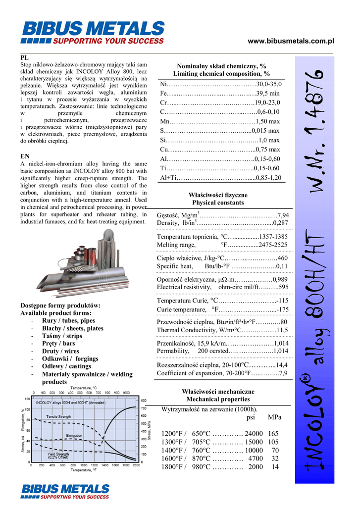www.bibusmetals.com.pl A nickel-iron-chromium alloy having the same basic composition as INCOLOY alloy 800 but with significantly higher creep-rupture strength. The higher strength results from close control of the carbon, aluminium, and titanium contents in conjunction with a high-temperature anneal. Used in chemical and petrochemical processing, in power plants for superheater and reheater tubing, in industrial furnaces, and for heat-treating equipment. Ni…………..………………………30,0-35,0 Fe…...………………..………….…39,5 min Cr…..……………………..……….19,0-23,0 C….…………………………..…….0,6-0,10 Mn…………………………………1,50 max S……………………………..…...0,015 max Si….……………………………..….1,0 max Cu…...……………………………..0,75 max Al………………………………….0,15-0,60 Ti………………………………….0,15-0,60 Al+Ti……………………………....0,85-1,20 ciwo ci fizyczne Physical constants sto , Mg/m3…………….……………..…7,94 Density, lb/in3………………..…………....0,287 Temperatura topnienia, °C…...............1357-1385 Melting range, °F…...............2475-2525 Ciep o w ciwe, J/kg-°C………..….…….…460 Specific heat, Btu/lb-°F ……..….…..…..0,11 Oporno elektryczna, µΩ-m……..…….…0,989 Electrical resistivity, ohm-circ mil/ft…..…..595 Dost pne formy produktów: Available product forms: - Rury / tubes, pipes - Blachy / sheets, plates - Ta my / strips - Pr ty / bars - Druty / wires - Odkuwki / forgings - Odlewy / castings - Materia y spawalnicze / welding products Temperatura Curie, °C……………………...-115 Curie temperature, °F……………………...-175 Przewodno cieplna, Btu•in/ft²•h•°F……..….80 Thermal Conductivity, W/m•°C…….………11,5 Przenikalno , 15,9 kA/m………………….1,014 Permability, 200 oersted….……………..1,014 Rozszerzalno cieplna, 20-100°C………...14,4 Coefficient of expansion, 70-200°F…..……...7,9 ciwo ci mechaniczne Mechanical properties Wytrzyma na zerwanie (1000h). psi 1200°F / 1300°F / 1400°F / 1600°F / 1800°F / MPa 650°C …………. 24000 165 705°C …………. 15000 105 760°C …………. 10000 70 870°C …………. 4700 32 980°C …………. 2000 14 INCOLOY alloy 800H/HT EN Nominalny sk ad chemiczny, % Limiting chemical composition, % ® Stop niklowo- elazowo-chromowy maj cy taki sam sk ad chemiczny jak INCOLOY Alloy 800, lecz charakteryzuj cy si wi ksz wytrzyma ci na pe zanie. Wi ksza wytrzyma jest wynikiem lepszej kontroli zawarto ci w gla, aluminium i tytanu w procesie wy arzania w wysokich temperaturach. Zastosowanie: linie technologiczne w przemy le chemicznym i petrochemicznym, przegrzewacze i przegrzewacze wtórne (mi dzystopniowe) pary w elektrowniach, piece przemys owe, urz dzenia do obróbki cieplnej. W.Nr. 1.4876 PL