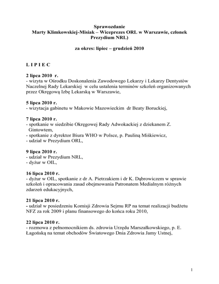 Sprawozdanie Marty Klimkowskiej-Misiak – Wiceprezes ORL w Warszawie, członek Prezydium NRL) za okres: lipiec – grudzień 2010 LIPIEC 2 lipca 2010 r. - wizyta w Ośrodku Doskonalenia Zawodowego Lekarzy i Lekarzy Dentystów Naczelnej Rady Lekarskiej w celu ustalenia terminów szkoleń organizowanych przez Okręgową Izbę Lekarską w Warszawie, 5 lipca 2010 r. - wizytacja gabinetu w Makowie Mazowieckim dr Beaty Boruckiej, 7 lipca 2010 r. - spotkanie w siedzibie Okręgowej Rady Adwokackiej z dziekanem Z. Gintowtem, - spotkanie z dyrektor Biura WHO w Polsce, p. Pauliną Miśkiewicz, - udział w Prezydium ORL, 9 lipca 2010 r. - udział w Prezydium NRL, - dyżur w OIL, 16 lipca 2010 r. - dyżur w OIL, spotkanie z dr A. Pietrzakiem i dr K. Dąbrowiczem w sprawie szkoleń i opracowania zasad obejmowania Patronatem Medialnym różnych zdarzeń edukacyjnych, 21 lipca 2010 r. - udział w posiedzeniu Komisji Zdrowia Sejmu RP na temat realizacji budżetu NFZ za rok 2009 i planu finansowego do końca roku 2010, 22 lipca 2010 r. - rozmowa z pełnomocnikiem ds. zdrowia Urzędu Marszałkowskiego, p. E. Łagońską na temat obchodów Światowego Dnia Zdrowia Jamy Ustnej, 1 23 lipca 2010 r. - dyżur w OIL, - spotkanie w NIL z p. A. Dziedzicem, dr A. Pietrzakiem i Prezesem NIL w sprawie wizerunku izb lekarskich, - spotkanie z dr J. Minakowskim na temat współpracy z wydawnictwem szkoleniowym MED TOUR PRESS, 30 lipca 2010 r. - dyżur w OIL, SIERPIEŃ 6 sierpnia 2010 r. - dyżur w OIL, 12 sierpnia 2010 r. - wizytacja gabinetu w Czerwonce 13 sierpnia 2010 r. - dyżur w OIL 18 sierpnia 2010 r. - udział w Prezydium ORL, spotkanie z dr A. Pietrzakiem, 20 sierpnia 2010 r. - udział w Prezydium NRL 27 sierpnia 2010 r. - wizytacja gabinetu w Lesznie, - dyżur w OIL, 31 sierpnia 2010 r. - spotkanie w Centrali NFZ z wiceprezesem J. Dworskim WRZESIEŃ 1 września 2010 r. - udział w Prezydium ORL, 3 września 2010 r. - udział w NRL, 2 10-11 września 2010 r. - udział w posiedzeniu Komisji Stomatologicznej NRL, 15 września 2010 r. - posiedzenie Komisji ds. lekarzy dentystów ORL w Warszawie, 17 września 2010 r. - udział w Prezydium NRL, 18 września 2010 r. - udział w Pikniku Integracyjnym Samorządów Zawodów Zaufania Publicznego w Starej Miłosnej, organizowanym przez ORL w Warszawie, 22 września 2010 r. - udział w szkoleniu z Ratownictwa Medycznego – jego organizacja i nadzór, 24 września 2010 r. - udział w ORL, - udział w obchodach Jubileuszu 50-lecia istnienia Szpitala Bielańskiego, 25 września 2010 r. - udział w komisji nadzorującej przebieg Lekarskiego Egzaminu Państwowego, 27 września 2010 r. - udział w konferencji organizowanej przez Urząd Marszałkowski na temat realizacji programów zdrowotnych przez Jednostki Samorządu Terytorialnego, 29 września 2010 r. - udział w Prezydium ORL, 30 września 2010 r. - udział w otwarciu 14 Zjazdu Polskiego Towarzystwa Ortodontycznego w Hotelu Hilton w Warszawie PAŻDZIERNIK 1 października 2010 r. - dyżur w OIL 2 października 2010 r. - udział w szkoleniu z Ratownictwa w Ciechanowie, 3 5 października 2010 r. - wizytacja gabinetu w Płoniawach, 6 października 2010 r. - udział w inauguracji Roku Akademickiego Wojskowego Uniwersytetu Medycznego, - udział w Prezydium ORL, 8 października 2010 r. - udział w NRL, 8-9 października 2010 r. - Brok, spotkanie lekarzy dentystów, delegatów OIL w Warszawie, 9 października 2010 r. - udział w inauguracji roku akademickiego Uniwersytetu Warszawskiego – podyplomowego Studium Prawa Medycznego, Bioetyki i Socjologii Medycyny, 10 października 2010 r. - udział w zakończeniu brydżowych mistrzostw lekarzy-wręczenie medali zwycięzcom, 13 października 2010 r. - udział w otwarciu nowej Przychodni Wilanowskiej przy ul. Przyczółkowskiej w Warszawie, 15 października 2010 r. - dyżur w OIL 16-17 października 2010 r. - udział w XIX Konferencji Młodych Lekarzy w Krakowie, 18 października 2010 r. - udział w uroczystości poświęcenia sztandaru i siedziby Krajowej Izby Diagnostów Laboratoryjnych, 20 października 2010 R. - udział w Prezydium ORL w Ostrowii Mazowieckiej, 22 października 2010 r. - udział w NRL 4 27 października 2010 r. - udział w otwarciu Szpitala Chirurgii Jednego Dnia Lux-Medu na Ursynowie, 28 października 2010 r. - wizytacja gabinetu w Nowej Soli, 29 października 2010 r. - udział w ORL LISTOPAD 5 listopada 2010 r. - udział w Prezydium NRL, - udział w uroczystym wręczeniu Odznaczeń „Gloria Medicine” na Zamku Królewskim w Warszawie, 17 listopada 2010 r. - udział w Prezydium ORL, 19 listopada 2010 r. - udział w NRL i konferencji uzgodnieniowej 26 listopada 2010 r. - dyżur w OIL, GRUDZIEŃ 1 grudnia 2010 r. - Wigilijne posiedzenie Komisji ds. lekarzy dentystów 3 grudnia 2010 r. - dyżur w OIL oraz udział w pierwszym posiedzeniu Mazowieckiego Forum Samorządów Zawodów Zaufania Publicznego, 8 grudnia 2010 r. - udział w II spotkaniu klubowym z Eskulapem, - udział w Wigilii Towarzystwa Lekarskiego Warszawskiego, 10 grudnia 2010 r. - udział w ORL )podjęcie stanowiska w sprawie kontraktowania świadczeń stomatologicznych), - udział w spotkaniu Wigilijnym Okręgowej Rady Adwokackiej, 5 11 grudnia 2010 r. - udział w obchodach 190- lecia istnienia Towarzystwa Lekarskiego Warszawskiego w Pałacu Staszica, 13 grudnia 2010 r. - udział w konferencji organizowanej przez Stowarzyszenie Medycyny Komunikacyjnej, 15 grudnia 2010 r. - udział w Prezydium ORL, 17 grudnia 2010 r. - udział w NRL 20 grudnia 2010 r. - udział w uroczystościach w szpitalu im. prof. Orłowskiego, - udział w Wigilii Okręgowej Rady Inżynierów Budownictwa, 28 grudnia 2010 r. - udział w Prezydium ORL 6