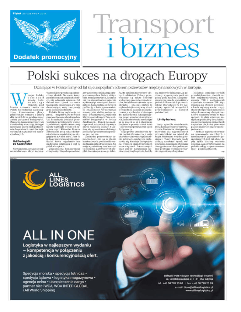 Piątek 20 czerwca 2014 Dodatek promocyjny Transport i biznes Polski sukces na drogach Europy Działające w Polsce firmy od lat są europejskim liderem przewozów międzynarodowych w Europie. W maju Polskę odwiedził książę Luksemburga Henryk, pod koniec czerwca zawita do Polski holenderska para książęca. Koronowane głowy przyjechały walczyć o pracę dla swoich firm, podkreślając zalety połączeń kolejowych. Zarówno Luksemburczycy, jak i Holendrzy wskazują, że organizowane przez nich połączenia do portów i centrów logistycznych są tańsze od samochodowych. Od Portugalii po Kazachstan Nie wiadomo, czy akwizycyjno-reklamowe akcje korono- REKLAMA wanych głów przyniosą zamierzony skutek. Na razie kolej, pomimo sutych unijnych dotacji, nie odniosła sukcesu. Od dekad traci rynek na rzecz transportu drogowego, a w nim dominującą rolę zaczynają grać polskie podmioty. Polskie firmy wykonują 20 proc. międzynarodowych przewozów samochodowych w UE. Przychody polskich przewoźników przekroczyły w ub.r. 15 mld euro, a jedna trzecia tej kwoty wpłynęła w euro od zagranicznych klientów. Branża zakończyła 2013 rok z dodatnim bilansem płatniczym, sięgającym 2,7 mld euro. Jest to jedna z niewielu gałęzi gospodarki, która regularnie ma nadwyżkę płatniczą i jest w polskich rękach. Zagraniczna konkurencja chwyta się różnych sposobów, aby zatrzymać ekspansję zarejestrowanych w Polsce 28 tys. firm transportowych, których 155 tys. ciężarówek regularnie wykonuje przewozy od Portugalii po Kazachstan, od Szwecji po Turcję. – Polscy przewoźnicy znakomicie wykorzystali szansę, jaką dał im wolny rynek – uważa prezes Zrzeszenia Międzynarodowych Przewoźników Drogowych w Polsce Jan Buczek. – Rynek nas zaakceptował, rozpoczął się wręcz okres rozkwitu branży. Staliśmy się synonimem dobrego polskiego produktu eksportowego – ocenia. Zachodni przewoźnicy samochodowi nie są w stanie konkurować z polskimi firmami transportu drogowego, bo mają wyraźnie wyższe koszty i to pomimo państwowych dopłat do zakupu nowego tabo- ru, do szkoleń kierowców i innych ułatwień. Polscy przewoźnicy są także chętnie wybierani przez zleceniodawców, bo ich biura otwarte są na okrągło. – Dla nas piątek to najbardziej intensywny dzień w tygodniu, czasem moi pracownicy wychodzą z biura po 20, a jeśli trzeba, funkcjonujemy nawet w soboty i niedziele. Na Zachodzie biura zamknięte są w piątek o 15 i otwierane dopiero w poniedziałek rano – porównuje przewoźnik spod Bydgoszczy. Stąd próby utrudnienia życia polskiej konkurencji mają charakter prawny: ograniczenie kabotażu, nad czym zastanawia się Komisja Europejska na wniosek skandynawskich stowarzyszeń branżowych oraz próby narzucenia konieczności wykupienia hotelu dla kierowcy biorącego 45-godzinny wypoczynek podczas pracy poza krajem. Taki przepis uderzy przede wszystkim w polskich i litewskich przewoźników, których jest w UE najwięcej spośród wszystkich przewoźników z nowych państw Unii. Limity barierą Inny sposób utrudnienia życia konkurencji to wprowadzenie limitów w dostępie do zezwoleń dla zagranicznych przewoźników na wjazd do kraju. Mistrzami w tym są Rosjanie i Turcy, których rządy usiłują zamknąć rynek wewnętrzny, drakońsko obcinając dostęp do zezwoleń, jednocześnie próbując wymusić otwarcie zagranicznych rynków. Rosjanie, chroniąc swoich przedsiębiorców, złamali nawet międzynarodową konwencję TIR i zablokowali używanie karnetów TIR. Wymuszają na obcych przewoźnikach wykupywanie rosyjskich ubezpieczeń należności celnych, a umowy ubezpieczeniowe skonstruowali w taki sposób, że dają władzom rosyjskim podstawę do zabierania przewoźnikom ciężarówek na poczet cła, które powinien płacić importer przewożonego towaru. – Jednak zapotrzebowanie na sprawnych, rzetelnych i terminowych partnerów gospodarczych jest tak duże, że gdy tylko bariery wzrostu osłabną, zapotrzebowanie na polskie usługi na pewno wzrośnie – pociesza Buczek. —rp 758638/A J2 REKLAMA Piątek Pi 20 czerwca 2014 Transport p i biznes 758619/A Kontenery na tory P rzewozy intermodalne szybko rosną i branża jest przekonana, że w najbliższych dekadach tempo rozwoju nie osłabnie, co sprawi, że więcej ładunków trafi z dróg na tory. Rosnące obroty handlowe Polski z krajami zamorskimi, przede wszystkim z Chinami, sprawiają, że w polskich portach raptownie rosną przeładunki kontenerów. W 2013 roku sięgnęły 2 mln TEU (kontenerów 20-stopowych), a specjaliści przewidują, że za 15 lat zwiększą się trzykrotnie. Tę masę będą wywozić z portów nie tylko samochody ciężarowe. Chociaż wykonują większość pracy, to ich udział systematycznie maleje i za kilka lat może spaść nawet poniżej połowy. Świadczy o tym rosnący udział kolei w obrocie pojemnikami: np. w terminalu kontenerowym BCT przekroczył 41 proc. w ubiegłym roku, gdy w 2004 był czterokrotnie mniejszy. Także w najmłodszym w Polsce terminalu, w gdańskim DCT, w zaledwie dwa lata udział kolei wzrósł o 10 pkt proc., do 36 proc. Jedna trzecia przewozów kontenerowych odbywa się z lub do portów morskich. Wiodącym przewoźnikiem jest PKP Cargo, dysponujące największym potencjałem organizacyjnym i taborowym. O podobne zlecenia ubiegają się m.in. Lotos Kolej, CTL oraz DB Schenker. Przewoźnicy, których jest łącznie dziewięciu, uruchamiają dziennie 290 pociągów z kontenerami i w 2013 roku przewieźli 8,6 mln ton towarów, o ponad 7 proc. więcej niż rok wcześniej. W pierwszym kwartale br. wzrost liczony wg TEU zbliżył się do 5 proc. (do blisko 280 tys. TEU), a według masy - o ponad 9 proc. (do 2,3 mln ton). Analitycy, z którymi zgadza się Ministerstwo Infrastruktury i Rozwoju, szacują, że potencjalnie w kraju wielkości Polski potencjalnie można uruchamiać nawet 1950 pociągów na dobę. Przewoźników wynajmują wyspecjalizowa