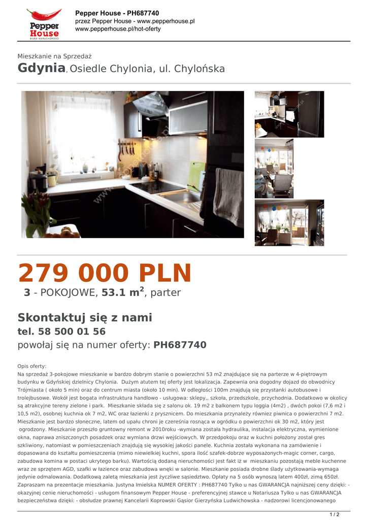 Pepper House - PH687740 przez Pepper House - www.pepperhouse.pl www.pepperhouse.pl/hot-oferty Mieszkanie na Sprzedaż Gdynia, Osiedle Chylonia, ul. Chylońska 279 000 PLN 3 - POKOJOWE, 53.1 m2, parter Skontaktuj się z nami tel. 58 500 01 56 powołaj się na numer oferty: PH687740 Opis oferty: Na sprzedaż 3-pokojowe mieszkanie w bardzo dobrym stanie o powierzchni 53 m2 znajdujące się na parterze w 4-piętrowym budynku w Gdyńskiej dzielnicy Chylonia. Dużym atutem tej oferty jest lokalizacja. Zapewnia ona dogodny dojazd do obwodnicy Trójmiasta ( około 5 min) oraz do centrum miasta (około 10 min). W odległości 100m znajdują się przystanki autobusowe i trolejbusowe. Wokół jest bogata infrastruktura handlowo - usługowa: sklepy,, szkoła, przedszkole, przychodnia. Dodatkowo w okolicy są atrakcyjne tereny zielone i park. Mieszkanie składa się z salonu ok. 19 m2 z balkonem typu loggia (4m2) , dwóch pokoi (7,6 m2 i 10,5 m2), osobnej kuchnia ok 7 m2, WC oraz łazienki z prysznicem. Do mieszkania przynależy równiez piwnica o powierzchni 7 m2. Mieszkanie jest bardzo słoneczne, latem od upału chroni je czereśnia rosnąca w ogródku o powierzchni ok 30 m2, który jest ogrodzony. Mieszkanie przeszło gruntowny remont w 2010roku -wymiana została hydraulika, instalacja elektryczna, wymienione okna, naprawa zniszczonych posadzek oraz wymiana drzwi wejściowych. W przedpokoju oraz w kuchni położony został gres szkliwiony, natomiast w pomieszczeniach znajdują się wysokiej jakości panele. Kuchnia została wykonana na zamówienie i dopasowana do kształtu pomieszczenia (mimo niewielkiej kuchni, spora ilość szafek-dobrze wyposażonych-magic corner, cargo, zabudowa komina w postaci ukrytego barku). Wartością dodaną nieruchomości jest fakt iż w mieszkaniu pozostają meble kuchenne wraz ze sprzętem AGD, szafki w łazience oraz zabudowa wnęki w salonie. Mieszkanie posiada drobne ślady użytkowania-wymaga jedynie odmalowania. Dodatkową zaletą mieszkania jest życzliwe sąsiedztwo. Opłaty na 5 osób wynoszą latem 400zł, zimą 650zł. Zapraszam na prezentacje mieszkania. Justyna Imielska NUMER OFERTY : PH687740 Tylko u nas GWARANCJA najniższej ceny dzięki: okazyjnej cenie nieruchomości - usługom finansowym Pepper House - preferencyjnej stawce u Notariusza Tylko u nas GWARANCJA bezpieczeństwa dzięki: - obsłudze prawnej Kancelarii Koprowski Gąsior Gierzyńska Ludwichowska - nadzorowi licencjonowanego 1/2 Pepper House - PH687740 przez Pepper House - www.pepperhouse.pl www.pepperhouse.pl/hot-oferty Pośrednika (nr licencji 6884) - polisie OC Pośrednika na kwotę 1 000 000 PLN w PZU SA - ubezpieczeniu kupowanej nieruchomości (szczegóły na naszej stronie). Więcej zdjęć, zdjęcia w dużym formacie, rzuty, filmy i dodatkowe informacje: www.pepperhouse.pl Wejdź już dziś i wyślij zapytanie bezpośrednio do opiekuna oferty. 2/2 Powered by TCPDF (www.tcpdf.org)