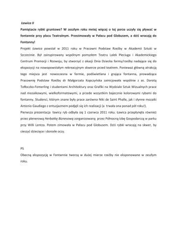 Ławica II Pamiętacie rybki gruntowe? W zeszłym roku mniej więcej o tej porze uczyły się pływać w fontannie przy placu Teatralnym. Przezimowały w Pałacu pod Globusem, a dziś wracają do Fontanny! Projekt Ławica powstał w 2011 roku w Pracowni Podstaw Rzeźby w Akademii Sztuki w Szczecinie. Był zainspirowany wspólnym pomysłem Teatru Lalek Pleciuga i Akademickiego Centrum Promocji i Rozwoju, by stworzyć z okazji Dnia Dziecka formy/rzeźby nadające się do ekspozycji na nowopowstałym rekreacyjnym skwerze przed teatrem. Ponieważ główną atrakcją tego miejsca jest nowoczesna w formie, podświetlana i grająca fontanna, prowadząca Pracownię Podstaw Rzeźby dr Małgorzata Kopczyńska zainicjowała wspólnie z as. Dorotą Tołłoczko-‐Femerling i studentami Architektury oraz Grafiki na Wydziale Sztuk Wizualnych prace nad mozaikowymi, wielkoformatowymi, a przede wszystkim bajecznie kolorowymi rybami do fontanny. Studenci, którym znane były prace zarówno Niki de Saint Phalle, jak i słynne mozaiki Antonio Gaudiego z entuzjazmem podjęli się ich realizacji (a trwała ona ponad pół roku!). Pierwsza prezentacja ławicy ryb odbyła się 1 czerwca 2011 roku. Ławica przepłynęła również przez plenerową Herbatkę Biznesową zorganizowaną przez Północną Izbę Gospodarczą w parku przy Willi Lentza. Potem zimowała w Pałacu pod Globusem. Dziś rybki wracają na skwer, by cieszyć dziecięce i dorosłe oczy. PS Obecną ekspozycję w Fontannie tworzą w dużej mierze rzeźby nie eksponowane w zeszłym roku.