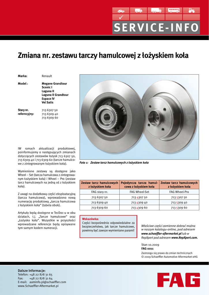 SERVICE-INFO Zmiana nr. zestawu tarczy hamulcowej z łożyskiem koła Marka: Renault Model : Megane Grandtour Scenic I Laguna II Laguna II Grandtour Espace IV Vel Satis Stary nr. 713 6307 50 referncyjny:713 6309 40 713 6309 60 IW ramach aktualizacji produktowej, poinformujemy o następujących zmianach dotyczących zestawów łożysk 713 6307 50, 713 6309 40 i 713 6309 60 (tarcze hamulcowe z zintegrowanym łożyskiem koła). Wymienione zestawy są dostępne jako Wheel – Set (tarcza hamulcowa z zintegrowanym Łożyskiem koła) i Wheel – Pro (zestaw tarcz hamulcowych na jedną oś z łożyskiem koła). Z uwagi na dodatkową części eksploatacyjną (tarcza hamulcowa), wprowadzono nową numerację produktową „tarcza hamulcowa z łożyskiem koła” (tabela obok). Artykuły będą dostępne w TecDoc-u w obu działach, t.j. „Tarcze hamulcowe” oraz „Łożysko koła”. Wszystkie w przyszłości wprowadzane referencje będą opisywane tym samym kodem numeracji. Foto 1: Zestaw tarcz hamulcowych z łożyskiem koła Zestaw tarcz hamulcowych Pojedyncza tarcza hamul- Zestaw tarcz hamulcowych z łożyskiem koła cowa z łożyskiem koła z łożyskiem koła FAG stary nr. FAG Wheel-Set FAG Wheel-Pro 713 6307 50 713 4307 50 713 5307 50 713 6309 40 713 4309 40 713 5309 40 713 6309 60 713 4309 60 713 5309 60 Wskazówka: Części bezpośrednio odpowiedzialne za bezpieczeństwo, jak tarcze hamulcowe, powinny być zawsze wymieniane parami! Właściwe części zamienne dobrać można w naszym katalogu-online, pod adresem www.schaeffler-aftermarket.pl lub w RepXpert pod adresem www.RepXpert.com. Stan 10.2009 FAG 0011 Zastrzega się prawo do zmian technicznych © 2009 Schaeffler Automotive Aftermarket oHG Dalsze Informacje: Telefon:+48 22 878 31 65 Fax: +48 22 878 31 64 E-mail: [email protected] www.Schaeffler-Aftermarket.pl