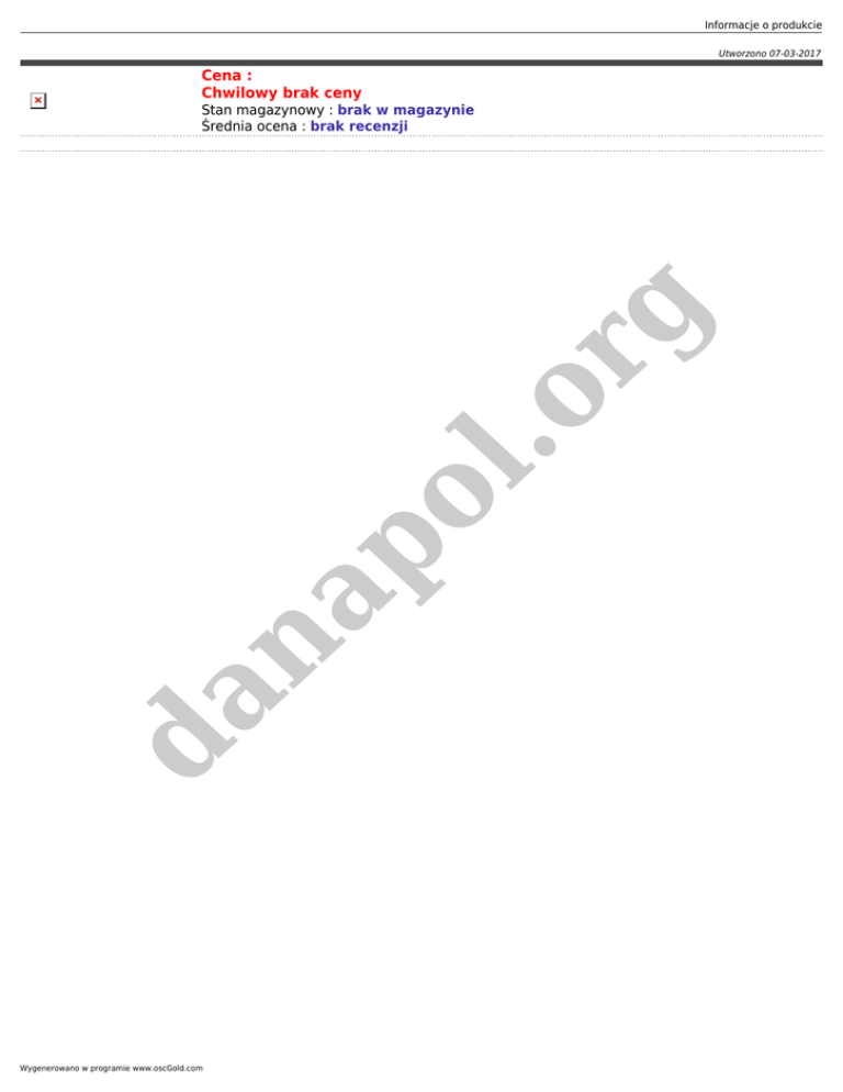 Informacje o produkcie Utworzono 07-03-2017 Cena : Chwilowy brak ceny da na po l.o rg Stan magazynowy : brak w magazynie Średnia ocena : brak recenzji Wygenerowano w programie www.oscGold.com
