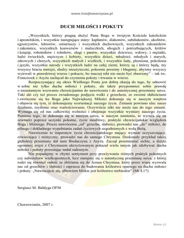 www.trzejtowarzysze.pl DUCH MIŁOŚCI I POKUTY „Wszystkich, którzy pragną służyć Panu Bogu w świętym Kościele katolickim i apostolskim, i wszystkie następujące stany: kapłanów, diakonów, subdiakonów, akolitów, egzorcystów, lektorów, ostiariuszy i wszystkich duchownych, wszystkich zakonników i zakonnice, wszystkich konwersów i maluczkich, ubogich i potrzebujących, królów i książąt, robotników i rolników, sługi i panów, wszystkie dziewice, wdowy, i mężatki, ludzi świeckich, mężczyzn i kobiety, wszystkie dzieci, młodzież, młodych i starych, zdrowych i chorych, wszystkich małych i wielkich, i wszystkie ludy, plemiona, pokolenia i języki, wszystkie narody i wszystkich ludzi na całej ziemi, którzy są i którzy będą, my wszyscy bracia mniejsi, słudzy nieużyteczni, pokornie prosimy i błagamy, abyśmy wszyscy wytrwali w prawdziwej wierze i pokucie, bo inaczej nikt nie może być zbawiony” – tak św. Franciszek z Asyżu zachęcał do czynienia pokuty i trwania w wierze. Rozpoczynający się okres Wielkiego Postu jest dobrą okazją do tego, by odnowić w sobie nie tylko ducha miłości i pokuty, ale także przypomnieć sobie prawdę o nieustannym wezwaniu chrześcijanina do nawrócenia i do autentycznej przemiany serca. Taki akt czy też proces świadomego podjęcia walki z grzechem, ze swoimi słabościami i zwrócenie się ku Bogu jako Największej Miłości dokonuje się w naszym wnętrzu i objawia się tym, iż dokonujemy reorientacji naszego życia. Zmianie powinno ulec nasze działanie, myślenie oraz wartościowanie. Oczywiście nikt nie może nas do tego zmusić. Wymaga się od nas całkowitej wolności i obejmuje wszystkie wymiary naszego życia. Pomimo tego, że dokonuje się w naszym sercu, w naszym sumieniu, to wyraża się na zewnątrz poprzez uczynki pokutne, życie modlitwy, praktyki chrześcijańskie względem Boga i bliźniego. Proces nawrócenia „od” grzechu, słabości, prowadzi nas „do” miłości, do pilnego i dokładnego wypełniania zadań życiowych uzgodnionych z wolą Bożą. Nawrócenie to imperatyw życia chrześcijańskiego mający wymiar oczyszczający, oświecający i mistyczny, prowadzi nas do samego Chrystusa. Doskonały przykład takiej głębokiej przemiany dał nam Biedaczyna z Asyżu. Zaczął przemieniać siebie, a dzięki ogromnej więzi z Chrystusem ukrzyżowanym pokazał wielu innym jak zdobywać ducha miłości i pokuty pozostając nadal radosnym. Nie popadajmy w zbytni sentyment przy przeżywaniu różnych praktyk pokutnych czy nabożeństw wielkopostnych, lecz starajmy się o autentyczną przemianę serca, z której rodzi się również radość ze zbliżania się do Jezusa Chrystusa, który przez wiarę wyzwala nas od grzechów i słabości i zaprasza do budowania królestwa opartego na duchu miłości i pokuty. „Nawracajcie się, albowiem bliskie jest królestwo niebieskie” (Mt 4,17). Sergiusz M. Bałdyga OFM Chorzowianin, 2007 r. Strona 1/1