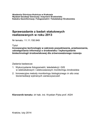 Akademia Górniczo-Hutnicza w Krakowie Wydział Geodezji Górniczej i Inżynierii Środowiska Katedra Geoinformacji, Fotogrametrii i Teledetekcji Środowiska Sprawozdanie z badań statutowych realizowanych w roku 2013 Nr tematu: 11.11.150.949 Tytuł: Innowacyjne technologie w zakresie pozyskiwania, przetwarzania, udostępniania informacji o środowisku i wykorzystanie biotechnologii środowiskowej dla zrównoważonego rozwoju Zadania badawcze 1. Wykorzystanie fotogrametrii, teledetekcji i GIS w wieloskalowym i wieloczasowym monitoringu środowiska 2. Innowacyjne metody monitoringu biologicznego in situ oraz bioremediacji wybranych zanieczyszczeń Kierownik tematu: dr hab. inż. Krystian Pyka prof. AGH Kraków, luty 2014 Zawartość: Zespół wykonawców Sprawozdanie z zadania 1 Sprawozdanie z zadania 2 Załącznik 1a – wykaz publikacji opracowanych w ramach zadania 1 Załącznik 1b – wykaz publikacji opracowanych w ramach zadania 2 Załącznik 2a – publikacje z zadania 1 Załącznik 2b – publikacje z zadania 2 WGGiIŚ - KGFiTŚ, statutowe 2013 2 Zespół Wykonawców Kierownik dr hab. inż. Krystian Pyka - prof. n. AGH Zadanie 1 Pracownicy naukowo-dydaktyczni dr hab. inż. Krystian Pyka – prof. n. AGH dr hab. inż. Regina Tokarczyk – prof. n. AGH dr hab. inż. Beata Hejmanowska – prof. n. AGH dr inż. Adam Boroń – adiunkt dr inż. Natalia Borowiec – adiunkt dr inż. Wojciech Drzewiecki – adiunkt dr inż. Jakub Kolecki – adiunkt dr inż. Urszula Marmol – adiunkt dr inż. Sławomir Mikrut – adiunkt dr inż. Tomasz Pirowski – adiunkt dr inż. Antoni Rzonca – adiunkt dr inż. Mariusz Twardowski – adiunkt dr inż. Andrzej Wróbel – adiunkt Zadanie 2 Pracownicy naukowo-dydaktyczni prof. dr hab. Jan Dobrowolski – profesor dr Aleksandra Wagner – adiunkt Pracownicy techniczni mgr inż. Barbara Patuła – specj. nauk.-techn. WGGiIŚ - KGFiTŚ, statutowe 2013 3 Sprawozdanie z zadania badawczego nr 1 Wykorzystanie fotogrametrii, teledetekcji i GIS w wieloskalowym i wieloczasowym monitoringu środowiska Zakres badań i uzyskane wyniki W 2013 roku kontynuowano wcześniej zainicjowane prace badawcze, których zakres obejmuje: 1. Integrowanie fotogrametrii, skaningu laserowego, satelitarnego systemu pozycjonowania i klasycznych pomiarów geodezyjnych dla potrzeb zasilania w dane 3D systemów informacji przestrzennej prowadzonych w technice GIS, 2. Modelowanie wybranych procesów przestrzennych 3. Wykorzystanie fotogrametrii i skaningu laserowego w inwentaryzacji obiektów inżynierskich oraz obiektów architektonicznych 4. Wykorzystanie pomiarów termograficznych do badania rozkładu temperatury powierzchni obiektów inżynierskich 1. Integrowanie fotogrametrii, skaningu laserowego, satelitarnego systemu pozycjonowania i klasycznych pomiarów geodezyjnych dla potrzeb zasilania w dane 3D systemów informacji przestrzennej prowadzonych w technice GIS 1.1. Określanie grubości pokrywy śnieżnej na podstawie fotogrametrycznych zdjęć naziemnych Określanie grubości pokrywy śnieżnej w terenie wysokogórskim ma duże znaczenie w badaniach związanych z oceną zagrożenia lawinowego czy też w badaniach przyrodniczych, np. badaniach hydrologicznych. Fotogrametria, jako metoda zdalnego pozyskiwania danych przestrzennych o środowisku, może mieć tutaj zastosowanie, zwłaszcza, że wykonanie zdjęć nie wiąże się z przebywaniem w terenie zagrożenia lawinowego (Kolecki, Kolecka, 2013). W literaturze światowej metody fotogrametryczne służące określaniu grubości pokrywy śnieżnej z pewnością nie są opisywane szeroko, choć pierwsze publikacje w tym zakresie pojawiały się od lat sześćdziesiątych. W dobie zdjęć cyfrowych i dobrze rozwiniętych algorytmów gęstego matchingu, zasadne wydaje się podjęcie kolejnych działań badawczych zmierzających tym razem do uzyskania bardziej szczegółowych modeli grubości pokrywy śnieżnej. W celu otrzymania takich modeli należy wykonać dwie (lub więcej) serie zdjęć pomiarowych: pierwszą w czasie kiedy stok górski jest wolny od śniegu, a drugą w momencie w którym chcemy skartować grubość pokrywy śnieżnej. Jako, że powodzenie automatycznego pomiaru fotogrametrycznego zależy w dużej mierze od tekstury powierzchni terenu, nie każde warunki śniegowe gwarantują pozyskanie przydatnych zdjęć pomiarowych. Dlatego też, w ramach prowadzonych prac badawczych (Kolecki, Kolecka 2013), zdecydowano się na wykonanie zdjęć w marcu, po dłuższym czasie bez opadów, kiedy śnieg posiada już dającą się zauważyć teksturę. Jako teren prac wybrano stoki południowego zamknięcia Doliny Pięciu Stawów Polskich w Tatrach Wysokich, pomiędzy Gładką Przełęczą a Walentkowym Wierchem. Do wykonania zdjęć wykorzystano skalibrowany aparat cyfrowy Nikon D5100 z obiektywem 85 mm. Drugą serię zdjęć wykonano w sezonie letnim. Zimą wykonano 38 zjęć a latem uznano, że wystarczy pozyskanie 25 obrazów. Pozyskane zdjęcia posłużyły do utworzenia pomiarowch modeli fotogrametrycznych o lekko zbieżnej konfiguracji WGGiIŚ - KGFiTŚ, statutowe 2013 4 i pikselu terenowym w granicach 3 – 4 cm. Teoretycznie pozwalało osiągnąć to dokładność wyznaczenia pomiaru punktu terenowego na poziomie 10 cm. Zdjęcia wykonane w okresie zimowym i letnim (łącznie 63 obrazy) utowrzyły jedną sięć terratriangulacyjną, którą wyrównano korzystając z programu Photomodeler Scanner 2012. Bardzo ważna była lokalizacja punktów wiążących. Istotne było uzyskanie wiązań pomiędzy zdjęciami zimowymi i letnimi, dlatego szczególną uwagę przywiązywano do lokowania punktów na odkrytych skałach. Było to szczególnie trudne w dolnych fragmentach sieci, ze względu na zalegającą pokrywę śnieżną. W celu nadania georeferencji obrazom oraz produktom wynikowym, pomierzono również kilka fotopunktów naturalnych, których współrzędne sytuacyjne odczytano z ortofotomapy (piksel 25 cm) a wysokoś