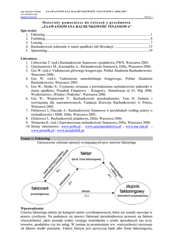 mgr Stanisław Hońko www.honko.oz.pl [email protected] ZAAWANSOWANA RACHUNKOWOŚĆ FINANSOWA 2006/2007 Strona 1 Materiały pomocnicze do ćwiczeń z przedmiotu „ZAAWANSOWANA RACHUNKOWOŚĆ FINANSOWA” Spis treści: 1. Faktoring ........................................................................................................................ 1 2. Forfaiting........................................................................................................................ 6 3. Leasing ........................................................................................................................... 7 4. Rachunkowość jednostek w stanie upadłości lub likwidacji ....................................... 13 5. Sponsoring.................................................................................................................... 19 Literatura: 1. Cebrowska T. (red.) Rachunkowość finansowa i podatkowa, PWN, Warszawa 2005. 2. Gmytrasiewicz M., Karmańska A.: Rachunkowość finansowa, Difin, Warszawa 2006. 3. Gos W. (red.): Vademecum głównego księgowego, Polska Akademia Rachunkowości, Warszawa 2006. 4. Gos W. (red.): Vademecum samodzielnego księgowego, Polska Akademia Rachunkowości, Warszawa 2005. 5. Gos W., Hońko S.: Czynności związane z prowadzeniem rachunkowości jednostki w stanie upadłości, Poradnik Finansowo – Księgowy, Aktualizacja nr 63, Maj 2006, Wydawnictwo „Wiedza i Praktyka”, Warszawa 2006. 6. Gos W., Waśniewski T.: Rachunkowość przedsiębiorstw, Tom II, Zadania i rozwiązania dla zaawansowanych, Fundacja Rozwoju Rachunkowości w Polsce, Warszawa 2002. 7. Olchowicz I.,Tłaczała A.: Rachunkowość finansowa w przykładach według ustawy o rachunkowości i MSR, Difin, Warszawa 2005. 8. Olchowicz I.: Rachunkowość podatkowa, Difin, Warszawa 2006. 9. Winiarska K. (red.) Zaawansowana rachunkowość finansowa, Difin, Warszawa 2006. 10. Strony internetowe: www.gofin.pl ; www.gazetapodatkowa.pl ; www.par.edu.pl ; www.portalfk.pl ; www.poradnikfk.pl Temat 1: Faktoring Uproszczony schemat operacji występujących przy umowie faktoringu Wprowadzenie: Umowa faktoringu należy do kategorii umów cywilnoprawnych, które nie zostały nazwane w prawie cywilnym. Na podstawie tej umowy faktorant (przedsiębiorca) przenosi na faktora wierzytelności, jakie posiada wobec swojego kontrahenta z tytułu sprzedanych mu m.in. towarów, produktów czy też usług. W zamian za przeniesienie ww. wierzytelności otrzymuje od faktora środki pieniężne. Faktor, którym jest zazwyczaj bank albo firma faktoringowa, mgr Stanisław Hońko www.honko.oz.pl [email protected] ZAAWANSOWANA RACHUNKOWOŚĆ FINANSOWA 2006/2007 Strona 2 przejmuje finansowanie faktoranta w zakresie określonym w umowie. W zamian otrzymuje wynagrodzenie w postaci prowizji i dyskonta. Objaśnienia do schematu: 1. Przedsiębiorca wystawia fakturę dokumentującą sprzedaż towaru, produktu lub usługi. 2. Faktorant (przedsiębiorca) przenosi na faktora wierzytelność, którą posiada wobec swojego kontrahenta. 3. W zamian za swą wierzytelność przedsiębiorca otrzymuje ekwiwalent pieniężny w wysokości kwoty wynikającej z faktury pomniejszonej o prowizję i odsetki. 4. Dłużnik faktoringowy (kontrahent przedsiębiorcy) dokonuje na rzecz faktora zapłaty kwoty wynikającej z faktury. Test: 1. Faktor to: a) firma sprzedająca wierzytelność faktorantowi b) firma skupująca wierzytelności od dłużników c) bank lub inna jednostka skupująca wierzytelności 2. Jednostka skupująca wierzytelności zgodnie z umową faktoringu: a) jest określana jako faktor b) musi być bankiem lub inną instytucją finansową, c) może być osobą fizyczną prowadząca działalność gospodarczą. 3. Wierzytelności będące przedmiotem umowy faktoringu: a) muszą być bezsporne, b) dotyczą należności z tytułu dostaw i usług, c) najczęściej ich termin spłaty nie przekracza 14 dni. 4. Awansowa metoda faktoringu polega na: a) przekazaniu faktorantowi zaliczki w wysokości 50% - 95% faktury b) udokumentowaniu transakcji (przekazanie faktorowi kopii faktur, dokumentów magazynowych potwierdzających realizację transakcji) c) odliczeniu przez faktora z góry założonej opłaty. 5. Dyskontowa metoda faktoringu polega na: a) zakupie wierzytelności przedsiębiorcy przez faktora z terminem natychmiastowej wymagalności, b) przekazaniu faktorantowi zaliczki w wysokości 50% - 95% faktury c) odliczeniu przez faktora dyskonta oraz opłaty za świadczone usługi od ceny zakupu wierzytelności 6. Do zalet faktoringu z perspektywy faktoranta należą: a) poprawa płynności finansowej b) skrócenie czasu oczekiwania na wpływ środków pieniężnych c) uniknięcie konieczności zaciągania kredytów bankowych 7. Do wad faktoringu z perspektywy faktoranta należą: a) wysokie koszty opłat i prowizji faktora b) możliwe osłabienie więzi z kontrahentem (dłużnikiem) c) możliwe osłabienie reputacji jednostki Faktoring – test uzupełnień/wyboru Faktoring właściwy różni się od niewłaściwego tym, że ryzyko nieściągalności wierzytelności spoczywa na faktorze/faktorancie/dłużniku (właściwe zakreślić). Faktoring niepełny to inaczej faktoring właściwy/niewłaściwy (właściwe zakreślić). Faktoring łączący cechy właściwego i niewłaściwego to faktoring .......................................... (uzupełnić) mgr Stanisław Hońko www.honko.oz.pl [email protected] ZAAWANSOWANA RACHUNKOWOŚĆ FINANSOWA 2006/2007 Strona 3 Faktoring leasingowy polega na możliwości............................................................................. .................................................................................................................................(uzupełnić) Zadania sytuacyjne: A. Dokonałem zakupu towaru. Jednak ze względu na czasowy brak środków finansowych nie uregulowałem zapłaty za towar. Obecnie o zapłatę ubiega się bank, a nie sprzedawca towaru. C