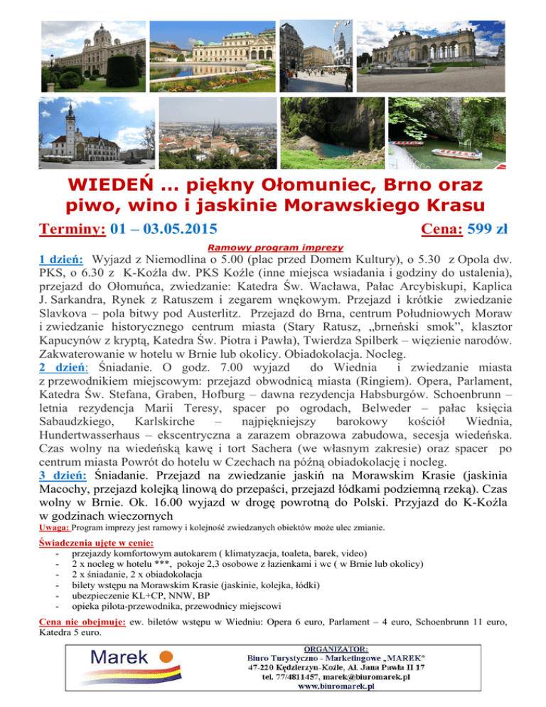 WIEDEŃ … piękny Ołomuniec, Brno oraz piwo, wino i jaskinie Morawskiego Krasu Terminy: 01 – 03.05.2015 Cena: 599 zł Ramowy program imprezy 1 dzień: Wyjazd z Niemodlina o 5.00 (plac przed Domem Kultury), o 5.30 z Opola dw. PKS, o 6.30 z K-Koźla dw. PKS Koźle (inne miejsca wsiadania i godziny do ustalenia), przejazd do Ołomuńca, zwiedzanie: Katedra Św. Wacława, Pałac Arcybiskupi, Kaplica J. Sarkandra, Rynek z Ratuszem i zegarem wnękowym. Przejazd i krótkie zwiedzanie Slavkova – pola bitwy pod Austerlitz. Przejazd do Brna, centrum Południowych Moraw i zwiedzanie historycznego centrum miasta (Stary Ratusz, „brneński smok”, klasztor Kapucynów z kryptą, Katedra Św. Piotra i Pawła), Twierdza Spilberk – więzienie narodów. Zakwaterowanie w hotelu w Brnie lub okolicy. Obiadokolacja. Nocleg. 2 dzień: Śniadanie. O godz. 7.00 wyjazd do Wiednia i zwiedzanie miasta z przewodnikiem miejscowym: przejazd obwodnicą miasta (Ringiem). Opera, Parlament, Katedra Św. Stefana, Graben, Hofburg – dawna rezydencja Habsburgów. Schoenbrunn – letnia rezydencja Marii Teresy, spacer po ogrodach, Belweder – pałac księcia Sabaudzkiego, Karlskirche – najpiękniejszy barokowy kościół Wiednia, Hundertwasserhaus – ekscentryczna a zarazem obrazowa zabudowa, secesja wiedeńska. Czas wolny na wiedeńską kawę i tort Sachera (we własnym zakresie) oraz spacer po centrum miasta Powrót do hotelu w Czechach na późną obiadokolację i nocleg. 3 dzień: Śniadanie. Przejazd na zwiedzanie jaskiń na Morawskim Krasie (jaskinia Macochy, przejazd kolejką linową do przepaści, przejazd łódkami podziemną rzeką). Czas wolny w Brnie. Ok. 16.00 wyjazd w drogę powrotną do Polski. Przyjazd do K-Koźla w godzinach wieczornych Uwaga: Program imprezy jest ramowy i kolejność zwiedzanych obiektów moŜe ulec zmianie. Świadczenia ujęte w cenie: - przejazdy komfortowym autokarem ( klimatyzacja, toaleta, barek, video) - 2 x nocleg w hotelu ***, pokoje 2,3 osobowe z łazienkami i wc ( w Brnie lub okolicy) - 2 x śniadanie, 2 x obiadokolacja - bilety wstępu na Morawskim Krasie (jaskinie, kolejka, łódki) - ubezpieczenie KL+CP, NNW, BP - opieka pilota-przewodnika, przewodnicy miejscowi Cena nie obejmuje: ew. biletów wstępu w Wiedniu: Opera 6 euro, Parlament – 4 euro, Schoenbrunn 11 euro, Katedra 5 euro.