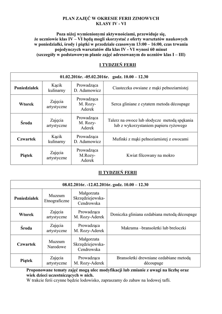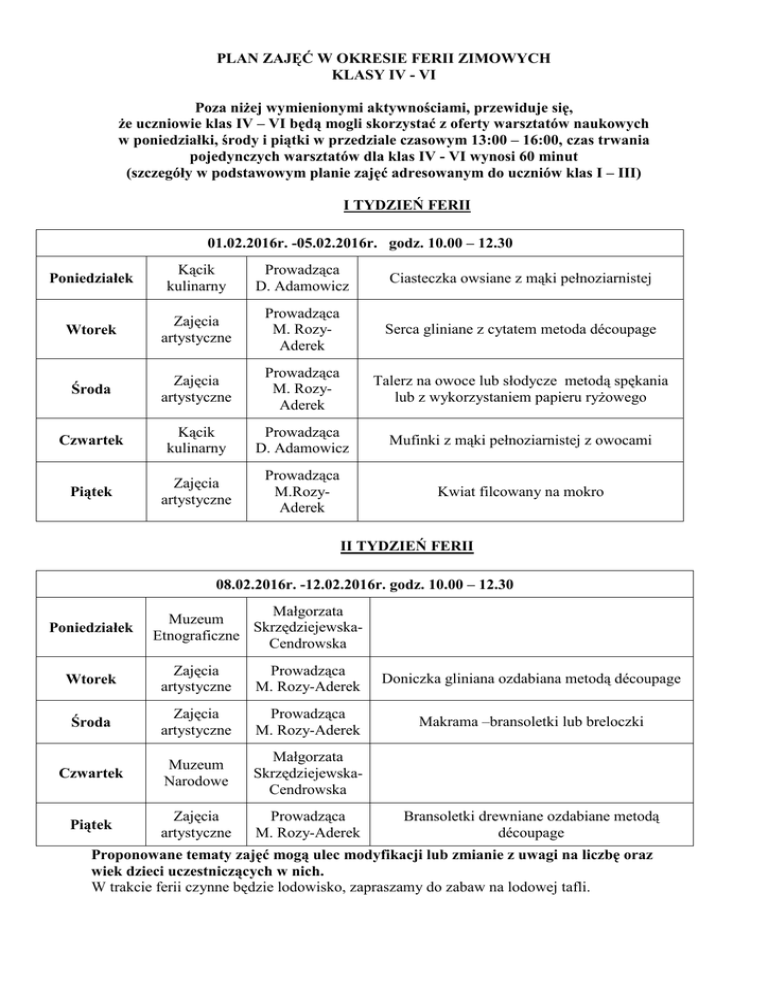 PLAN ZAJĘĆ W OKRESIE FERII ZIMOWYCH KLASY IV - VI Poza niżej wymienionymi aktywnościami, przewiduje się, że uczniowie klas IV – VI będą mogli skorzystać z oferty warsztatów naukowych w poniedziałki, środy i piątki w przedziale czasowym 13:00 – 16:00, czas trwania pojedynczych warsztatów dla klas IV - VI wynosi 60 minut (szczegóły w podstawowym planie zajęć adresowanym do uczniów klas I – III) I TYDZIEŃ FERII 01.02.2016r. -05.02.2016r. godz. 10.00 – 12.30 Poniedziałek Kącik kulinarny Prowadząca D. Adamowicz Ciasteczka owsiane z mąki pełnoziarnistej Wtorek Zajęcia artystyczne Prowadząca M. RozyAderek Serca gliniane z cytatem metoda découpage Środa Zajęcia artystyczne Prowadząca M. RozyAderek Talerz na owoce lub słodycze metodą spękania lub z wykorzystaniem papieru ryżowego Czwartek Kącik kulinarny Prowadząca D. Adamowicz Mufinki z mąki pełnoziarnistej z owocami Piątek Zajęcia artystyczne Prowadząca M.RozyAderek Kwiat filcowany na mokro II TYDZIEŃ FERII 08.02.2016r. -12.02.2016r. godz. 10.00 – 12.30 Poniedziałek Małgorzata Muzeum SkrzędziejewskaEtnograficzne Cendrowska Wtorek Zajęcia artystyczne Prowadząca M. Rozy-Aderek Doniczka gliniana ozdabiana metodą découpage Środa Zajęcia artystyczne Prowadząca M. Rozy-Aderek Makrama –bransoletki lub breloczki Czwartek Muzeum Narodowe Małgorzata SkrzędziejewskaCendrowska Piątek Zajęcia artystyczne Prowadząca M. Rozy-Aderek Bransoletki drewniane ozdabiane metodą découpage Proponowane tematy zajęć mogą ulec modyfikacji lub zmianie z uwagi na liczbę oraz wiek dzieci uczestniczących w nich. W trakcie ferii czynne będzie lodowisko, zapraszamy do zabaw na lodowej tafli.
