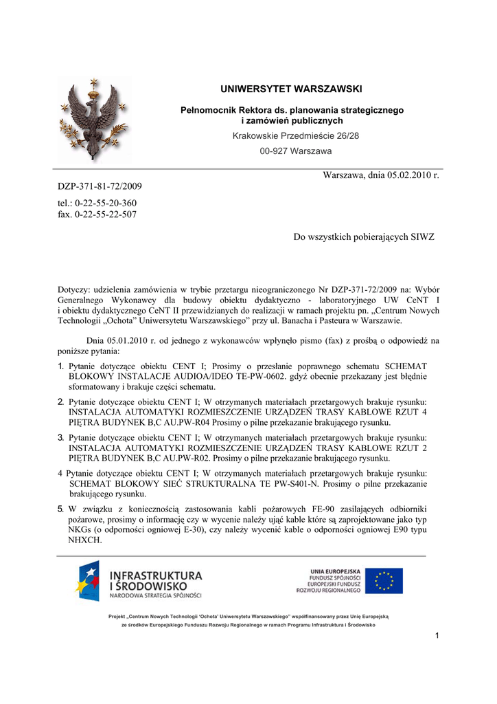 UNIWERSYTET WARSZAWSKI Pełnomocnik Rektora ds. planowania strategicznego i zamówień publicznych Krakowskie Przedmieście 26/28 00-927 Warszawa Warszawa, dnia 05.02.2010 r. DZP-371-81-72/2009 tel.: 0-22-55-20-360 fax. 0-22-55-22-507 Do wszystkich pobierających SIWZ szystkich pobierających SIWZ/23-9 Dotyczy: udzielenia zamówienia w trybie przetargu nieograniczonego Nr DZP-371-72/2009 na: Wybór Generalnego Wykonawcy dla budowy obiektu dydaktyczno - laboratoryjnego UW CeNT I i obiektu dydaktycznego CeNT II przewidzianych do realizacji w ramach projektu pn. „Centrum Nowych Technologii „Ochota” Uniwersytetu Warszawskiego” przy ul. Banacha i Pasteura w Warszawie. Dnia 05.01.2010 r. od jednego z wykonawców wpłynęło pismo (fax) z prośbą o odpowiedź na poniższe pytania: 1. Pytanie dotyczące obiektu CENT I; Prosimy o przesłanie poprawnego schematu SCHEMAT BLOKOWY INSTALACJE AUDIOA/IDEO TE-PW-0602. gdyż obecnie przekazany jest błędnie sformatowany i brakuje części schematu. 2. Pytanie dotyczące obiektu CENT I; W otrzymanych materiałach przetargowych brakuje rysunku: INSTALACJA AUTOMATYKI ROZMIESZCZENIE URZĄDZEŃ TRASY KABLOWE RZUT 4 PIĘTRA BUDYNEK B,C AU.PW-R04 Prosimy o pilne przekazanie brakującego rysunku. 3. Pytanie dotyczące obiektu CENT I; W otrzymanych materiałach przetargowych brakuje rysunku: INSTALACJA AUTOMATYKI ROZMIESZCZENIE URZĄDZEŃ TRASY KABLOWE RZUT 2 PIĘTRA BUDYNEK B,C AU.PW-R02. Prosimy o pilne przekazanie brakującego rysunku. 4 Pytanie dotyczące obiektu CENT I; W otrzymanych materiałach przetargowych brakuje rysunku: SCHEMAT BLOKOWY SIEĆ STRUKTURALNA TE PW-S401-N. Prosimy o pilne przekazanie brakującego rysunku. 5. W związku z koniecznością zastosowania kabli pożarowych FE-90 zasilających odbiorniki pożarowe, prosimy o informację czy w wycenie należy ująć kable które są zaprojektowane jako typ NKGs (o odporności ogniowej E-30), czy należy wycenić kable o odporności ogniowej E90 typu NHXCH. Projekt „Centrum Nowych Technologii ‘Ochota’ Uniwersytetu Warszawskiego” współfinansowany przez Unię Europejską ze środków Europejskiego Funduszu Rozwoju Regionalnego w ramach Programu Infrastruktura i Środowisko 1 6. Pytanie dotyczące obiektu CENT I; W otrzymanej dokumentacji wykonawczej instalacji elektrycznej rysunek o nazwie: EL1.PW-V-01+3-N Rev E Schemat główny zasilania +RG1, RG2-wy.pdf jest niedokończony. Na schemacie tym brakuje połączeń pomiędzy poszczególnymi odbiorami. Prosimy o przekazanie poprawnego rysunku. 7. Prosimy o informację czy Inwestor zapewnia dostawę tymczasowej energii elektrycznej do zasilenia zaplecza i placu budowy? Jeśli tak to prosimy o podanie mocy energetycznej jaką Państwo dysponują do zasilenia placu budowy. 8. Pytanie dotyczące obiektu CENT I; PW instalacji elektrycznych wewnętrznych. Czy w zakres przetargu wchodzi dostawa i montaż rozdzielni SN w budynku? Jeśli tak, to prosimy o przekazanie stosownej dokumentacji wykonawczej. 9. Pytanie dotyczące obiektu CENT I; PW instalacji elektrycznych wewnętrznych. Na schematach rozdzielnic głównych RG1 i RG2 (rys. nr EL1 PWA//2-N oraz EL.1PW.V/3-N występują odwołania do rysunków widoków rozdzielni. Prosimy o przekazanie tych rysunków. 10. Pytanie dotyczące obiektu CENT I; PW instalacji elektrycznych wewnętrznych. Na schemacie głównym zasilania nN (rys. nr EL1.PW-W1-N) zamieszczono zapis o treści „wszystkie przewody i kable o podwyższonej odporności ogniowej - odporność FE120" Prosimy o potwierdzenie wymogu i/lub sprecyzowanie zakresu stosowania. 11. Pytanie dotyczące obiektu CENT I; PW instalacji elektrycznych wewnętrznych, prosimy o sprecyzowanie wymogów dotyczących urządzenia UPS wraz z baterią akumulatorów (?) zlokalizowanego w pom. Nr 0-1.50 (rys. nr EL1.PW-H/1-N). 12. Pytanie dotyczące obiektu CENT II, PW instalacji elektrycznych wewnętrznych, a planach instalacji nie pokazano przebiegu projektowanych szynoprzewodów, mostów szynowych oraz tras kablowych, co uniemożliwia ich prawidłową wycenę. Prosimy o przekazanie odpowiednich rysunków. 13. Pytanie dotyczące obiektu CENT II; PW instalacji elektrycznych wewnętrznych. Na schematach rozdzielnicy głównej RG (rys. nr FI-PW-E-01.00) oraz rozdzielnicy pożarowej RP (rys. nr FI-PWE.IV/04.00) występują odwołania do rysunków widoków rozdzielni Prosimy o przekazanie tych rysunków. 14. Pytanie dotyczące obiektu CENT II; PW instalacji elektrycznych wewnętrznych Prosimy o wskazanie lokalizacji rozdzielnicy pożarowej RP 15. Pytanie dotyczące obiektu CENT I; PW instalacji elektrycznych wewnętrznych. Na schematach rozmieszczenia tras kablowych na poszczególnych kondygnacjach np. EL1.PW-III-2-N rev.D TRASY KABLOWE - 312_PARTER.pdf na schematach czarno - białych zaznaczono kolorem czarnym przebieg tras kablowych, szynoprzewodów co powoduje że schematy te są kompletnie nie czytelne, co uniemożliwia dokonania jakiegokolwiek obmiaru. Prosimy zatem o przekazanie schematów kolorowych takich jakie są w Projekcie instalacji teletechnicznych. 16. Pytanie dotyczące obiektu CENT I; W kosztorysie robót zieleniarskich poz. 56 wymieniono „filtr wysokoprzepływowy np. Roberts 80 do 120 mikronów z niezbędnymi złączkami". Jak powinna być średnica tego filtra, ewentualnie na jaki przepływ wody powinien być on przewidziany? 17. Pytanie dotyczące obiektu CENT I; W kosztorysie robót zieleniarskich poz. 57 wymieniono „filtr Projekt „Centrum Nowych Technologii ‘Ochota’ Uniwersytetu Warszawskiego” współfinansowany przez Unię Europejską ze środków Europejskiego Funduszu Rozwoju Regionalnego w ramach Programu Infrastruktura i Środowisko 2 piaskowy z niezbędnymi złączkami" Prosimy o bliższe informacje no temat tego filtra -jaki typ, jaka średnica, jaki przepływ nominalny , opcja automatyczna czy ręczna, co taki filtr ma filtrować? Odpowiadając, uprzejmie informujemy: ad. 1 - Rysunek TE.PW-0602 został przekazany w form