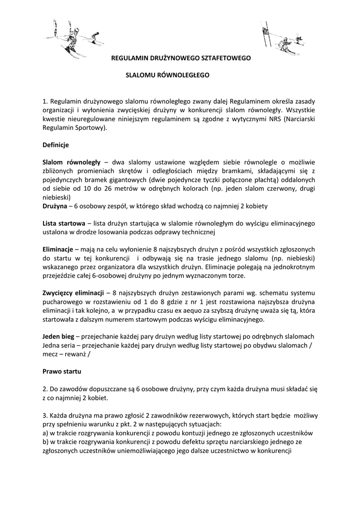 REGULAMIN DRUŻYNOWEGO SZTAFETOWEGO SLALOMU RÓWNOLEGŁEGO 1. Regulamin drużynowego slalomu równoległego zwany dalej Regulaminem określa zasady organizacji i wyłonienia zwycięskiej drużyny w konkurencji slalom równoległy. Wszystkie kwestie nieuregulowane niniejszym regulaminem są zgodne z wytycznymi NRS (Narciarski Regulamin Sportowy). Definicje Slalom równoległy – dwa slalomy ustawione względem siebie równolegle o możliwie zbliżonych promieniach skrętów i odległościach między bramkami, składającymi się z pojedynczych bramek gigantowych (dwie pojedyncze tyczki połączone płachtą) oddalonych od siebie od 10 do 26 metrów w odrębnych kolorach (np. jeden slalom czerwony, drugi niebieski) Drużyna – 6 osobowy zespół, w którego skład wchodzą co najmniej 2 kobiety Lista startowa – lista drużyn startująca w slalomie równoległym do wyścigu eliminacyjnego ustalona w drodze losowania podczas odprawy technicznej Eliminacje – mają na celu wyłonienie 8 najszybszych drużyn z pośród wszystkich zgłoszonych do startu w tej konkurencji i odbywają się na trasie jednego slalomu (np. niebieski) wskazanego przez organizatora dla wszystkich drużyn. Eliminacje polegają na jednokrotnym przejeździe całej 6-osobowej drużyny po jednym wyznaczonym torze. Zwycięzcy eliminacji – 8 najszybszych drużyn zestawionych parami wg. schematu systemu pucharowego w rozstawieniu od 1 do 8 gdzie z nr 1 jest rozstawiona najszybsza drużyna eliminacji i tak kolejno, a w przypadku czasu ex aequo za szybszą drużynę uważa się tą, która startowała z dalszym numerem startowym podczas wyścigu eliminacyjnego. Jeden bieg – przejechanie każdej pary drużyn według listy startowej po odrębnych slalomach Jedna seria – przejechanie każdej pary drużyn według listy startowej po obydwu slalomach / mecz – rewanż / Prawo startu 2. Do zawodów dopuszczane są 6 osobowe drużyny, przy czym każda drużyna musi składać się z co najmniej 2 kobiet. 3. Każda drużyna ma prawo zgłosić 2 zawodników rezerwowych, których start będzie możliwy przy spełnieniu warunku z pkt. 2 w następujących sytuacjach: a) w trakcie rozgrywania konkurencji z powodu kontuzji jednego ze zgłoszonych uczestników b) w trakcie rozgrywania konkurencji z powodu defektu sprzętu narciarskiego jednego ze zgłoszonych uczestników uniemożliwiającego jego dalsze uczestnictwo w konkurencji 4. Wprowadzenie zawodników rezerwowych do drużyny przy spełnieniu warunków z pkt. 3 może nastąpić dopiero po zakończeniu co najmniej jednego biegu i nigdy nie może nastąpić w trakcie trwania biegów. Zmiana zawodnika może nastąpić po przejeździe całej drużyny (6osób), ale nie może nastąpić w czasie trwania biegu. 5. Wszyscy zawodnicy w trakcie trwania konkurencji zobowiązani są do przestrzegania zasad fair play oraz zalecamy używanie kasków ochronnych. 6. Sprzęt jest serwisowany i sprawdzony na własną odpowiedzialność przez zawodników. Wyłonienie zwycięzcy jednej serii . 7. Zwycięską drużyną jednego biegu zostaje ta drużyna, która pierwsza ukończy przejazd po jednym slalomie i uzyska lepszy czas. Patrz pkt. 10 8. Zwycięską drużyną jednej serii zostaje ta drużyna, która w obydwu przejazdach(biegach) uzyska lepszy czas łączny od drużyny przeciwnej wyznaczonej zgodnie z listą startową, przy czym czasy przejazdów po każdym ze slalomów liczone są odrębnie i bieg ich rozpoczyna się wraz z momentem udzielenia komendy startowej przez startera , a kończy w momencie przekroczenia linii mety ostatniego zawodnika danej drużyny. 9. Do kolejnego etapu przechodzi zwycięska drużyna jednej serii czyli dwóch biegów (meczrewanż). 10. Przegrane drużyny jednej serii odpadają z dalszej rywalizacji 11. Zawodnicy startują kolejno po sobie, przy czym moment startu pierwszego zawodnika wyznacza starter komendą startową, a każdego następnego moment przekroczenia linii mety poprzedniego zawodnika drużyny w której startuje. Dla pierwszych zawodników z drużyny komenda startowa będzie brzmieć: „3,2,1 start” . Równocześnie zwolnione zostaną blokady obydwu bramek startowych i bramki samoczynnie się otworzą. Każdy kolejny zawodnik z drużyny bezzwłocznie ma stanąć w strefie startu tak, żeby jego start był możliwy od razu po przejechaniu przez linie mety jego poprzednika(kolegi z drużyny). Zaraz po starcie zawodnika bramka jest zamykana przez sędziego startu. Do czasu przekroczenia linii mety przez zawodnika bramka pozostaje zamknięta. Wjechanie na trasę przed zakończeniem zjazdu przez poprzednika oraz gdy zawodnik dopuścił się najechania bądź uderzenia bramki startowej skutkuje dyskwalifikacją całej drużyny. 12. Do uznania sumy czasu drużyny z jednego biegu konieczne jest prawidłowe ukończenie biegu/zjazdu każdego z jej zawodników. Prawidłowe ukończenie biegu oznacza, że zawodnik mija bramki jednego koloru po wyznaczonej trasie (np. niebieskie) z zastrzeżeniami., o których mowa w pkt.11 i 12 13. Wcześniejsze wystartowanie jednego z zawodników tj.: 1) przed komendą startową startera lub 2) przed przekroczeniem linii mety przez poprzedniego zawodnika jest równoważne z dyskwalifikacją całej drużyny. 14. Zawodnik może zostać zdyskwalifikowany przez organizatora zawodów w szczególności za : a) ominięcie startu lub mety tzn. nie przejechanie przez światło bramki startu lub bramki mety b) przejazd od startu do mety bez kompletnego ekwipunku c) jazdę po slalomie podczas oglądania trasy d) nie przestrzeganie NRS e) niesportowe zachowanie podczas zawodów f) najechanie bądź uderzenie bramki startowej 15. Upomnienie - kara czasowa: zespół otrzymuje karę czasową 5 sekund za trzykrotne upomnienie przez startera lub sędziego startu za przekroczenie linii startu zaznaczonej na śniegu podczas rozgrywania jednej serii ,o których mowa w pkt.1. Zespół może kontynuować zawody . 16. Zawodnik może kontynuować jazd