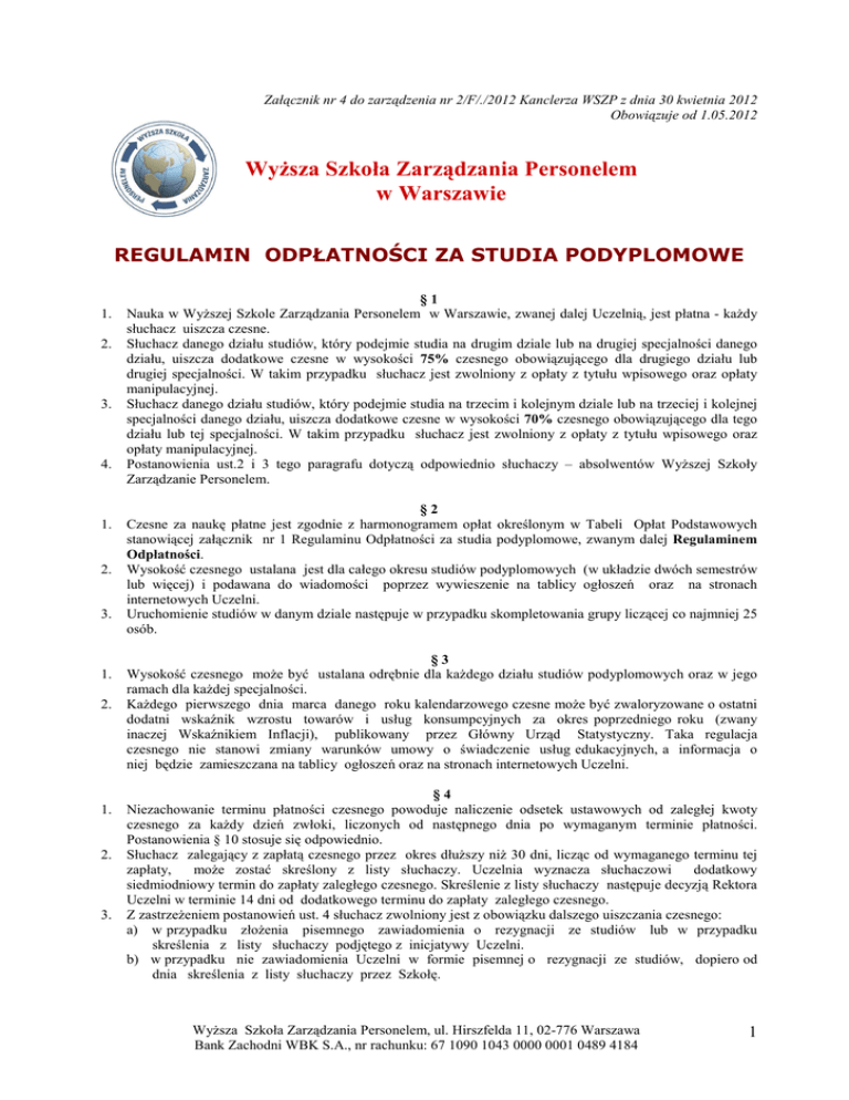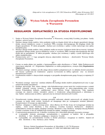Regulamin Odpłatności - Wyższa Szkoła Zarządzania Personelem