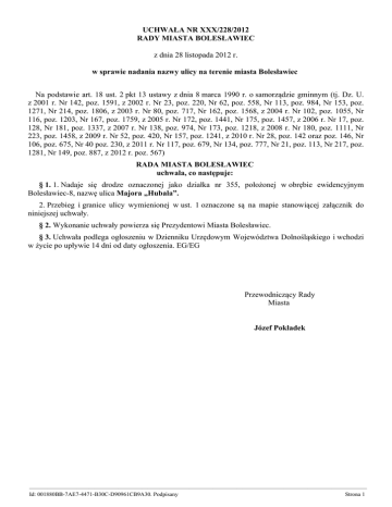 UCHWAŁA NR XXX/228/2012 RADY MIASTA BOLESŁAWIEC z dnia 28 listopada 2012 r. w sprawie nadania nazwy ulicy na terenie miasta Bolesławiec Na podstawie art. 18 ust. 2 pkt 13 ustawy z dnia 8 marca 1990 r. o samorządzie gminnym (tj. Dz. U. z 2001 r. Nr 142, poz. 1591, z 2002 r. Nr 23, poz. 220, Nr 62, poz. 558, Nr 113, poz. 984, Nr 153, poz. 1271, Nr 214, poz. 1806, z 2003 r. Nr 80, poz. 717, Nr 162, poz. 1568, z 2004 r. Nr 102, poz. 1055, Nr 116, poz. 1203, Nr 167, poz. 1759, z 2005 r. Nr 172, poz. 1441, Nr 175, poz. 1457, z 2006 r. Nr 17, poz. 128, Nr 181, poz. 1337, z 2007 r. Nr 138, poz. 974, Nr 173, poz. 1218, z 2008 r. Nr 180, poz. 1111, Nr 223, poz. 1458, z 2009 r. Nr 52, poz. 420, Nr 157, poz. 1241, z 2010 r. Nr 28, poz. 142 oraz poz. 146, Nr 106, poz. 675, Nr 40 poz. 230, z 2011 r. Nr 117, poz. 679, Nr 134, poz. 777, Nr 21, poz. 113, Nr 217, poz. 1281, Nr 149, poz. 887, z 2012 r. poz. 567) RADA MIASTA BOLESŁAWIEC uchwala, co następuje: § 1. 1. Nadaje się drodze oznaczonej jako działka nr 355, położonej w obrębie ewidencyjnym Bolesławiec-8, nazwę ulica Majora „Hubala”. 2. Przebieg i granice ulicy wymienionej w ust. 1 oznaczone są na mapie stanowiącej załącznik do niniejszej uchwały. § 2. Wykonanie uchwały powierza się Prezydentowi Miasta Bolesławiec. § 3. Uchwała podlega ogłoszeniu w Dzienniku Urzędowym Województwa Dolnośląskiego i wchodzi w życie po upływie 14 dni od daty ogłoszenia. EG/EG Przewodniczący Rady Miasta Józef Pokładek ————————————————————————————————————————————————————————— Id: 001880BB-7AE7-4471-B30C-D90961CB9A30. Podpisany Strona 1 ————————————————————————————————————————————————————————— Id: 001880BB-7AE7-4471-B30C-D90961CB9A30. Podpisany Strona 2 Uzasadnienie do uchwały nr XXX/228/2012 Rady Miasta Bolesławiec z dnia 28 listopada 2012 r. Major „Hubal” – Henryk Dobrzański , (1897 – 1940) właściwie Henryk Hubal-Dobrzański, pseudonim Hubal – major kawalerii Wojska Polskiego, olimpijczyk (jeździectwo), „zagończyk”, jeden z pierwszych dowódców partyzanckich w czasie II wojny światowej. Od 1920 roku członek Drużyn Strzeleckich, od 1914 roku w Legionach Polskich w 2 Pułku Ułanów. Od 1918 roku w Wojsku Polskim. W okresie dwudziestolecia międzywojennego uczestnik walk z Ukraińcami w 1918 roku oraz wojny polsko-bolszewickiej w latach 1919 – 1921. Odznaczony Krzyżem Walecznych i Srebrnym Krzyżem Orderu Virtuti Militari. Jako zastępca dowódcy 110 Pułku Rezerwowego Ułanów, brał udział w obronie Grodna przed wkraczającymi jednostkami Armii Czerwonej. Po kapitulacji Warszawy 27 września 1939 roku wraz z 50 swymi żołnierzami próbował przedostać się na teren Francji. 1 października 1939 roku stoczył bitwę z wojskami niemieckimi i schronił się na Kielecczyźnie. Po całkowitym załamaniu się kampanii wrześniowej, major H. Dobrzański, pod pseudonimem Hubal zorganizował pierwszy oddział partyzancki (Oddział Wydzielony Wojska Polskiego). Hubalczycy odnieśli swe pierwsze zwycięstwo w potyczce z Niemcami pod Cisownikiem. H. Dobrzański mimo rozkazów kierownictwa Związku Walki Zbrojnej i Delegatury Rządu na Kraj o rozwiązaniu oddziałów, nie podporządkował się rozkazowi. Postawa jego zwierzchników była spowodowana tym, iż za współpracę miejscowej ludności z „Hubalem” Niemcy nasilili represje w stosunku do tamtejszej ludności cywilnej. W marcu 1940 roku odniósł wielkie zwycięstwo w potyczce pod Hucisakmi, w której został zniszczony niemal całkowicie batalion piechoty Wehrmachtu. Podobny los spotkał kilka dni później kolejny oddział niemiecki pod Szałasami. 30 kwietnia 1940 roku oddział „Hubala” został otoczony przez siły niemieckie. W walce tej, podczas której Niemcy użyli czołgów, oddział partyzancki uległ rozproszeniu, a sam major poległ na polu walki. Jego ciało zostało najprawdopodobniej przez Niemców przewiezione do Tomaszowa Mazowieckiego i tam spalone. Oddział „Hubala” uległ samorozwiązaniu 25 czerwca 1940 roku. W 1966 roku Dobrzański został pośmiertnie odznaczony Złotym Krzyżem Orderu Virtuti Militari i awansowany do stopnia pułkownika. Nowa droga, położona w zachodniej części miasta Bolesławiec, stanowi działkę nr 355, położoną w obrębie: nr 0008, Bolesławiec-8. Przewodniczący Rady Miasta Józef Pokładek ————————————————————————————————————————————————————————— Id: 001880BB-7AE7-4471-B30C-D90961CB9A30. Podpisany Strona 1