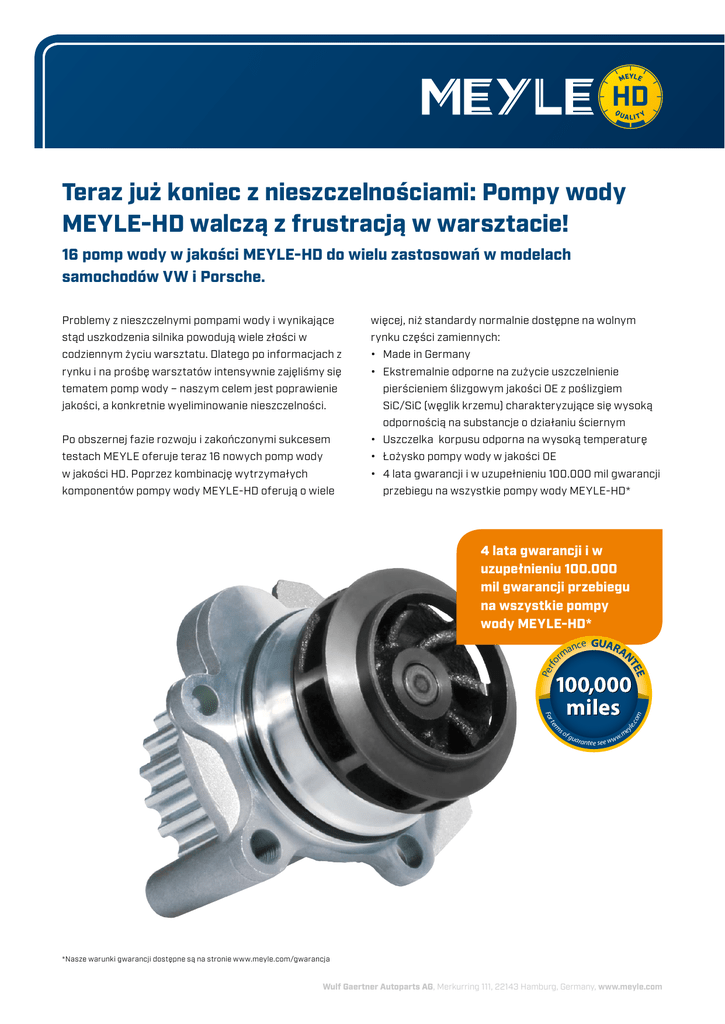 Teraz już koniec z nieszczelnościami: Pompy wody MEYLE-HD walczą z frustracją w warsztacie! 16 pomp wody w jakości MEYLE-HD do wielu zastosowań w modelach samochodów VW i Porsche. Problemy z nieszczelnymi pompami wody i wynikające więcej, niż standardy normalnie dostępne na wolnym stąd uszkodzenia silnika powodują wiele złości w rynku części zamiennych: codziennym życiu warsztatu. Dlatego po informacjach z • Made in Germany rynku i na prośbę warsztatów intensywnie zajęliśmy się • Ekstremalnie odporne na zużycie uszczelnienie tematem pomp wody – naszym celem jest poprawienie pierścieniem ślizgowym jakości OE z poślizgiem jakości, a konkretnie wyeliminowanie nieszczelności. SiC/SiC (węglik krzemu) charakteryzujące się wysoką odpornością na substancje o działaniu ściernym Po obszernej fazie rozwoju i zakończonymi sukcesem • Uszczelka korpusu odporna na wysoką temperaturę testach MEYLE oferuje teraz 16 nowych pomp wody • Łożysko pompy wody w jakości OE w jakości HD. Poprzez kombinację wytrzymałych • 4 lata gwarancji i w uzupełnieniu 100.000 mil gwarancji komponentów pompy wody MEYLE-HD oferują o wiele przebiegu na wszystkie pompy wody MEYLE-HD* e anc rm For m ter so f gu y le .co m Per fo 4 lata gwarancji i w uzupełnieniu 100.000 mil gwarancji przebiegu na wszystkie pompy wody MEYLE-HD* e .m arante see www e *Nasze warunki gwarancji dostępne są na stronie www.meyle.com/gwarancja Wulf Gaertner Autoparts AG, Merkurring 111, 22143 Hamburg, Germany, www.meyle.com MEYLE-Nr.: Zastosowanie w samochodach 113 220 0018/HD pasuje do silników wysokoprężnych VW 1.9–2.0 TDI 113 012 0042/HD pasuje do silników wysokoprężnych VW 2.5 TDI 113 220 0005/HD pasuje do silników wysokoprężnych VW 2.5 TDI 113 012 0033/HD pasuje do silników benzynowych VW 1.6i | 1.8i | 2.0i 113 220 0023/HD pasuje do silników benzynowych VW 1.8 TSI | 2.0 TSI 113 220 0011/HD pasuje do silników benzynowych VW 2.0 TFSI 113 220 0021/HD pasuje do silników wysokoprężnych VW 1.2 , 1.6 und 2.0 TDI 113 012 0027/HD pasuje do silników benzynowych VW 1.8 | 1.8 GTI | 1.8T | 2.0 113 012 0040/HD pasuje do silników benzynowych VW 1.4 | 1.4 16V 113 012 0056/HD pasuje do silników wysokoprężnych VW 1.2 TDI | 1.4 TDI | 1.9 TDI | 2.0 SDI 113 220 0006/HD pasuje do silników wysokoprężnych i silników benzynowych VW 2.4 | 2.7 | 3.0 | 3.1 | 3.2 113 220 0017/HD pasuje do silników benzynowych Audi“ 2.8 | 3.2 413 220 0000/HD pasuje do silników Porsche 2.5 | 2.7 | 3.4 | 3.6 | S 3.2 413 220 0001/HD pasuje do silników Porsche 3.0 | 3.6 Turbo | 4.8 | 4.8 GTS | 4.8 Turbo | 4.8 Turbo S | GTS 4.8 | S 4.8 | Turbo S 4.8 413 220 0002/HD pasuje do silników Porsche 4.5 | Turbo 4.5 413 220 0003/HD pasuje do silników Porsche 2.7 | 3.2 | 3.4 | 3.6 | 3.8 Informacja Przy wymianie pompy wody należy zawsze dokładnie wypłukać cały układ chłodzenia i napełnić przewidzianym płynem chłodniczym. Stosować się do zaleceń producenta. Wulf Gaertner Autoparts AG, Merkurring 111, 22143 Hamburg, Germany, www.meyle.com
