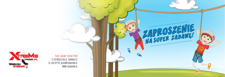 Park linowy Xtreme PArk 32-020 Wieliczka ul. Jedynaka 15 tel. 600 309 509, [email protected] WWW.xtremepark.pl zAPRASZAM ............................................................................................... na super zabawę .................................................................................... w DNIU ...............................................O GODZINIE.................................. w PARKU LINOWYM XTREME PARK, WIELICZKA, jEDYNAKA 15 NA TERENIE UŻYTKU EKOLOGICZNEGO GRABÓWKI PROSIMY O POTWIERDZENIE PRZYJŚCIA ..................................................................