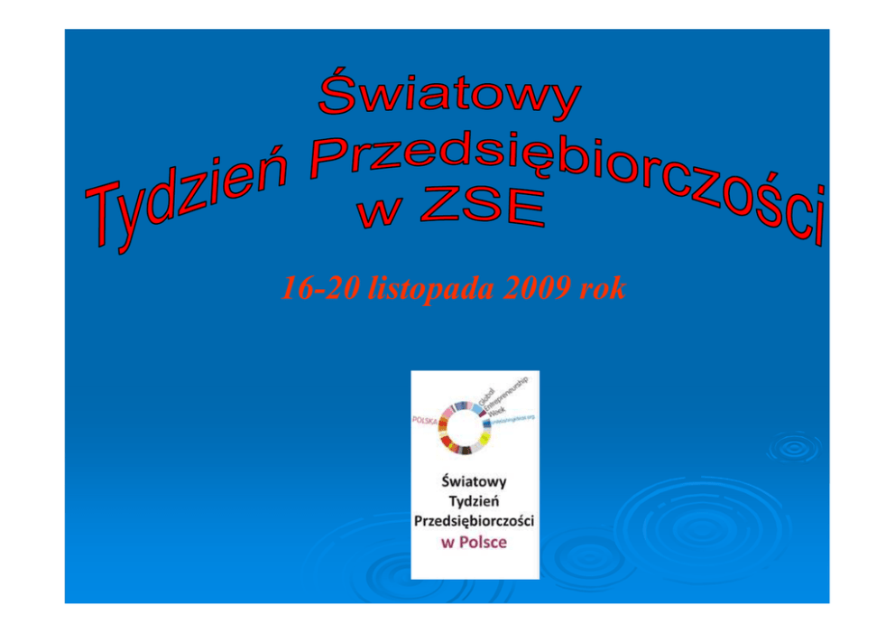 16-20 listopada 2009 rok Przedsiębiorczy poniedziałek czyli najwaŜniejszy jest początek „Kto zaczął to jakby zrobił połowę” 1. 2. 3. Udział uczniów i nauczycieli w inauguracji ŚTP w UM w konferencji „Przedsiębiorczość jako kluczowa umiejętność” Warsztaty z komunikacji interpersonalnej klasa technik org. usług gastronomicznych Warsztaty dla samorządów uczniowskich _J.Kałuda UM 4 Warsztaty dla młodzieŜy z klasy III THot „Asertywność sposobem na stres”stres”- zajęcia z psychologiem – p. Joanną Kapuścińską 5. W ramach projektu „Otwarta firma„ lekcja „Biznes przy tablicy” spotkanie dyrektora firmy WORK EKSPRES Przemysława Mrozika z uczniami technikum logistycznego Przedsiębiorczy wtorek czyli…. dobre przykłady pociągają 1. Udział młodzieŜy w warsztatach w WSB 2. Lekcja „Biznes przy tablicy” - spotkanie z Wiceprezesem KEM-3 sp. z o.o. p. Sławomirem Lassokiem klasa III Tg/IIITHot „Biznes w usługach branŜy hotelarsko- gastronomicznej „ Przedsiębiorcza środa czyli… wykorzystujemy szanse z otoczenia 1. Wizyta studyjna przedstawicieli przedsiębiorców z Włoch. 2. Warsztaty dla nauczycieli „Efektywna komunikacja kluczem do sukcesu” PPP. 3. Dzień bankowy„Poznajemy produkty bankowe – minimalizujemy ryzyko” prelekcje 4 banki. Przedsiębiorczy czwartek czyli … od pomysłu się zaczyna 1. Rozstrzygnięcie szkolnego konkursu „Mój pomysł na biznes” I m. Katarzyna Kowalczyk i Robert Surmacz z ZSE 2. Lekcja „Biznes przy tablicy” spotkanie z właścicielem sklepu „śabka” p. Zdzisławą Trzcińską lekcja otwarta ZPE na temat temat:: „Franszyza sposobem na własny biznes” biznes”.. Udział klasy III TH/III TOUG. TOUG. 3. Wykład „Informatyka w biznesie” dr Janusz Trawka z WyŜszej Szkoły Bankowości i Finansów. Udział klas: IV TE/TH, II TE 4. Dzień filmowy „Moja kariera zawodowa” (Przygotowujemy się do wejścia na rynek pracy) 5. Wycieczka przedmiotowa do PWiK – kl. III TE 6. Wycieczka przedmiotowa do KEM--3: - kl. I Hot/Tur KEM Przedsiębiorczy piątek czyli ….. 1. Lekcja „Biznes przy tablicy” spotkanie z Prezesem Zarządu Huta Bankowa sp. z o. o. Jadwigą Dyktus. 2. Apel podsumowujący ŚTP w ZSE „przedsiębiorcze działanie wyraŜone przez śpiewanie” 3. Udział w MBP * w spotkaniu z przedst.. Lewiatan – „Anioły Biznesu”; * warsztaty AE ; 4. Udział w konferencji podsumowujacej ŚTP w MBP - III TE. I tak się kończy „przedsiębiorczy tydzień”. tydzień”. Kolejny poniedziałek przyniesie nowe wyzwania i kaŜdy kolejny dzień będzie nowym sprawdzianem skuteczności naszych działań. działań. Bo przedsiębiorczym trzeba być nie tylko w tygodniu przedsiębiorczości ale na co dzień, chcąc sprostać wymogom współczesnego świata i gospodarki opartej na wiedzy wiedzy.. Przedsiębiorczość to wymóg naszych czasów
