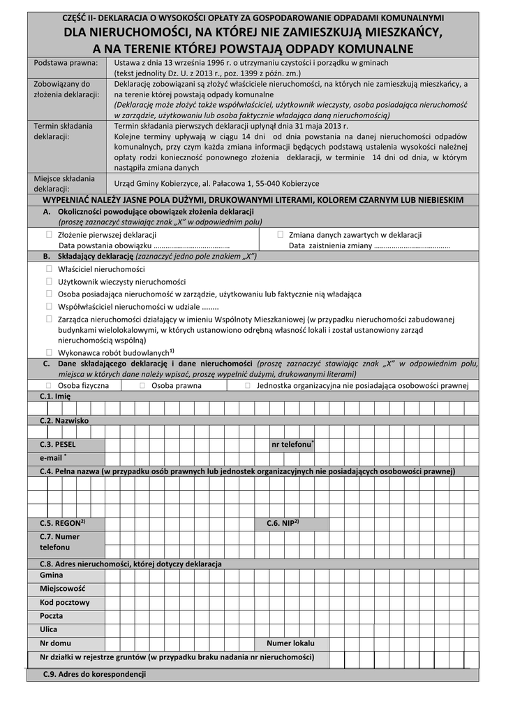CZĘŚĆ II- DEKLARACJA O WYSOKOŚCI OPŁATY ZA GOSPODAROWANIE ODPADAMI KOMUNALNYMI DLA NIERUCHOMOŚCI, NA KTÓREJ NIE ZAMIESZKUJĄ MIESZKAŃCY, A NA TERENIE KTÓREJ POWSTAJĄ ODPADY KOMUNALNE Podstawa prawna: Zobowiązany do złożenia deklaracji: Termin składania deklaracji: Miejsce składania deklaracji: Ustawa z dnia 13 września 1996 r. o utrzymaniu czystości i porządku w gminach (tekst jednolity Dz. U. z 2013 r., poz. 1399 z późn. zm.) Deklarację zobowiązani są złożyć właściciele nieruchomości, na których nie zamieszkują mieszkańcy, a na terenie której powstają odpady komunalne (Deklarację może złożyć także współwłaściciel, użytkownik wieczysty, osoba posiadająca nieruchomość w zarządzie, użytkowaniu lub osoba faktycznie władająca daną nieruchomością) Termin składania pierwszych deklaracji upłynął dnia 31 maja 2013 r. Kolejne terminy upływają w ciągu 14 dni od dnia powstania na danej nieruchomości odpadów komunalnych, przy czym każda zmiana informacji będących podstawą ustalenia wysokości należnej opłaty rodzi konieczność ponownego złożenia deklaracji, w terminie 14 dni od dnia, w którym nastąpiła zmiana danych Urząd Gminy Kobierzyce, al. Pałacowa 1, 55-040 Kobierzyce WYPEŁNIAĆ NALEŻY JASNE POLA DUŻYMI, DRUKOWANYMI LITERAMI, KOLOREM CZARNYM LUB NIEBIESKIM A. Okoliczności powodujące obowiązek złożenia deklaracji (proszę zaznaczyć stawiając znak „X” w odpowiednim polu) Złożenie pierwszej deklaracji Data powstania obowiązku ………………………………… B. Składający deklarację (zaznaczyć jedno pole znakiem „X”) Zmiana danych zawartych w deklaracji Data zaistnienia zmiany ………………………………… Właściciel nieruchomości Użytkownik wieczysty nieruchomości Osoba posiadająca nieruchomość w zarządzie, użytkowaniu lub faktycznie nią władająca Współwłaściciel nieruchomości w udziale ........ Zarządca nieruchomości działający w imieniu Wspólnoty Mieszkaniowej (w przypadku nieruchomości zabudowanej budynkami wielolokalowymi, w których ustanowiono odrębną własność lokali i został ustanowiony zarząd nieruchomością wspólną) Wykonawca robót budowlanych1) C. Dane składającego deklarację i dane nieruchomości (proszę zaznaczyć stawiając znak „X” w odpowiednim polu, miejsca w których dane należy wpisać, proszę wypełnić dużymi, drukowanymi literami) Osoba fizyczna Osoba prawna Jednostka organizacyjna nie posiadająca osobowości prawnej C.1. Imię C.2. Nazwisko C.3. PESEL nr telefonu* e-mail * C.4. Pełna nazwa (w przypadku osób prawnych lub jednostek organizacyjnych nie posiadających osobowości prawnej) C.5. REGON2) C.6. NIP2) C.7. Numer telefonu C.8. Adres nieruchomości, której dotyczy deklaracja Gmina Miejscowość Kod pocztowy Poczta Ulica Nr domu Numer lokalu Nr działki w rejestrze gruntów (w przypadku braku nadania nr nieruchomości) C.9. Adres do korespondencji Adres do korespondencji składającego deklarację (lub adres siedziby składającego deklarację) jest taki sam jak adres nieruchomości, której dotyczy deklaracja (proszę zaznaczyć stawiając znak „X”, gdy adres zamieszkania jest taki sam jak adres nieruchomości i pominąć pozostałą część punktu C.9.) Gmina Miejscowość Kod pocztowy Poczta Ulica Nr domu Nr lokalu D. Dane na temat sposobu zbierania i magazynowania odpadów (proszę zaznaczyć stawiając znak „X” w odpowiednim polu) D.1. Sposób zbierania odpadów Odpady komunalne będą zbierane w sposób selektywny zgodnie z regulaminem utrzymania czystości i porządku na terenie gminy Kobierzyce Odpady komunalne nie będą zbierane w sposób selektywny D.2. Sposób magazynowania odpadów Pojemniki przeznaczone wyłącznie dla składającego deklarację Boks śmietnikowy, altana śmietnikowa, plac (np. w przypadku kilku podmiotów korzystających z jednego boksu, altany, placu) E. Opłata miesięczna za gospodarowanie odpadami komunalnymi (dotyczy ilości pojemników danego rodzaju dla odpadów komunalnych) E.1. Źródła wytwarzania odpadów komunalnych3) Źródło wytwarzanych odpadów komunalnych Ilość poszczególnych źródeł wytwarzania odpadów komunalnych a Wskaźnik dla wytwarzanych odpadów komunalnych w l b pracownik 15 student/uczeń/dziecko 3 łóżko szpitalne/miejsce sypialne/ miejsce konsumpcyjne 20 punkt handlowy 60 działka 12 miejsce na widowni w teatrze, salach 1 miejsce na widowni w kinie / miejsce grzebalne 2 Minimalna pojemność pojemników w l według Regulaminu Iloczyn ilości i wskaźnika (a*b) c E.2. Deklaracja ilości pojemników do zbierania odpadów komunalnych odbieranych z terenu nieruchomości 4) (należy wpisać ilość pojemników jaka będzie ustawiona na terenie nieruchomości, której dotyczy deklaracja) Deklaruję następującą ilość pojemników przeznaczonych do zbierania niesegregowanych (zmieszanych) odpadów komunalnych4) - częstotliwość odbioru 1 raz na 2 tygodnie 120 l Deklaruję następującą ilość pojemników przeznaczonych do zbierania odpadów surowcowych4) - częstotliwość odbioru 1 raz na 2 tygodnie 240 l 1100 l inna pojemność w l .................. inna pojemność w l .................. 120 l 240 l 1100 l inna pojemność w l ..................... inna pojemność w l .................. E.3. Wysokość opłaty za jednorazowe opróżnienie pojemnika o określonej pojemności Stawki opłaty w przypadku Stawki opłaty w przypadku selektywnej zbiórki odpadów braku selektywnej zbiórki odpadów (odpady zmieszane i odpady surowcowe) Pojemnik 120 l 16,50 zł 37,00 zł Pojemnik 240 l 31,50 zł 73,00 zł Pojemnik 1100 l 132,50 zł 306,00 zł Pojemniki o pojemności powyżej 1100 l 0,10 zł za każdy litr 0,20 zł za każdy litr Prasokontenery 0,40 zł za każdy litr 0,60 zł za każdy litr E.4. Obliczenie stawki opłaty miesięcznej dla nieruchomości, na której nie zamieszkują mieszkańcy, a na terenie której powstają odpad