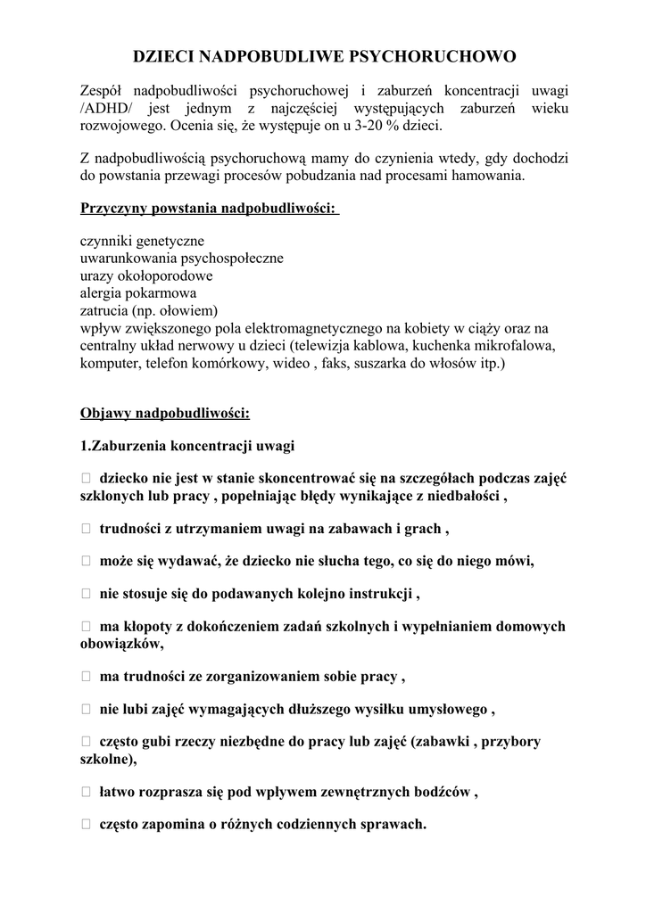 DZIECI NADPOBUDLIWE PSYCHORUCHOWO Zespół nadpobudliwości psychoruchowej i zaburzeń koncentracji uwagi /ADHD/ jest jednym z najczęściej występujących zaburzeń wieku rozwojowego. Ocenia się, że występuje on u 3-20 % dzieci. Z nadpobudliwością psychoruchową mamy do czynienia wtedy, gdy dochodzi do powstania przewagi procesów pobudzania nad procesami hamowania. Przyczyny powstania nadpobudliwości: czynniki genetyczne uwarunkowania psychospołeczne urazy okołoporodowe alergia pokarmowa zatrucia (np. ołowiem) wpływ zwiększonego pola elektromagnetycznego na kobiety w ciąży oraz na centralny układ nerwowy u dzieci (telewizja kablowa, kuchenka mikrofalowa, komputer, telefon komórkowy, wideo , faks, suszarka do włosów itp.) Objawy nadpobudliwości: 1.Zaburzenia koncentracji uwagi dziecko nie jest w stanie skoncentrować się na szczegółach podczas zajęć szklonych lub pracy , popełniając błędy wynikające z niedbałości , trudności z utrzymaniem uwagi na zabawach i grach , może się wydawać, że dziecko nie słucha tego, co się do niego mówi, nie stosuje się do podawanych kolejno instrukcji , ma kłopoty z dokończeniem zadań szkolnych i wypełnianiem domowych obowiązków, ma trudności ze zorganizowaniem sobie pracy , nie lubi zajęć wymagających dłuższego wysiłku umysłowego , często gubi rzeczy niezbędne do pracy lub zajęć (zabawki , przybory szkolne), łatwo rozprasza się pod wpływem zewnętrznych bodźców , często zapomina o różnych codziennych sprawach. 2. Nadruchliwość nerwowe ruchy rąk lub stóp , nie może usiedzieć w miejscu , wstaje z miejsca w czasie lekcji lub zajęć , chodzi po mieszkaniu lub wspina się na meble , trudności ze spokojnym bawieniem się lub odpoczywaniem , pozostaje niemalże cały czas w ruchu - "biega jak nakręcone" , jest nadmiernie gadatliwe , nie potrafi się sprawnie ubrać czy spakować swoich rzeczy , niszczy rzeczy znajdujące się wokół niego , bazgrze po zeszycie, obgryza ołówek , skrobie po ławce. 3. Impulsywność wyrywa się z odpowiedzią zanim zostanie sformułowane pytanie , często przerywa lub przeszkadza innym , jest konfliktowe , agresywne , obraża się , ma kłopoty z zaczekaniem na swoją kolej. Rozpoznanie Zespół nadpobudliwości psychoruchowej rozpoznaje się po analizie informacji i zachowaniu się dziecka w domu, przedszkolu lub w szkole, badaniu lekarskim pediatrycznym, konsultacji neurologicznej i psychologicznej z wykonaniem niezbędnych badań dodatkowych ( w tym często EEG). Wskazana jest często opieka psychiatry dziecięcego. Nadpobudliwość ujawnia się zazwyczaj przed 5 rokiem życia, najpóźniej przed siódmym. U dziewczynek przeważają głównie objawy związane z zaburzeniami koncentracji uwagi , a u chłopców częściej nadruchliwość i impulsywność. Jak pomóc dziecku nadpobudliwemu ? Każde dziecko potrzebuje wiele zrozumienia, a dziecko nadpobudliwe szczególnie dużo. Warto pamiętać, że jego zachowanie, męczące dla otoczenia, jemu samemu sprawia również poważne problemy. Trudniej mu znaleźć przyjaciół, trudniej osiągnąć sukces w szkole, trudniej usłyszeć pochwałę od rodziców. Nadpobudliwi oceniani są jako niegrzeczni , niewspółpracujący, złośliwi i bardzo trudni wychowawczo. Pamiętajmy! Dzieciom nadpobudliwym jest znacznie trudniej żyć i rozwijać się niż większości ich rówieśników. Takie dziecko żyje w świecie wewnętrznego niepokoju i dlatego świat wokół niego powinien być bardzo uporządkowany: Wprowadź rutynę Ograniczaj bodźce Mów jasno Staraj się być cierpliwa, cierpliwy Zadbaj o dobre miejsce do pracy Nie bądź zbyt rygorystyczna Leczenie 1.Psychoedukacja poradnictwo dla rodziców i nauczycieli praca z dzieckiem - trening: zabawy , rozwiązywanie problemów, kontrolowanie agresji 2.Zmiana metod wychowawczych zwracanie uwagi na dziecko tylko w sytuacjach, gdy jest "niegrzeczne", jest nagrodą za jego niegrzeczność - bo tylko wtedy poświęca się mu chwilę uwagi. 3 . Dostosowanie metod nauczania do możliwości dziecka częste przerwy w pracy do czasu możliwej pełnej koncentracji dziecka posadzenie dziecka nadpobudliwego w pierwszej ławce , najlepiej ze spokojnym kolegą angażowanie dziecka w działania ruchowe , gdy tylko jest to możliwe (zetrzyj tablicę, przynieś kredę, rozdaj zeszyty itp.) 4.Farmakoterapia (stosowanie leków pod kontrolą lekarza) 10 próśb dziecka nadpobudliwego 1. Pomóż mi skupić się na jednej czynności. 2. Chcę wiedzieć, co się zdarzy za chwilę. 3. Poczekaj na mnie, pozwól mi się zastanowić. 4. Jestem w kropce, nie potrafię tego robić, pokaż mi wyjście z tej sytuacji. 5. Chciałbym od razu wiedzieć, czy to, co robię, jest zrobione dobrze. 6. Dawaj mi tylko jedno polecenie na raz. 7. Przypomnij mi, żebym się zatrzymał i pomyślał. 8. Dawaj mi małe zadania do wykonania; kiedy cel jest daleko, gubię się. 9. Chwal mnie choć raz dziennie, bardzo tego potrzebuję. 10. Wiem, że potrafię być męczący, ale czuję, że rosnę, kiedy okazujesz mi, jak mnie kochasz. Należy pamiętać, że mimo iż nadpobudliwość jest jednym z najczęstszych, najbardziej stałych oraz trudnych w leczeniu zaburzeń zachowania w wieku dziecięcym, to systematyczna, cierpliwa i kompleksowa terapia ukierunkowana jednocześnie na dziecko i jego otoczenie, przynosi zwykle wyraźne efekty.