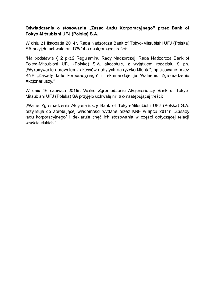 Oświadczenie o stosowaniu „Zasad Ładu Korporacyjnego” przez Bank of Tokyo-Mitsubishi UFJ (Polska) S.A. W dniu 21 listopada 2014r. Rada Nadzorcza Bank of Tokyo-Mitsubishi UFJ (Polska) SA przyjęła uchwałę nr. 176/14 o następującej treści: “Na podstawie § 2 pkt.2 Regulaminu Rady Nadzorczej, Rada Nadzorcza Bank of Tokyo-Mitsubishi UFJ (Polska) S.A. akceptuje, z wyjątkiem rozdziału 9 pn. „Wykonywanie uprawnień z aktywów nabytych na ryzyko klienta”, opracowane przez KNF „Zasady ładu korporacyjnego” i rekomenduje je Walnemu Zgromadzeniu Akcjonariuszy.” W dniu 16 czerwca 2015r. Walne Zgromadzenie Akcjonariuszy Bank of TokyoMitsubishi UFJ (Polska) SA przyjęło uchwałę nr. 6 o następującej treści: „Walne Zgromadzenia Akcjonariuszy Bank of Tokyo-Mitsubishi UFJ (Polska) S.A. przyjmuje do aprobującej wiadomości wydane przez KNF w lipcu 2014r. „Zasady ładu korporacyjnego” i deklaruje chęć ich stosowania w części dotyczącej relacji właścicielskich.”