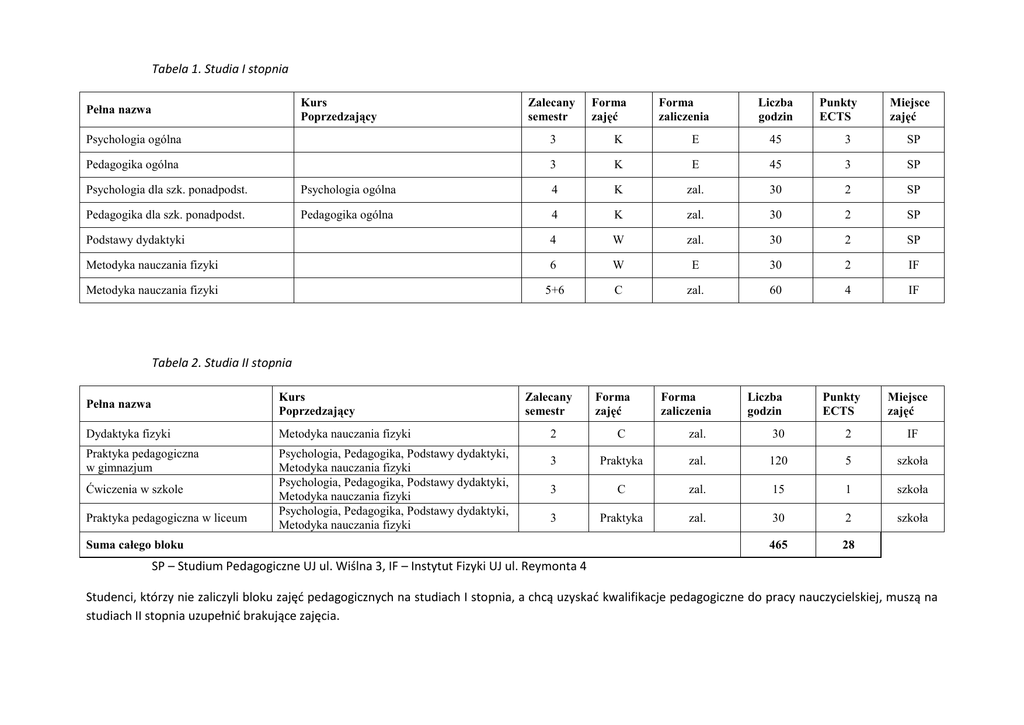 Tabela 1. Studia I stopnia Kurs Poprzedzający Pełna nazwa Zalecany semestr Forma zajęć Forma zaliczenia Liczba godzin Punkty ECTS Miejsce zajęć Psychologia ogólna 3 K E 45 3 SP Pedagogika ogólna 3 K E 45 3 SP Psychologia dla szk. ponadpodst. Psychologia ogólna 4 K zal. 30 2 SP Pedagogika dla szk. ponadpodst. Pedagogika ogólna 4 K zal. 30 2 SP Podstawy dydaktyki 4 W zal. 30 2 SP Metodyka nauczania fizyki 6 W E 30 2 IF Metodyka nauczania fizyki 5+6 C zal. 60 4 IF Tabela 2. Studia II stopnia Pełna nazwa Kurs Poprzedzający Dydaktyka fizyki Metodyka nauczania fizyki Praktyka pedagogiczna w gimnazjum Psychologia, Pedagogika, Podstawy dydaktyki, Metodyka nauczania fizyki Psychologia, Pedagogika, Podstawy dydaktyki, Metodyka nauczania fizyki Psychologia, Pedagogika, Podstawy dydaktyki, Metodyka nauczania fizyki Ćwiczenia w szkole Praktyka pedagogiczna w liceum Zalecany semestr Forma zajęć Forma zaliczenia Liczba godzin Punkty ECTS Miejsce zajęć 2 C zal. 30 2 IF 3 Praktyka zal. 120 5 szkoła 3 C zal. 15 1 szkoła 3 Praktyka zal. 30 2 szkoła 465 28 Suma całego bloku SP – Studium Pedagogiczne UJ ul. Wiślna 3, IF – Instytut Fizyki UJ ul. Reymonta 4 Studenci, którzy nie zaliczyli bloku zajęć pedagogicznych na studiach I stopnia, a chcą uzyskać kwalifikacje pedagogiczne do pracy nauczycielskiej, muszą na studiach II stopnia uzupełnić brakujące zajęcia.
