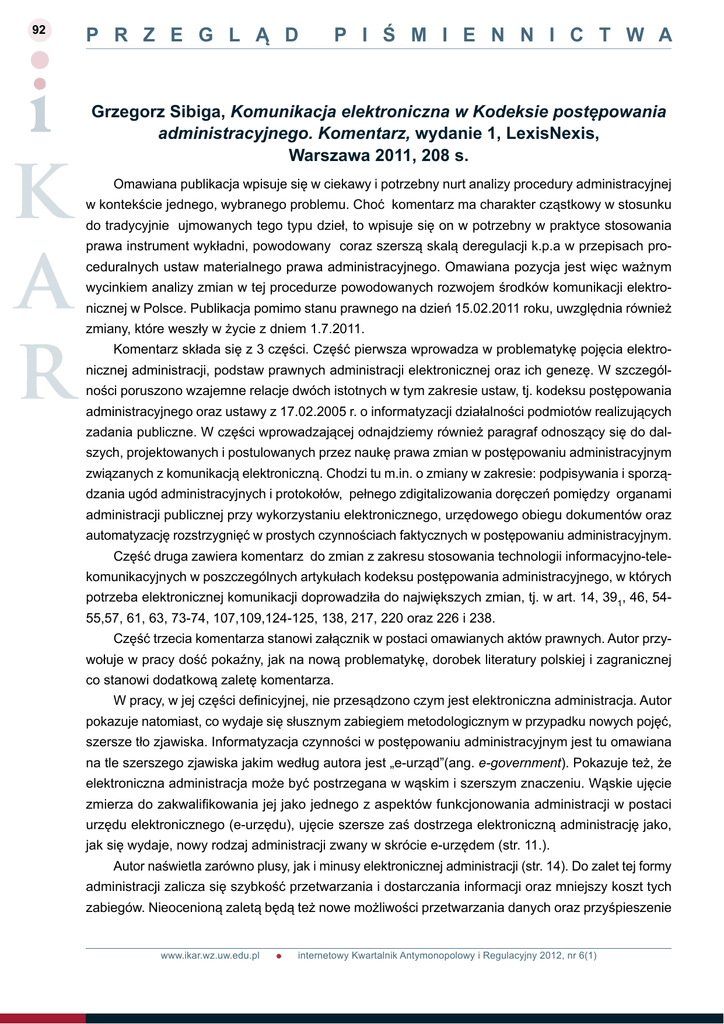 92 P R Z E G L Ą D P I Ś M I E N N I C T W A Michał Możdżeń-Marcinkowski Grzegorz Sibiga, Komunikacja elektroniczna w Kodeksie postępowania administracyjnego. Komentarz, wydanie 1, LexisNexis, Warszawa 2011, 208 s. Omawiana publikacja wpisuje się w ciekawy i potrzebny nurt analizy procedury administracyjnej w kontekście jednego, wybranego problemu. Choć komentarz ma charakter cząstkowy w stosunku do tradycyjnie ujmowanych tego typu dzieł, to wpisuje się on w potrzebny w praktyce stosowania prawa instrument wykładni, powodowany coraz szerszą skalą deregulacji k.p.a w przepisach proceduralnych ustaw materialnego prawa administracyjnego. Omawiana pozycja jest więc ważnym wycinkiem analizy zmian w tej procedurze powodowanych rozwojem środków komunikacji elektronicznej w Polsce. Publikacja pomimo stanu prawnego na dzień 15.02.2011 roku, uwzględnia również zmiany, które weszły w życie z dniem 1.7.2011. Komentarz składa się z 3 części. Część pierwsza wprowadza w problematykę pojęcia elektronicznej administracji, podstaw prawnych administracji elektronicznej oraz ich genezę. W szczególności poruszono wzajemne relacje dwóch istotnych w tym zakresie ustaw, tj. kodeksu postępowania administracyjnego oraz ustawy z 17.02.2005 r. o informatyzacji działalności podmiotów realizujących zadania publiczne. W części wprowadzającej odnajdziemy również paragraf odnoszący się do dalszych, projektowanych i postulowanych przez naukę prawa zmian w postępowaniu administracyjnym związanych z komunikacją elektroniczną. Chodzi tu m.in. o zmiany w zakresie: podpisywania i sporządzania ugód administracyjnych i protokołów, pełnego zdigitalizowania doręczeń pomiędzy organami administracji publicznej przy wykorzystaniu elektronicznego, urzędowego obiegu dokumentów oraz automatyzację rozstrzygnięć w prostych czynnościach faktycznych w postępowaniu administracyjnym. Część druga zawiera komentarz do zmian z zakresu stosowania technologii informacyjno-telekomunikacyjnych w poszczególnych artykułach kodeksu postępowania administracyjnego, w których potrzeba elektronicznej komunikacji doprowadziła do największych zmian, tj. w art. 14, 391, 46, 5455,57, 61, 63, 73-74, 107,109,124-125, 138, 217, 220 oraz 226 i 238. Część trzecia komentarza stanowi załącznik w postaci omawianych aktów prawnych. Autor przywołuje w pracy dość pokaźny, jak na nową problematykę, dorobek literatury polskiej i zagranicznej co stanowi dodatkową zaletę komentarza. W pracy, w jej części definicyjnej, nie przesądzono czym jest elektroniczna administracja. Autor pokazuje natomiast, co wydaje się słusznym zabiegiem metodologicznym w przypadku nowych pojęć, szersze tło zjawiska. Informatyzacja czynności w postępowaniu administracyjnym jest tu omawiana na tle szerszego zjawiska jakim według autora jest „e-urząd”(ang. e-government). Pokazuje też, że elektroniczna administracja może być postrzegana w wąskim i szerszym znaczeniu. Wąskie ujęcie zmierza do zakwalifikowania jej jako jednego z aspektów funkcjonowania administracji w postaci urzędu elektronicznego (e-urzędu), ujęcie szersze zaś dostrzega elektroniczną administrację jako, jak się wydaje, nowy rodzaj administracji zwany w skrócie e-urzędem (str. 11.). Autor naświetla zarówno plusy, jak i minusy elektronicznej administracji (str. 14). Do zalet tej formy administracji zalicza się szybkość przetwarzania i dostarczania informacji oraz mniejszy koszt tych zabiegów. Nieocenioną zaletą będą też nowe możliwości przetwarzania danych oraz przyśpieszenie www.ikar.wz.uw.edu.pl internetowy Kwartalnik Antymonopolowy i Regulacyjny 2012, nr 6(1) 93 Michał Możdżeń-Marcinkowski Grzegorz Sibiga, Komunikacja elektroniczna w Kodeksie postępowania administracyjnego... wielu procedur. Wadą tych procesów jest jednak, jak słusznie podkreślono, złe korzystanie z tych technik oraz brak zaufania do nich społeczeństwa, co przy słabym i wąskim ich wykorzystaniu czyni koszty informatyzacji niewspółmierne do efektów. Pomimo braku propozycji własnej definicji elektronicznej administracji G. Sibiga pokazuje, co cenne dla dalszych jej badań, pewne instrumenty służące do analizy tego zjawiska (str. 12). Chodzi tu o wyodrębnienie dwóch płaszczyzn, organizacyjnych części składowych e-adminstracji tj. front-office oraz back-office. Pierwsza płaszczyzna wydaje się być polskim odpowiednikiem obsługi zewnętrznej obywateli, drugą zaś sam autor określa jako „zaplecze administracji”. Cennym fragmentem opracowania jest także krótka ocena ustawy o informatyzacji działalności podmiotów realizujących zadania publiczne. Autor pokazuje, iż ustawa ta nie obejmuje jednolitej kategorii przepisów (str. 21). Spośród trzech wymienionych w tej ustawie kategorii przepisów, komentowane przepisy kodeksu postępowania administracyjnego pozycjonować należy w trzeciej spośród nich a mianowicie w grupie przepisów dostosowujących zadania i czynności określone w ustawach szczególnych (materialnych i procesowych) do rozwiązań przewidzianych w ustawie o informatyzacji. Taki też jest cel zmian w kodeksie postępowania administracyjnego, które w sposób systematyczny zostały zreferowane w omawianej pracy (str. 23-29). Bardzo cennym elementem opracowania jest analiza wzajemnych relacji k.p.a i ustawy o informatyzacji działalności podmiotów realizujących zadania publiczne. Szczególną uwagę zwraca się na listę wzajemnych odesłań w obydwóch aktach prawnych (str. 31). Rzeczywiście skala odesłań związanych z elektroniczną administracją jest niespotykana w całym okresie obowiązywania k.p.a, to jest od 1961 roku. Istotną wadą zabiegu sprzężenia dwóch ustaw, poprzez liczne odesłania, na co pośrednio wskazuje autor (str. 35) jest jednak ryzyko utrudnień przy stosowaniu k.p.a w sytuacji różnorakich problemów z ustawą o informatyzacji. Problemy te mog