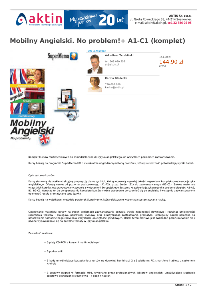 Mobilny Angielski. No problem!+ A1-C1 (komplet) Twój konsultant Arkadiusz Trzebiński tel. 503 030 555 [email protected] NOWOŚĆ W OFERCIE 144.90 zł 144.90 zł z VAT Karina Gładecka 796 603 606 [email protected] Komplet kursów multimedialnych do samodzielnej nauki języka angielskiego, na wszystkich poziomach zaawansowania. Kursy bazują na programie SuperMemo UX z wielokrotnie nagradzaną metodą powtórek, której skuteczność potwierdzają wyniki badań. Opis zestawu kursów: Kursy stanowią niezwykle atrakcyjną propozycję dla wszystkich, którzy oczekują wysokiej jakości wsparcia w kompleksowej nauce języka angielskiego. Oferują naukę od poziomu podstawowego (A1-A2), przez średni (B1) do zaawansowanego (B2-C1). Zakres materiału wszystkich kursów jest przygotowany zgodnie z wytycznymi Europejskiego Systemu Kształcenia Językowego dla poziomu biegłości A1-A2, B1, B2-C1. Oznacza to, że po opanowaniu kompletu kursów można swobodnie porozumieć się po angielsku i w stopniu zaawansowanym opanować reguły gramatyczne tego języka. Kursy bazują na wyjątkowej metodzie powtórek SuperMemo, która efektywnie wspomaga systematyczna naukę. Opanowanie materiału kursów na trzech poziomach zaawansowania pozwala trwale zapamiętać słownictwo i rozwinąć umiejętności rozumienia tekstów i dialogów, poprawnej wymowy oraz praktycznego zastosowania gramatyki. Szczególny nacisk położono na umożliwienie samodzielnego rozwijania wszystkich umiejętności językowych. Dzięki temu możliwe jest swobodne porozumiewanie się i płynne wypowiadanie się na dowolne tematy w języku angielskim. Zawartość zestawu: 3 płyty CD-ROM z kursami multimedialnymi 3 podręczniki 3 kody umożliwiające korzystanie z kursów na dowolnej kombinacji 2 z 3 platform: PC, smartfonu i tabletu z systemem Android 3 zestawy nagrań w formacie MP3, wykonane przez profesjonalnych lektorów angielskich, umożliwiające słuchanie tekstów i powtarzanie słownictwa – 7 godzin nagrań Strona 1 / 2 36 obszernych lekcji dialogi i teksty do czytania oraz słuchania 9 000 różnorodnych ćwiczeń leksykalnych i gramatycznych objaśnienia gramatyczne, językowe i kulturowe trener wymowy, umożliwiający nagranie własnej wypowiedzi i porównanie jej z poprawną wymową pod kątem intonacji i akcentu słowniczki obejmujące słownictwo całego kursu. Wymagania sprzętowe: Kurs na PC: komputer PC z systemem operacyjnym Windows® XP SP2 PL, Windows® Vista PL lub Windows® 7 PL, procesor klasy Pentium 2 GHz lub szybszy, 512 MB RAM (1 GB dla Windows 7), Internet Explorer 7.0 lub nowszy, napęd CD-ROM/DVD-ROM, karta dźwiękowa, mikrofon, 345 MB wolnej przestrzeni dyskowej do instalacji. Kurs wymaga aktywacji, podczas której konieczne jest połączenie z Internetem. Kurs na Androida: smartfon lub tablet z systemem operacyjnym Android w wersji 2.1 lub nowszym. Kod zawarty w pudełku umożliwia jednoczesną instalację kursu na dwóch urządzeniach (PC i Android). Nagrania MP3: dowolny odtwarzacz MP3. Strona 2 / 2 Powered by TCPDF (www.tcpdf.org)