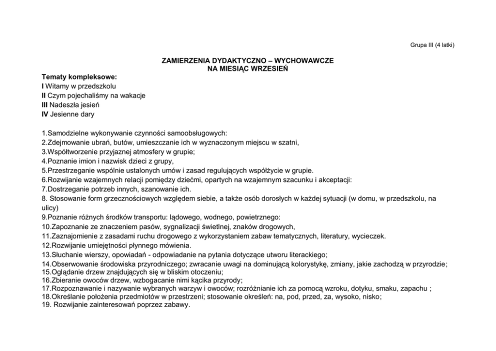 Grupa III (4 latki) ZAMIERZENIA DYDAKTYCZNO – WYCHOWAWCZE NA MIESIĄC WRZESIEŃ Tematy kompleksowe: I Witamy w przedszkolu II Czym pojechaliśmy na wakacje III Nadeszła jesień IV Jesienne dary 1.Samodzielne wykonywanie czynności samoobsługowych: 2.Zdejmowanie ubrań, butów, umieszczanie ich w wyznaczonym miejscu w szatni, 3.Współtworzenie przyjaznej atmosfery w grupie; 4.Poznanie imion i nazwisk dzieci z grupy, 5.Przestrzeganie wspólnie ustalonych umów i zasad regulujących współżycie w grupie. 6.Rozwijanie wzajemnych relacji pomiędzy dziećmi, opartych na wzajemnym szacunku i akceptacji: 7.Dostrzeganie potrzeb innych, szanowanie ich. 8. Stosowanie form grzecznościowych względem siebie, a także osób dorosłych w każdej sytuacji (w domu, w przedszkolu, na ulicy) 9.Poznanie różnych środków transportu: lądowego, wodnego, powietrznego: 10.Zapoznanie ze znaczeniem pasów, sygnalizacji świetlnej, znaków drogowych, 11.Zaznajomienie z zasadami ruchu drogowego z wykorzystaniem zabaw tematycznych, literatury, wycieczek. 12.Rozwijanie umiejętności płynnego mówienia. 13.Słuchanie wierszy, opowiadań - odpowiadanie na pytania dotyczące utworu literackiego; 14.Obserwowanie środowiska przyrodniczego; zwracanie uwagi na dominującą kolorystykę, zmiany, jakie zachodzą w przyrodzie; 15.Oglądanie drzew znajdujących się w bliskim otoczeniu; 16.Zbieranie owoców drzew, wzbogacanie nimi kącika przyrody; 17.Rozpoznawanie i nazywanie wybranych warzyw i owoców; rozróżnianie ich za pomocą wzroku, dotyku, smaku, zapachu ; 18.Określanie położenia przedmiotów w przestrzeni; stosowanie określeń: na, pod, przed, za, wysoko, nisko; 19. Rozwijanie zainteresowań poprzez zabawy. Planowane uroczystości i akcje: Udział dzieci w ogólnopolskiej Akcji „Sprzątanie świata” – wspólne porządkowanie terenu wokół przedszkola. „Światowy Dzień Przedszkolaka” – uroczystość ogólnoprzedszkolna. Wiersz do nauki: „Jestem samodzielny” Sam buty ubieram zapinam ubranie. Potrafię też ładnie sam zjeść śniadanie. Na miejsce zawsze zabawki układam bardzo nie lubię kiedy jest bałagan Chcę być samodzielny. grzeczny i lubiany i o wszystko ciągle nie pytać wciąż mamy. Piosenka do nauki: „Do przedszkola” I. Idą dzieci do przedszkola Idą gromadkami gromadkami, gromadkami Do białego domku z dużymi oknami 2x Ref. Raz, dwa, trzy, cztery Raz, dwa, trzy II. Weszły dzieci do przedszkola wszystko je ciekaw, oj ciekawi, oj ciekawi Tu się będą uczyć , tu się będą bawić 2x Ref. Raz, dwa, trzy, cztery Raz, dwa, trzy.