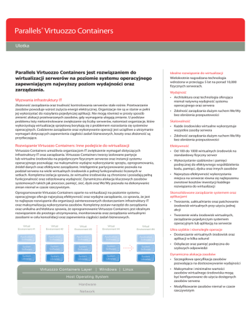 Parallels® Virtuozzo Containers Ulotka Parallels Virtuozzo Containers jest rozwiązaniem do wirtualizacji serwerów na poziomie systemu operacyjnego zapewniającym najwyższy poziom wydajności oraz zarządzania. Wyzwania infrastruktury IT Złożoność zarządzania oraz trudność kontrolowania serwerów stale rośnie. Przetwarzanie zasobów powoduje wzrost zużycia energii elektrycznej. Organizacje nie są w stanie w pełni jej wykorzystać do rozsyłania pojedynczej aplikacji. Nie mogą również w prosty sposób zmienić alokacji przetwarzanych zasobów, gdy wymagania ulegają zmianie. U podstaw problemu leży niekontrolowane zwiększanie się liczby serwerów, natomiast organizacje, które wykorzystują wirtualizację sprzętową borykają się z problemem rozrastania się systemów operacyjnych. Codzienne zarządzanie oraz wykonywanie operacji jest uciążliwe a utrzymanie wymagań dotyczących zapewnienia ciągłości zadań biznesowych, koszty oraz złożoność są przytłaczające. Rozwiązanie Virtuozzo Containers: Inne podejście do wirtualizacji Virtuozzo Containers umożliwia organizacjom IT zwiększenie wymagań dotyczących infrastruktury IT oraz zarządzania. Virtuozzo Containers tworzy izolowane partycje lub wirtualne środowiska na pojedynczym fizycznym serwerze oraz instancji systemu operacyjnego pozwalając na maksymalnie wydajne wykorzystanie sprzętu, oprogramowania, źródeł danych oraz efektywne zarządzanie. Inteligentne partycjonowanie pozwala na podział serwera na wiele wirtualnych środowisk o pełnej funkcjonalności liczonych w setkach. Kompletna izolacja sprawia, że wirtualne środowiska są chronione i posiadają pełną funkcjonalność oraz odizolowaną wydajność. Dynamiczna alokacja kluczowych zasobów systemowych takich jak procesor, pamięć, sieć, dysk oraz We/Wy pozwala na dokonywanie zmian niemal w czasie rzeczywistym. Oprogramowanie Virtuozzo Containers oparte na wirtualizacji na poziomie systemu operacyjnego oferuje najwyższą efektywność oraz wydajne zarządzanie, co sprawia, że jest to najlepsze rozwiązanie dla organizacji zainteresowanych dostarczaniem infrastruktury IT oraz maksymalizacją wykorzystania zasobów. Kompletny zestaw narzędzi do zarządzania oraz unikalna architektura sprawia, że oprogramowanie Virtuozzo Containers jest idealnym rozwiązaniem do prostego utrzymywania, monitorowania oraz zarządzania wirtualnymi zasobami w celu konsolidacji oraz zapewnienia ciągłości zadań biznesowych. Virtual Environment #1 Virtual Environment #2 Virtual Environment #3 Virtual Environment #4 Virtual Environment #N Application Software Application Software Application Software Application Software Application Software System Software System Software System Software System Software System Software System Libraries System Libraries System Libraries System Libraries System Libraries Virtuozzo Containers Layer | Windows | Linux Host Operating System Hardware Network Idealne rozwiązanie do wirtualizacji Wielokrotnie nagradzana technologia wdrożona w przeciągu 5 lat na ponad 10,000 fizycznych serwerach. Wydajność • Architektura oraz technologia oferująca niemal natywną wydajność systemu operacyjnego oraz serwera • Zdolność zarządzania dużym ruchem We/Wy bez obniżenia przepustowości Skalowalność • Każde środowisko wirtualne wykorzystuje wszystkie zasoby serwera • Zdolność zarządzania dużym ruchem We/Wy bez obniżenia przepustowości Efektywność • Od 100 do 1000 wirtualnych środowisk na standardowy fizyczny serwer • Wykorzystanie szablonów i pamięci podręcznej do efektywnego współdzielenia kodu, pamięci, dysku oraz innych zasobów • Najwyższa efektywność wykorzystania miejsca na serwerze równa się najlepszemu zwrotowi kosztów inwestycji każdego rozwiązania do wirtualizacji Skonsolidowane zarządzanie systemem oraz aplikacjami • Tworzenie, uaktualnianie oraz patchowanie środowisk wirtualnych przy użyciu jednej akcji • Tworzenie wielu środowisk wirtualnych, zarządzanie pojedynczym systemem operacyjnym lub aplikacją na serwerze Ultra szybkie i równoległe operacje • Dostarczanie wirtualnych środowisk oraz aplikacji w kilka sekund • Odsyłacze oraz pamięć podręczna do szybszych odpowiedzi Dynamiczna alokacja zasobów • Szczegółowa specyfikacja zasobów pozwalająca na dostosowywanie wydajności • Maksymalne i minimalne wartości zasobów wirtualnego środowiska mogą być konfigurowane do użycia dostępnych zasobów serwera • Modyfikowanie zasobów niemal w czasie rzeczywistym Rozwiązania Virtuozzo Containers Oprogramowanie Virtuozzo Containers zostało stworzone do następujących zastosowań i konfiguracji. Konsolidacja serwera i systemu operacyjnego Konsolidacja sprzętu była historycznie pierwszym krokiem w projektach konsolidacji serwerów. Virtuozzo Containers idzie krok dalej oferując konsolidację systemów operacyjnych, ułatwiając zarządzanie, redukując koszty i złożoność przy jednoczesnej poprawie jakości usług. Dynamiczne zarządzanie obciążeniem Aplikacje lub wymagania biznesowe w większości organizacji zmieniają się codziennie. Rozsyłanie aplikacji zazwyczaj wymaga zaangażowania w planowanie oraz konfigurację i rozmieszczenie serwera. Przy pomocy oprogramowania Virtuozzo Containers, obciążenie w wirtualnych środowiskach można w prosty sposób przenosić unikając przestojów przy użyciu migracji lub relokacji zasobów w czasie rzeczywistym. Ciągłość zadań biznesowych Zapewnienie bezpieczeństwa i dostępności aplikacji oraz danych jest podstawowym wymaganiem każdej organizacji IT. Balans kosztów oraz zasobów wymaganych na określonym poziomie wysokiej dostępności lub czas przywracania w przypadku awarii tworzy pewien zakres rozwiązań oraz wymagań. Virtuozzo Containers zapewnia organizacjom IT opłacalne opcje pozwalające na tworzenie środowisk danych o wysokiej dostępności, możliwych do przywrócenia. H