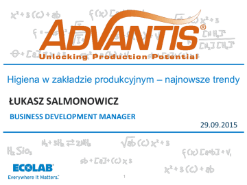 Higiena w zakładzie produkcyjnym – najnowsze trendy ŁUKASZ SALMONOWICZ BUSINESS DEVELOPMENT MANAGER 29.09.2015 1 Pytania podstawowe Jak dbasz o wysoką jakość produktu ? - przenoszenie zapachu - przenoszenie smaku - przenoszenie pulpy - standardy dezynfekcji i mycia Jak zapewniasz bezpieczeństwo urządzeń ? - korozja - szok termiczny 2 Pytania podstawowe Jak zarządzasz wydajnością operacyjną przy zwiększonym portfolio produktów? - szerszy wybór napojów - częste zmiany asortymentu i jedna linia napełniania Jak równoważysz wydajność operacyjną z wymogami w zakresie mycia i dezynfekcji (C&D) ? - czas produkcyjny netto - standardy i reżimy C&D Jak kontrolujesz wpływ reżimów C&D na całkowity koszt produkcji? - zużycie chemii - energia - woda i ścieki - robocizna - amortyzacja sprzętu / czas produkcji netto 3 Jak to działa? ... to metoda mycia i dezynfekcji dla systemów CIP i pianowych, dzięki której otrzymujemy lepszą wydajność operacyjną przy drastycznie zmniejszonym czasie i temperaturze mycia i dezynfekcji. 4 Jak to działa? Działanie wspomagające mycie i dezynfekcję uzyskiwane jest dzięki wolnym rodnikom tlenu “in statu nascendi” z mieszanki POAA / H2O2 Kilka minut po wprowadzeniu do obiegu, POAA / H2O2 ulega całkowitej destrukcji Dedykowane środki do mycia CIP zapewniające maksymalną skuteczność i kompatybilność materiałową ADVANTIS 210 ADVANTIS 220 do alkalicznego mycia CIP do kwaśnego mycia CIP 5 Jak to działa? Tradycyjna 3-stopniowa procedura mycia 6 Jak to działa? Procedura mycia CIP Advantis 7 Jakie korzyści z Advantis? Advantis a tradycyjna 3-stopniowa procedura mycia CIP 8 Twój bilans Advantis Advantis a tradycyjna metoda mycia Zysk czasu + czas x wartość dodatkowej produkcji + czas x amortyzacja sprzętu + czas x koszty robocizny Zysk energii + energia x koszt energii €/kJ Zysk wody i ścieków + woda x koszt wody/ścieków €/m3 Inwestycje w chemię i sprzęt dozujący koszty chemii inwestycja w sprzęt 9 Możliwości zastosowań 10 Korzyści Advantis Poprawa czasu cyklu mycia - wydajność operacyjna - więcej produktów w krótszym czasie - mniej inwestycji w nowszy sprzęt - koszty robocizny Redukcja temperatury mycia - mniejszy koszt energii - mniejsze obciążenie mechaniczne - zmniejszone zagrożenie bezpieczeństwa pracowników - zbędny etap schładzania 11 Korzyści Advantis Mniejsze zużycie wody - mniej etapów mycia - mniej ścieków - niższe koszty wody i ścieków - krótsze schładzanie systemu Lepsza wydajność mycia i dezynfekcji - ochrona marki 12 Advantis CIP: - szyte na miarę procedury mycia, dopasowane do składu produkowanych napojów - dedykowane produkty myjące - mycie fillera, linii, zbiorników w browarach i produkcji napojów - okresowe ogólne mycie zbiorników CCT w browarach, bez użycia chloru - do zastosowań w systemach nie-hermetycznych (wydzielanie gazu) 13 Mycie alkaliczne lub kwaśne Mycie Woda Białko Sole mineralne Oleje/tłuszcze Cukier Barwniki/taniny Pulpa X CSD Soki Herbata Piwo kwaśne alkaliczne utleniające ++ + ++ alkaliczne X X X X X X - ++ - X X X X 0 - ++ X X X X ++ + ++ X X X X + 0 ++ + 0 ++ X X 14 Przykład procedury C&D Advantis CIP Filler, Mikser, zbiornik buforowy, rury Procedura i produkty % Płukanie wstępne Roztwór alkaliczny Mycie i dezynfekcja Advantis 210 Z dodatkiem P3-oxonia active lub P3-oxonia active 150 Płukanie końcowe Woda ºC 35-40 1,5-2,0 35-40 0,5 or Min. Uwagi 1-5 Zastosuj alkaliczny roztwór myjący ze zbiornika CIP. Roztwór odprowadzany do odpływu 10-15 7* or 0,2 7* zimna 15 10 Długość etapu mycia zależy od czasu płukania wstępnego. Przynajmniej 15 minut. * Dodaj P3-oxonia active lub P3oxonia active 150 in-line do roztworu ok. 7 min. Przed zakończeniem etapu Bezpieczne dozowanie POAA w CIP 16 Advantis CIP - produkty Advantis 210 specyficzna mieszanka produktów alkalicznych inhibitory korozji składniki dyspergujące brud składniki sekwestrujące formuła nie zawierająca substancji powierzchniowo czynnych Advantis 220 środek myjący do CIP oparty na kwasie nieorganicznym inhibitory korozji składniki dyspergujące brud składniki sekwestrujące formuła nie zawierająca substancji powierzchniowo czynnych 17 Advantis FOAM - szyte na miarę procedury pianowego mycia i dezynfekcji, dopasowane do składu produkowanych napojów i obszaru aplikacji - zasada działania Advantis w połączeniu z produktem z serii Topax, Topaz lub Topactive - do zewnętrznego mycia i dezynfekcji powierzchni odpornych na korozję w całym przemyśle spożywczym - nie zawiera chloru 18 Mycie alkaliczne lub kwaśne Mycie Woda Białko Sole mineralne Oleje/tłuszcze Cukier Barwniki/taniny Pulpa X CSD Soki Herbata Piwo kwaśne alkaliczne utleniające ++ + ++ alkaliczne X X X X X X - ++ - X X X X 0 - ++ X X X X ++ + ++ X X X X + 0 ++ + 0 ++ X X 19 Przykład procedury C&D Advantis Automatyczne mycie pianowe fillerów 20 Bezpieczne dozowanie POAA do piany Dozowanie poprzez Hygiene Center – automatyczne systemy pianowe 21 Bezpieczne dozowanie POAA do piany II 22 Ecolab FOAM - produkty Dziękujemy i zapraszamy do kontaktu z naszymi konsultantami 23