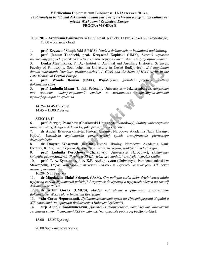 V Belliculum Diplomaticum Lublinense, 11-12 czerwca 2013 r. Problematyka badań nad dokumentem, kancelarią oraz archiwum a pogranicze kulturowe między Wschodem i Zachodem Europy PROGRAM OBRAD 11.06.2013, Archiwum Państwowe w Lublinie ul. Jezuicka 13 (wejście od pl. Katedralnego) 13.00 – otwarcie obrad 1. prof. Krzysztof Skupieński (UMCS), Nauki o dokumencie w badaniach nad kulturą. 2. prof. Janusz Tandecki, prof. Krzysztof Kopiński (UMK), Słownik wyrazów niemieckojęzycznych z polskich źródeł średniowiecznych - idea i stan realizacji opracowania. 3. Lenka Martínková, Ph.D., (Institut of Archival and Auxiliary Historical Sciences, Faculty of Philosophy, Southbohemian Univerzity in České Budějovice), „Ad mandatum domini marchionis Nicolaus, prothonotarius“. A Clerk and the Steps of His Activity in the Late Mediaeval Central Europe. 4. prof. Wanda Roman (UMK), Współczesna, globalna przestrzeń kultury dokumentacyjnej. 5. prof. Ludmiła Mazur (Uralski Federalny Uniwersytet w Jekaterynburgu), Документ как элемент информационной среды: о механизмах структурно-видовой трансформации документа. 14.25– 14.45 Dyskusja 14.45 – 15.00 Przerwa SEKCJA II 6. prof. Siergiej Posochow (Charkowski Uniwersytet Narodowy), Statuty uniwersytetów Imperium Rosyjskiego w XIX wieku, jako prawa i jako symbole. 7. dr Andrij Błanuca (Instytut Historii Ukrainy, Narodowa Akademia Nauk Ukrainy, Kijów), Ukraińska dyplomatyka postsowieckiej epoki: transformacje pierwszego dziesięciolecia. 8. dr Dmytro Waszczuk (Instytut Historii Ukrainy, Narodowa Akademia Nauk Ukrainy, Kijów), Współczesna dyplomatyka ukraińska: teoria, praktyka i metodologia. 9. prof. Ludmiła Posochowa (Charkowski Uniwersytet Narodowy), Dokumenty kolegiów prawosławnych Ukrainy w XVIII wieku: „zachodnia” tradycja i carskie realia. 10. prof. Т. А. Булыгина, doc. K.P. Амбарцумян (Uniwersytet Północnokaukaski w Stawropolu), Oбраз «другого» в текстах «своих» и «чужих» «кавказцев» XIX века: опыт сравнения. 16.20-16.35 Przerwa 11. dr Magdalena Biniaś-Szkopek (UAM), Czy polityka ruska doby dzielnicowej miała wpływ na rozwój dyplomatyki polskiej? Przyczynek do dyskusji o wpływach obcych na rozwój dokumentu w Polsce. 12. dr Artur Górak (UMCS), Między naturalnym a planowym grupowaniem dokumentów. Wykaz akt w Imperium Rosyjskim. 13. кін Євген Чернецький, Дрібношляхетський архів на Правобережній Україні в ХІХ столітті (на прикладі Федкевичів з Київської губернії). 14. мгр Андрій Кобилянський, Доведення дворянського походження київськими земянами в першій третині ХІХ століття. (на прикладі родин герба Драґо-Сас). 18.00 – 18.25 Dyskusja 20.00 Spotkanie towarzyskie 1 V Belliculum Diplomaticum Lublinense, 11-12 czerwca 2013 r. Problematyka badań nad dokumentem, kancelarią oraz archiwum a pogranicze kulturowe między Wschodem i Zachodem Europy PROGRAM OBRAD 12.06.2013 UMCS (Sala Rady Wydziału Humanistycznego, Pl. M. Curie-Skłodowskiej 4A) 9.00 początek obrad 15. dr Ewa Zielińska (UMCS), Dokumenty składane w ołtarzach - pamiątki dawnego zwyczaju liturgicznego i prawnego. 16. dr Adam Moniuszko (UW), Ochrona prawnokarna i odpowiedzialność urzędników – dwa prawne aspekty funkcjonowania płockiej kancelarii ziemskiej za Zygmunta III. 17. dr Katarzyna Madejska (UMCS), Sprawiedliwość kosztuje: procedury i ich koszty ponoszone przez mieszczan stających przed sądami różnych instancji (na przykładzie sprawy mieszczanina kazimierskiego Wawrzyńca Królika z 1628 roku). 18. prof. Alicja Kulecka (UW), Pomiędzy Francją, Prusami i Rosją. Dokument w Królestwie Polskim (1815-1867). 19. ks. prof. Paweł Wolnicki (AJD), Umowy o zamianę dziesięciny w Królestwie Kongresowym. 20. dr Tomasz Kałuski (UŚ), Kancelarie cechowe na ziemiach księstwa głogowskiego do XIX wieku. Organizacja i formy dokumentacji 11.00 – 11.20 Dyskusja 11.20 – 11.35 przerwa 21. dr Wojciech Marciniak (UŁ), Na „nieludzkiej” czy „gościnnej” ziemi radzieckiej? Obraz wygnańców i wygnania w aktach Związku Patriotów Polskich w ZSRR 22. dr Marek Konstankiewicz (UMCS), Zróżnicowanie kulturowe jako kontekst funkcjonowania dokumentacji w administracji publicznej II Rzeczypospolitej 23. dr Ilona Florczak (UŁ), Dokumenty dotyczące miast i województw w Archiwum rodziny Bartoszewiczów – próba charakterystyki 24. lic. Hadrian Ciechanowski (UMK), Między istnieniem a nie istnieniem – Metryka Koronna Stanisława Leszczyńskiego. 12.55 – 13.15 dyskusja 13.15 podsumowanie i zamknięcie obrad Czas przeznaczony na wystąpienie – 20 minut 2