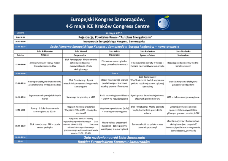 Europejski Kongres Samorządów, 4-5 maja ICE Kraków Congress Centre 4 maja 2015 Rejestracja, Powitalna Kawa - "Autobus Energetyczny" Godzina 8:00- 10:30 10:45 - 11:00 Inauguracja Europejskiego Kongresu Samorządów 11:00 - 12:30 Sesja Plenarna Europejskiego Kongresu Samorządów Europa Regionów – nowe otwarcie Ścieżka 12:40 - 14:00 Sala Sukiennice Finanse Blok tematyczny: Nowy model finansów samorządów Sala Wawel Gospodarka Blok Tematyczny: Finansowanie ochrony środowiska – maksymalizacja efektu ekologicznego Blok Tematyczny: Rynek Nowa perspektywa finansowa UE. mieszkalnictwa senioralnego – rola Jak efektywnie wydać pieniądze? samorządów 16:20 - 17:30 Zagraniczna ekspansja lokalnych marek Samorząd terytorialny a MSP 17:40 -18:50 Formy i źródła finansowania samorządów po 2014r. Program Rozwoju Obszarów Wiejskich 2014-2020 – kto zyska, kto straci? Blok tematyczny: PPP – teoria versus praktyka Połączenia lotnicze i rozwój regionalnych portów lotniczych (czas trwania 19:00 19:50) Znaczenie sektora lotniczego dla rozwoju gospodarczego regionów (czas trwania panelu: 19:50 - 20:40) 19:00 - 20:20 20:50 - 21:50 22:00 Zdrowie w samorządach – mapy potrzeb zdrowotnych Sala Barbakan Sala Mariacka Społeczeństwo Środowisko Finansowanie oświaty w Polsce i Europie z perspektywy samorządu Rozwój przedsiębiorstw wodnokanalizacyjnych Lunch 14:00 - 15:00 15:00 - 16:10 Sala Wisła Innowacje Blok Tematyczny: Model wzorcowego szpitala Współzależność dwóch wymiarów powiatowego – kluczowe polityki rodzinnej: samorządowej aspekty prawne i finansowe i centralnej Blok Tematyczny: Efektywna gospodarka odpadami Parki technologiczne i klastry Rynek pracy. Bezrobocie jednym z – wpływ na rozwój regionu głównych problemów UE OZE – zielona energia w regionie Wspólnota powiatowa (polis) – lokalny partner regionu Blok Tematyczny: Marka osobista wójta, burmistrza, prezydenta miasta Zmienić przyszłość energii: społeczeństwo obywatelskie głównym graczem produkcji OZE Nowe oblicza przestrzeni miejskich - dobre praktyki współpracy z samorządami Samorządność po polsku – nasz towar eksportowy? Blok Tematyczny: Budownictwo ekologiczne jako przyszłość inwestycji publicznych – wyzwania, doświadczenia, przykłady Gala rozdania nagród Lider Samorządu Bankiet Europejskiego Kongresu Samorządów 1 5 maja 2015 Godzina Otwarcie wystawy „Od żelaznej kurtyny do Zielonego Pasa Europy“ 8:30 - 9:00 Ścieżka 9:00 - 10:10 10:20 - 11:30 11:40 - 12:50 Sala Sukiennice Finanse Sala Wawel Gospodarka Blok Tematyczny: Inwestycje w regionach. Jak zapewnić sukces? Blok Tematyczny: Jak wzmocnić atrakcyjność inwestycyjną miast i regionów PPP jako umowy o efekt energetyczny dla budynków Blok Tematyczny: Regionalna współpraca transgraniczna w Europie Sala Barbakan Społeczeństwo Blok Tematyczny: Inteligentne miasta i Nowe modele partnerstwa miast metropolie XXI w. w Europie Rzeczywistość czy przyszłość? Blok Tematyczny: Efektywność energetyczna Inteligentne technologie w służbie Urban Resilience Blok Tematyczny: Polityka spójności a rozwój regionalny europejskich miast i regionów Rewitalizacja miast i regionów Blok Tematyczny: Innowacje w okresie 2014-2020+. Jak je wspierać w Polsce? Demokracja uczestnicząca – zaangażowanie obywatelskie w rozwój wspólnoty lokalnej Zarządzanie turystyką w regionach Współpraca samorządu i biznesu na rzecz rozwiązywania problemów społecznych Turystyka motorem rozwoju regionów Blok Tematyczny: Efektywne korzystanie z zasobów na poziomie lokalnym - recykling i pozyskiwanie energii z odpadów Lunch Sposoby finansowania infrastruktury miejskiej Rozwój lokalnych gospodarek w oparciu o duże firmy Innowacja: jak modną narrację przekształcić w lokomotywę wzrostu obszarów miejskich? Sesja Plenarna Europejskiego Kongresu Samorządów Nowy Plan dla Europy 15:00 - 16:30 16:40 - 17:50 Blok Tematyczny: Wieloletnia prognoza finansowa JST Dobre bo polskie - fenomen lokalnych produktów Blok Tematyczny: Cyfrowy świat samorządów Samorządowiec czy manager - jak skutecznie zarządzać administracją samorządową? 18:00 - 19:10 Zarządzanie bezpieczeństwem lokalnym Rozwój transportu kolejowego w Europie. Rola przewozów regionalnych i miejskich sieci kolejowych Blok Tematyczny: Wpływ badań naukowych i innowacji na konkurencyjność regionów Polityka kulturalna a rozwój gospodarczy 19:20 - 20:40 Budowa tożsamości lokalnej. Samorząd a historia Wyzwania dla współpracy na wschodniej granicy Unii Europejskiej: możliwości, silne partnerstwa i wspólne zagrożenia Blok Tematyczny: Zrównoważony rozwój w regionie - teoria a praktyka Sukces lokalnych ruchów polityczno - społecznych. Czy ten trend się utrzyma? 21:00 Sala Mariacka Środowisko Blok Tematyczny: Sport a społeczności lokalne 12:50 -13:50 13:50 - 14:50 Sala Wisła Innowacje Strategie zarządzania ryzykiem powodziowym w regionach Bankiet Europejskiego Kongresu Samorządów *stan na 24 kwietnia br. organizator zastrzega sobie prawo do zmian w programie 2