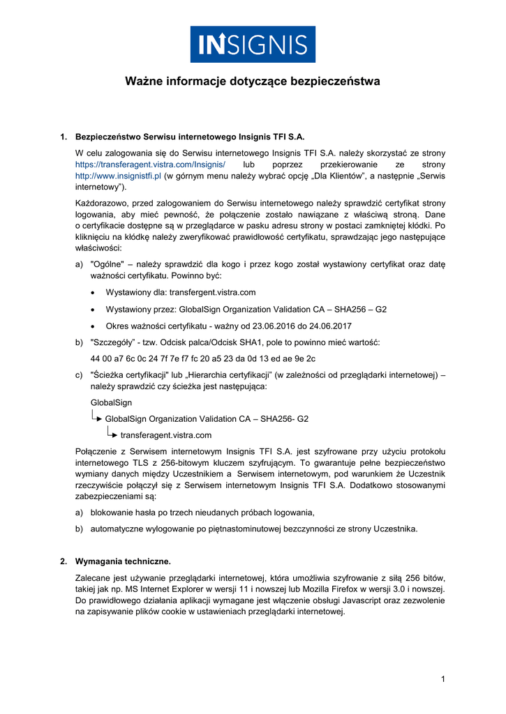 Ważne informacje dotyczące bezpieczeństwa 1. Bezpieczeństwo Serwisu internetowego Insignis TFI S.A. W celu zalogowania się do Serwisu internetowego Insignis TFI S.A. należy skorzystać ze strony https://transferagent.vistra.com/Insignis/ lub poprzez przekierowanie ze strony http://www.insignistfi.pl (w górnym menu należy wybrać opcję „Dla Klientów”, a następnie „Serwis internetowy”). Każdorazowo, przed zalogowaniem do Serwisu internetowego należy sprawdzić certyfikat strony logowania, aby mieć pewność, że połączenie zostało nawiązane z właściwą stroną. Dane o certyfikacie dostępne są w przeglądarce w pasku adresu strony w postaci zamkniętej kłódki. Po kliknięciu na kłódkę należy zweryfikować prawidłowość certyfikatu, sprawdzając jego następujące właściwości: a) "Ogólne" – należy sprawdzić dla kogo i przez kogo został wystawiony certyfikat oraz datę ważności certyfikatu. Powinno być: Wystawiony dla: transfergent.vistra.com Wystawiony przez: GlobalSign Organization Validation CA – SHA256 – G2 Okres ważności certyfikatu - ważny od 23.06.2016 do 24.06.2017 b) "Szczegóły” - tzw. Odcisk palca/Odcisk SHA1, pole to powinno mieć wartość: 44 00 a7 6c 0c 24 7f 7e f7 fc 20 a5 23 da 0d 13 ed ae 9e 2c c) "Ścieżka certyfikacji" lub „Hierarchia certyfikacji” (w zależności od przeglądarki internetowej) – należy sprawdzić czy ścieżka jest następująca: GlobalSign GlobalSign Organization Validation CA – SHA256- G2 transferagent.vistra.com Połączenie z Serwisem internetowym Insignis TFI S.A. jest szyfrowane przy użyciu protokołu internetowego TLS z 256-bitowym kluczem szyfrującym. To gwarantuje pełne bezpieczeństwo wymiany danych między Uczestnikiem a Serwisem internetowym, pod warunkiem że Uczestnik rzeczywiście połączył się z Serwisem internetowym Insignis TFI S.A. Dodatkowo stosowanymi zabezpieczeniami są: a) blokowanie hasła po trzech nieudanych próbach logowania, b) automatyczne wylogowanie po piętnastominutowej bezczynności ze strony Uczestnika. 2. Wymagania techniczne. Zalecane jest używanie przeglądarki internetowej, która umożliwia szyfrowanie z siłą 256 bitów, takiej jak np. MS Internet Explorer w wersji 11 i nowszej lub Mozilla Firefox w wersji 3.0 i nowszej. Do prawidłowego działania aplikacji wymagane jest włączenie obsługi Javascript oraz zezwolenie na zapisywanie plików cookie w ustawieniach przeglądarki internetowej. 1 3. Podstawowe zagrożenia związane z korzystaniem z usług w sieci Internet, w tym w ramach elektronicznych kanałów dostępu, to: 1) Phishing - podszywanie się w celu wyłudzenia informacji, np. danych umożliwiających dostęp do serwisu internetowego (identyfikatora, hasła). Zazwyczaj są to fałszywe powiadomienia imitujące komunikaty z instytucji finansowej rozsyłane za pośrednictwem poczty elektronicznej, w których kieruje się użytkowników do zalogowania na strony internetowe naśladujące oryginalne strony instytucji finansowych, w celu przechwycenia danych do logowania. 2) Złośliwe oprogramowanie (ang. malware) – wszelkie aplikacje i programy wykorzystywane w celu działań przestępczych lub mające na celu wyrządzenie szkody użytkownikowi komputera, smartfonu, tableta. Do złośliwego oprogramowania należą m.in.: a) wirusy – program złośliwy, który przenosi się poprzez zapis zainfekowanego pliku na nośniku danych w celu kradzieży lub usunięcia danych, zakłócenia pracy urządzenia lub przejęcia kontroli nad urządzeniem. Najczęściej do zarażenia wirusem elektronicznym dochodzi po pobieraniu plików z niezaufanego źródła lub otwarciu załącznika w poczcie elektronicznej; b) robaki – złośliwe oprogramowanie podobne do wirusów, samoreplikujące się tylko poprzez sieć, niepotrzebujące programu nosiciela. Oprócz replikacji robaki mogą niszczyć plik, wysyłać pocztę lub pełnić rolę trojana; c) trojany – nie rozmnażają się jak wirusy, ale ukrywają się pod nazwą lub w części pliku wykonując operacje w tle, szkodliwe dla użytkownika, np. umożliwiające przejęcie kontroli nad systemem przez nieuprawnione osoby; d) programy szpiegujące (ang. spyware) – programy zbierające i przesyłające dane o użytkowniku (np. informacje o odwiedzanych witrynach, hasła dostępowe) do przestępcy. Programy szpiegujące mogą gromadzić i przekazywać dane umieszczone w urządzeniu jaki i śledzić działania użytkownika np. tekst wpisywany z klawiatury. 3) Niechciana poczta, tzw. spam – niezamawiane lub niepotrzebne wiadomości elektroniczne rozsyłane masowo do nieznanych sobie osób. Spam często wiąże się z różnego rodzaju wirusami i złośliwymi programami, powoduje zatykanie się łączy, blokuje miejsce na dyskach, spowalnia działanie serwerów. 4. Środki ostrożności zalecane dla użytkowników Serwisu internetowego 1) Zabezpieczenie danych wykorzystywanych do logowania Dane dostępowe do Serwisu internetowego (identyfikator i hasło) powinny być znane tylko Uczestnikowi. Nie należy ich ujawniać osobom trzecim lub przechowywać na urządzeniu w formie, która umożliwia nieautoryzowany dostęp i odczyt. Hasło należy okresowo zmieniać. 2) Logowanie do Serwisu internetowego Logując się do Serwisu internetowego Insignis TFI S.A. należy zawsze sprawdzać poprawność i ważność certyfikatu strony do logowania. Nie wolno ignorować ostrzeżeń generowanych przez przeglądarkę dotyczących błędnego lub nieważnego certyfikatu. Do logowania nie należy używać odnośników otrzymanych w poczcie elektronicznej lub umieszczonych na innych stronach niż Insignis TFI S.A. Może to być próba przechwycenia danych umożliwiających zalogowanie w Serwisie internetowym (phishing). Po zakończeniu pracy należy pamiętać o wylogowaniu się z Serwisu internetowego korzystając z funkcji Wyloguj. 2 3) Zabezpieczenie urządzeń zapewniających dostęp do Internetu Urządzenie z