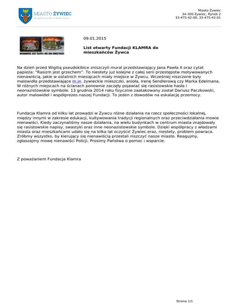 Miasto Żywiec 34-300 Żywiec, Rynek 2 33-475-42-00, 33-475-42-01 09.01.2015 List otwarty Fundacji KLAMRA do mieszkańców Żywca Na dzień przed Wigilią pseudokibice zniszczyli mural przedstawiający Jana Pawła II oraz cytat papieża: "Rasizm jest grzechem”. To niestety już kolejne z całej serii przestępstw motywowanych nienawiścią, jakie w ostatnich miesiącach miały miejsce w Żywcu. Wcześniej niszczone były malowidła przedstawiające m.in. żywieckie mieszczki, anioła, Irenę Sendlerową czy Marka Edelmana. W różnych miejscach na ścianach ponownie zaczęły pojawiać się rasistowskie hasła i neonazistowskie symbole. 13 grudnia 2014 roku fizycznie zaatakowany został Dariusz Paczkowski, autor malowideł i współprezes naszej Fundacji. To jeden z dowodów na eskalację przemocy. Fundacja Klamra od kilku lat prowadzi w Żywcu różne działania na rzecz społeczności lokalnej, między innymi w zakresie edukacji, kultywowania tradycji regionalnych oraz przeciwdziałania mowie nienawiści. Kiedy zaczynaliśmy nasze działania, na wielu budynkach w centrum miasta znajdowały się rasistowskie napisy, swastyki oraz inne neonazistowskie symbole. Dzięki współpracy z władzami miasta oraz mieszkańcami udało się na kilka lat oczyścić Żywiec.eraz, niestety, problem powraca. Zróbmy wszystko, by kierujący się nienawiścią przestali niszczyć nasze miasto. Reagujmy, zgłaszajmy mowę nienawiści Policji. Prosimy Państwa o pomoc i wsparcie. Z poważaniem Fundacja Klamra Strona 1/1 Powered by TCPDF (www.tcpdf.org)