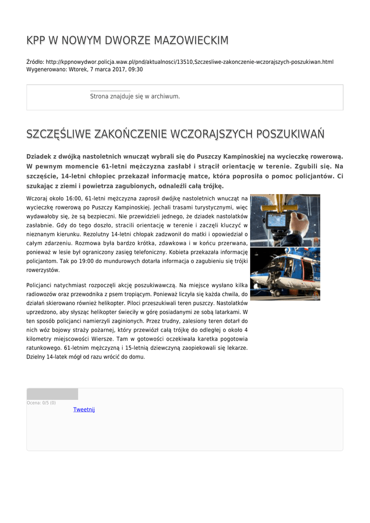 KPP W NOWYM DWORZE MAZOWIECKIM Źródło: http://kppnowydwor.policja.waw.pl/pnd/aktualnosci/13510,Szczesliwe-zakonczenie-wczorajszych-poszukiwan.html Wygenerowano: Wtorek, 7 marca 2017, 09:30 Strona znajduje się w archiwum. SZCZĘŚLIWE ZAKOŃCZENIE WCZORAJSZYCH POSZUKIWAŃ Dziadek z dwójką nastoletnich wnucząt wybrali się do Puszczy Kampinoskiej na wycieczkę rowerową. W pewnym momencie 61-letni mężczyzna zasłabł i strącił orientację w terenie. Zgubili się. Na szczęście, 14-letni chłopiec przekazał informację matce, która poprosiła o pomoc policjantów. Ci szukając z ziemi i powietrza zagubionych, odnaleźli całą trójkę. Wczoraj około 16:00, 61-letni mężczyzna zaprosił dwójkę nastoletnich wnucząt na wycieczkę rowerową po Puszczy Kampinoskiej. Jechali trasami turystycznymi, więc wydawałoby się, że są bezpieczni. Nie przewidzieli jednego, że dziadek nastolatków zasłabnie. Gdy do tego doszło, stracili orientację w terenie i zaczęli kluczyć w nieznanym kierunku. Rezolutny 14-letni chłopak zadzwonił do matki i opowiedział o całym zdarzeniu. Rozmowa była bardzo krótka, zdawkowa i w końcu przerwana, ponieważ w lesie był ograniczony zasięg telefoniczny. Kobieta przekazała informację policjantom. Tak po 19:00 do mundurowych dotarła informacja o zagubieniu się trójki rowerzystów. Policjanci natychmiast rozpoczęli akcję poszukiwawczą. Na miejsce wysłano kilka radiowozów oraz przewodnika z psem tropiącym. Ponieważ liczyła się każda chwila, do działań skierowano również helikopter. Piloci przeszukiwali teren puszczy. Nastolatków uprzedzono, aby słysząc helikopter świeciły w górę posiadanymi ze sobą latarkami. W ten sposób policjanci namierzyli zaginionych. Przez trudny, zalesiony teren dotarł do nich wóz bojowy straży pożarnej, który przewiózł całą trójkę do odległej o około 4 kilometry miejscowości Wiersze. Tam w gotowości oczekiwała karetka pogotowia ratunkowego. 61-letnim mężczyzną i 15-letnią dziewczyną zaopiekowali się lekarze. Dzielny 14-latek mógł od razu wrócić do domu. Ocena: 0/5 (0) Tweetnij