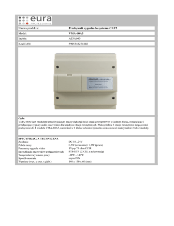 Nazwa produktu: Przełącznik sygnału do systemu CAT5 Model: VMA-60A5 Indeks: A53A660 Kod EAN: 5905548274102 Opis: VMA-60A5 jest modułem umożliwiającym pracę większej ilości stacji zewnętrznych w jednym bloku, rozdzielając i przełączając sygnały audio oraz wideo dla każdej ze stacji zewnętrznych. Maksymalnie 4 stacje zewnętrzne mogą zostać podłączone do 1 modułu VMA-60A5, natomiast w 1 klatce schodowej można zainstalować maksymalnie 2 takie moduły. SPECYFIKACJA TECHNICZNA Zasilanie Pobór mocy Parametry sygnału video Specyfikacja przewodów połączeniowych Temperaturowy zakres pracy Sposób montażu Wymiary (wys. x szer. x głęb.) DC 18...24V 0,5W (czuwanie)/ 1,5W (praca) 1Vp-p 75 ohm CCIR FTP/UTP (CAT5, z polaryzacją) -10ºC...+40ºC szyna DIN 140 x 150 x 60 (mm)