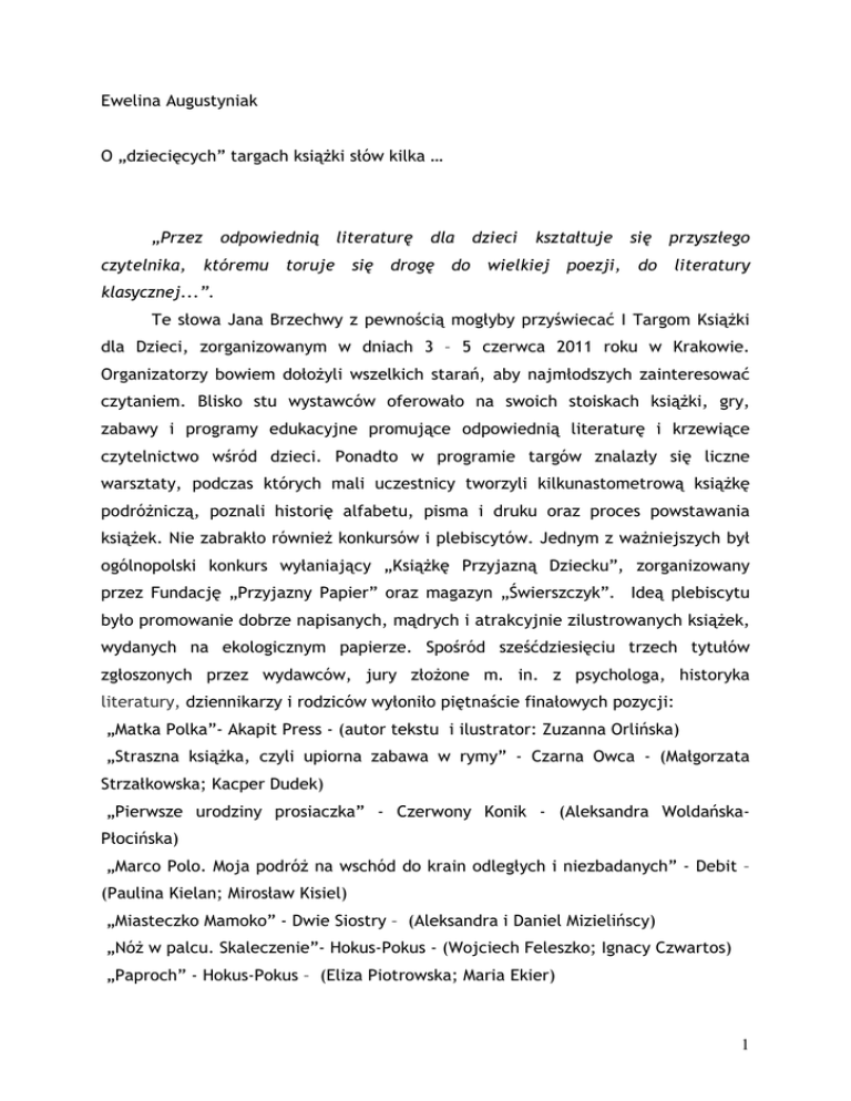 Ewelina Augustyniak O „dziecięcych” targach ksiąŜki słów kilka … „Przez czytelnika, odpowiednią literaturę któremu toruje się dla drogę do dzieci kształtuje wielkiej poezji, się do przyszłego literatury klasycznej...”. Te słowa Jana Brzechwy z pewnością mogłyby przyświecać I Targom KsiąŜki dla Dzieci, zorganizowanym w dniach 3 – 5 czerwca 2011 roku w Krakowie. Organizatorzy bowiem dołoŜyli wszelkich starań, aby najmłodszych zainteresować czytaniem. Blisko stu wystawców oferowało na swoich stoiskach ksiąŜki, gry, zabawy i programy edukacyjne promujące odpowiednią literaturę i krzewiące czytelnictwo wśród dzieci. Ponadto w programie targów znalazły się liczne warsztaty, podczas których mali uczestnicy tworzyli kilkunastometrową ksiąŜkę podróŜniczą, poznali historię alfabetu, pisma i druku oraz proces powstawania ksiąŜek. Nie zabrakło równieŜ konkursów i plebiscytów. Jednym z waŜniejszych był ogólnopolski konkurs wyłaniający „KsiąŜkę Przyjazną Dziecku”, zorganizowany przez Fundację „Przyjazny Papier” oraz magazyn „Świerszczyk”. Ideą plebiscytu było promowanie dobrze napisanych, mądrych i atrakcyjnie zilustrowanych ksiąŜek, wydanych na ekologicznym papierze. Spośród sześćdziesięciu trzech tytułów zgłoszonych przez wydawców, jury złoŜone m. in. z psychologa, historyka literatury, dziennikarzy i rodziców wyłoniło piętnaście finałowych pozycji: „Matka Polka”- Akapit Press - (autor tekstu i ilustrator: Zuzanna Orlińska) „Straszna ksiąŜka, czyli upiorna zabawa w rymy” - Czarna Owca - (Małgorzata Strzałkowska; Kacper Dudek) „Pierwsze urodziny prosiaczka” - Czerwony Konik - (Aleksandra WoldańskaPłocińska) „Marco Polo. Moja podróŜ na wschód do krain odległych i niezbadanych” - Debit – (Paulina Kielan; Mirosław Kisiel) „Miasteczko Mamoko” - Dwie Siostry – (Aleksandra i Daniel Mizielińscy) „NóŜ w palcu. Skaleczenie”- Hokus-Pokus - (Wojciech Feleszko; Ignacy Czwartos) „Paproch” - Hokus-Pokus – (Eliza Piotrowska; Maria Ekier) 1 „O Zającu, który szukał Swojego Miejsca” - Ilustratornia – (Agata Baranowska) „Za niebieskimi drzwiami” - Instytut Wydawniczy Latarnik – (Marcin Szczygielski) „Cecylka Knedelek i poletko truskawek” - Jedność – (Joanna KrzyŜanek; Marcin Ciseł) „Słoniątko”- Muchomor – (Adam Jaromir; Gabriela Cichowska) „Andrzej Kruszewicz opowiada o ptakach” - Multico – (Andrzej Kruszewicz; zespół 11 ilustratorów) „Tato, a dlaczego?” - Multico – (Wojciech Mikołuszko; Tomasz Samojlik) „Ciotka Klotka i inne historie” - Pascal – (Agnieszka Ginko; Kasia Kukla-Puzoń) „Mikołaj Kopernik” - Zielona Sowa – (Marcin Przewoźniak; Dorota Szoblik). O wyborze zwycięzcy zadecydowali internauci podczas głosowania za pośrednictwem portalu eDziecko.pl, oddając najwięcej głosów na ksiąŜkę „O Zającu, który szukał Swojego Miejsca”. Aby zagłosować, naleŜało napisać e-mail z uzasadnieniem wyboru. Autorka zwycięskiej ksiąŜki zgromadziła wszystkie nagrody przewidziane w konkursie: dla twórcy tekstu, ilustracji oraz nagrodę przyjazny papier dla wydawcy. Na targach wyróŜniono ponadto dwie kolejne ksiąŜki „Marco Polo” wydawnictwa Debit i „Pierwsze urodziny prosiaczka” wydawnictwa Czerwony Konik. Organizatorzy I Targów KsiąŜki Dziecięcej w Krakowie zaprosili równieŜ przedstawicieli I Ogólnopolskiej WypoŜyczalni KsiąŜek Dotykowych. Działa ona od 2008 roku przy Specjalnym Ośrodku Szkolno - Wychowawczym dla Dzieci i MłodzieŜy Słabo Widzącej im. prof. Zofii Sękowskiej w Lublinie. Dostępnych jest w niej kilkaset ksiąŜek dotykowych dla małych niewidomych dzieci, które jeszcze nie potrafią posługiwać się alfabetem Braille'a. Dzięki specjalnie zaprojektowanym, wykonanym z materiałów o róŜnej fakturze, ksiąŜeczkom zaopatrzonym w tekst napisany alfabetem w obydwu formach, najmłodsi niewidzący mogą słuchać opowieści jednocześnie rozwijając wyobraźnię poprzez dotyk. Taka forma czytania doskonali u niewidomych dzieci zmysł dotyku, wzbogaca słownictwo, a zarazem zaznajamia je z alfabetem Braille’a. WypoŜyczalnia udostępnia księgozbiór od września do czerwca. Rodzice dzieci niewidomych z terenu całej Polski mogą korzystać z jej zbiorów bezpłatnie, równieŜ za pomocą darmowej przesyłki pocztowej, po okazaniu legitymacji Polskiego Związku Niewidomych. 2 Na uwagę zasługują takŜe zorganizowane podczas trwania targów akcje „Dzielę się ksiąŜkami” oraz „ KsiąŜka za ksiąŜkę”, zachęcające do oddawania przeczytanych ksiąŜek na rzecz dzieci przebywających w domach dziecka, placówkach opiekuńczych czy podopiecznych Miejskiego Ośrodka Pomocy Społecznej w Krakowie. Dzieląc się w ten sposób swoim księgozbiorem najmłodsi czytelnicy oraz ich rodzice mogli nie tylko wesprzeć te dzieci, dla których dostęp do ksiąŜki jest utrudniony, ale równieŜ otrzymać kupon rabatowy na zakup nowych publikacji prezentowanych na targach. Najmłodsi uczestnicy mogli ponadto spotkać bohaterów wielu bajkowych postaci m. in. Kubusia Puchatka, Czerwonego Kapturka, Królewnę ŚnieŜkę czy śółwia Franklina, autorów ksiąŜek dziecięcych – Joannę M. Chmielewską, Barbarę Gawryluk, Annę Czerwińską – Rydel - i ilustratorów – Łukasza Zabdyra, Kazimierza Wasilewskiego, Piotra Olszówkę - a uczestnicząc w wielkoformatowej grze „Bitwa pod Grunwaldem” mogli wcielić się w rolę króla Władysława Jagiełły oraz odbyć podróŜ „Dookoła świata z Janem Pawłem II”. Dla rodziców i opiekunów przygotowano warsztaty z animacji czytelniczej „Jak zmienić fabułę ksiąŜki w zabawę?”, spotkania z psychologami na temat wyrabiania nawyków czytelniczych u dzieci oraz wykład Polskiego Związku Logopedów „Przygotowanie do nauki czytania, pisania i rozumienia lektur”. Zainteresowani nauczani