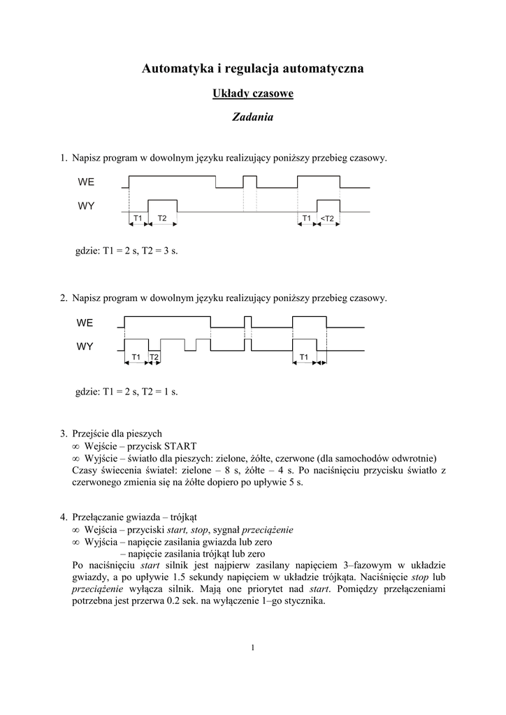 Automatyka i regulacja automatyczna Układy czasowe Zadania 1. Napisz program w dowolnym języku realizujący poniższy przebieg czasowy. WE WY T1 T2 T1 <T2 gdzie: T1 = 2 s, T2 = 3 s. 2. Napisz program w dowolnym języku realizujący poniższy przebieg czasowy. WE WY T1 T2 T1 gdzie: T1 = 2 s, T2 = 1 s. 3. Przejście dla pieszych • Wejście – przycisk START • Wyjście – światło dla pieszych: zielone, żółte, czerwone (dla samochodów odwrotnie) Czasy świecenia świateł: zielone – 8 s, żółte – 4 s. Po naciśnięciu przycisku światło z czerwonego zmienia się na żółte dopiero po upływie 5 s. 4. Przełączanie gwiazda – trójkąt • Wejścia – przyciski start, stop, sygnał przeciążenie • Wyjścia – napięcie zasilania gwiazda lub zero – napięcie zasilania trójkąt lub zero Po naciśnięciu start silnik jest najpierw zasilany napięciem 3–fazowym w układzie gwiazdy, a po upływie 1.5 sekundy napięciem w układzie trójkąta. Naciśnięcie stop lub przeciążenie wyłącza silnik. Mają one priorytet nad start. Pomiędzy przełączeniami potrzebna jest przerwa 0.2 sek. na wyłączenie 1–go stycznika. 1 5. Czasomierz TOF W języku ST napisz program realizujący funkcję czasomierza TOF. TOF – opóźnione wyłączenie (off-delay timing) TOF BOOL IN Q BOOL TIME PT ET TIME IN Q PT ET 6. Czasomierz TP W języku ST napisz program realizujący funkcję czasomierza TP. TP – generator impulsu (pulse timing) TP BOOL IN Q BOOL TIME PT ET TIME IN Q PT PT ET 7. Silnik i pompa Naciśnięcie przycisku Start powoduje natychmiastowe włączenie silnika, a pompy po upływie 3 sekund. Analogicznie, naciśnięcie przycisku Stop natychmiast wyłącza silnik, a pompę po upływie 4 sekund. 8. Kuchenka mikrofalowa W prostej kuchence przyciski K1, K2 służą do ustawiania czasu grzania, przycisk K3 pełni funkcję Start, a K4 – Stop. Naciśnięcie Stop przez upływem ustawionego czasu wyłącza grzanie. Ponowne naciśnięcie Start powoduje włączenie kuchenki na pozostały czas. 9. Lampa zewnętrzna Detektor załącza lampę po wykryciu ruchu, a gdy ruch ustanie, to wyłącza ją po 5 sekundach. Gdy w ciągu tych 5 sekund ruch ponownie zostanie wykryty, to lampa załączana jest od nowa. 10. Jeden impuls Zaproponuj układ, który na naciśnięcie przycisku Start reaguje impulsem pojawiającym się na wyjściu po upływie 3 sekund (drugie naciśnięcie Start generuje drugi impuls). 2
