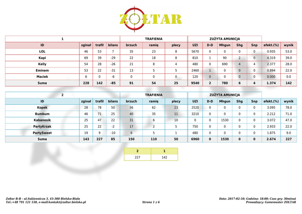 1 TRAFIENIA ZUŻYTA AMUNICJA ID zginał trafił bilans brzuch ramię plecy UZI D-D Mhgun Shg Snp efekt.(%) wynik LOL 46 53 7 35 23 8 5670 0 0 0 0 0.935 53.0 Kapi 69 39 -29 22 18 8 810 1 90 2 0 4.319 39.0 Kelly 54 28 -26 21 8 4 480 0 690 4 4 2.377 28.0 Eminem 53 22 -31 13 5 5 2460 1 0 0 0 0.894 22.0 Maciek 6 0 -6 0 0 0 120 0 0 0 0 0.000 0.0 Suma 228 142 -85 91 54 25 9540 2 780 6 4 1.374 142 2 TRAFIENIA ZUŻYTA AMUNICJA ID zginał trafił bilans brzuch ramię plecy UZI D-D Mhgun Shg Snp efekt.(%) wynik Kopek 28 78 50 56 62 23 2520 0 0 0 0 3.095 78.0 Bumbum 46 71 25 40 35 11 3210 0 0 0 0 2.212 71.0 Kabanosik 25 47 22 31 6 10 0 0 1530 0 0 3.072 47.0 PartyKrzak 25 22 -2 17 2 5 750 0 0 0 0 2.933 22.0 PartySweet 19 9 -10 6 5 1 480 0 0 0 0 1.875 9.0 Suma 143 227 85 150 110 50 6960 0 1530 0 0 2.674 227 Zoltar B-B - ul.Sukiennicza 3, 43-300 Bielsko-Biała Tel.:+48 791 121 530, e-mail:[email protected] 2 1 227 142 Strona 1 z 6 Data: 2017-02-10; Godzina: 18:00; Czas gry: 30minut Prowadzący: Gamemaster ZOLTAR 1 TRAFIENIA ZUŻYTA AMUNICJA ID zginał trafił bilans brzuch ramię plecy UZI D-D Mhgun Shg efekt.(%) wynik LOL 25 42 17 29 11 11 2640 89 0 0 1.539 42.0 Bumbum 42 41 -1 23 25 10 1950 0 0 0 2.103 41.0 Kelly 37 23 -14 13 14 5 2730 10 0 0 0.839 23.0 Kabanosik 37 21 -15 10 3 8 0 0 810 4 2.580 21.0 Eminem 31 11 -20 9 2 2 2820 0 0 0 0.390 11.0 Suma 172 138 -33 84 55 36 10140 99 810 4 1.249 138 2 TRAFIENIA ZUŻYTA AMUNICJA ID zginał trafił bilans brzuch ramię plecy UZI D-D Mhgun Shg efekt.(%) wynik Kopek 32 116 84 81 90 26 4200 0 0 0 2.762 116.0 Kapi 30 25 -5 12 10 8 1080 0 0 0 2.315 25.0 PartyKrzak 41 23 -17 20 4 3 1200 0 0 0 1.917 23.0 PartySweet 36 7 -29 3 3 3 360 3 0 0 1.928 7.0 Suma 139 171 33 116 107 40 6840 3 0 0 2.499 171 Zoltar B-B - ul.Sukiennicza 3, 43-300 Bielsko-Biała Tel.:+48 791 121 530, e-mail:[email protected] 2 1 171 138 Strona 2 z 6 Data: 2017-02-10; Godzina: 18:37; Czas gry: 25minut Prowadzący: Gamemaster ZOLTAR Drużyny Miejsce Nazwa Zoltar B-B - ul.Sukiennicza 3, 43-300 Bielsko-Biała Tel.:+48 791 121 530, e-mail:[email protected] Rozgrywki 1 2 Suma 2 227 171 398 1 142 138 280 Strona 3 z 6 Data: 2017-02-10 Prowadzący: Gamemaster ZOLTAR Zestawienie wg wyniku Miejsce TRAFIENIA ZUŻYTA AMUNICJA ID zginał trafił bilans brzuch ramię plecy UZI D-D Mhgun Shg Snp efekt.(%) wynik Kopek 66.40 217.20 150.80 153.20 170.00 54.20 7560.00 0.00 0.00 0.00 0.00 2.873 217.20 Bumbum 96.40 120.20 23.80 67.60 65.00 23.00 5550.00 0.00 0.00 0.00 0.00 2.166 120.20 LOL 76.00 103.40 27.40 69.80 36.20 21.20 8838.00 106.80 0.00 0.00 0.00 1.156 103.40 4 Kabanosik 69.40 72.20 2.80 43.00 9.60 19.60 0.00 0.00 2502.00 4.80 0.00 2.880 72.20 5 Kapi 105.00 69.00 -36.00 36.40 30.00 17.60 2106.00 1.00 90.00 2.00 0.00 3.138 69.00 6 Kelly 98.40 55.60 -42.80 36.60 24.80 10.00 3756.00 12.00 690.00 4.00 4.00 1.245 55.60 7 PartyKrzak 74.20 49.60 -24.60 41.00 6.80 8.60 2190.00 0.00 0.00 0.00 0.00 2.265 49.60 8 Eminem 90.20 35.20 -55.00 23.80 7.40 7.40 5844.00 1.00 0.00 0.00 0.00 0.602 35.20 9 PartySweet 62.20 17.40 -44.80 9.60 8.60 4.60 912.00 3.60 0.00 0.00 0.00 1.900 17.40 10 Maciek 12.00 0.00 -12.00 0.00 0.00 0.00 240.00 0.00 0.00 0.00 0.00 0.000 0.00 Zoltar B-B - ul.Sukiennicza 3, 43-300 Bielsko-Biała Tel.:+48 791 121 530, e-mail:[email protected] Strona 4 z 6 Data: 2017-02-10 Prowadzący: Gamemaster ZOLTAR Zestawienie wg bilansu Miejsce TRAFIENIA ZUŻYTA AMUNICJA ID zginał trafił bilans brzuch ramię plecy UZI D-D Mhgun Shg Snp efekt.(%) wynik Kopek 66.40 217.20 150.80 153.20 170.00 54.20 7560.00 0.00 0.00 0.00 0.00 2.873 217.20 LOL 76.00 103.40 27.40 69.80 36.20 21.20 8838.00 106.80 0.00 0.00 0.00 1.156 103.40 Bumbum 96.40 120.20 23.80 67.60 65.00 23.00 5550.00 0.00 0.00 0.00 0.00 2.166 120.20 4 Kabanosik 69.40 72.20 2.80 43.00 9.60 19.60 0.00 0.00 2502.00 4.80 0.00 2.880 72.20 5 Maciek 12.00 0.00 -12.00 0.00 0.00 0.00 240.00 0.00 0.00 0.00 0.00 0.000 0.00 6 PartyKrzak 74.20 49.60 -24.60 41.00 6.80 8.60 2190.00 0.00 0.00 0.00 0.00 2.265 49.60 7 Kapi 105.00 69.00 -36.00 36.40 30.00 17.60 2106.00 1.00 90.00 2.00 0.00 3.138 69.00 8 Kelly 98.40 55.60 -42.80 36.60 24.80 10.00 3756.00 12.00 690.00 4.00 4.00 1.245 55.60 9 PartySweet 62.20 17.40 -44.80 9.60 8.60 4.60 912.00 3.60 0.00 0.00 0.00 1.900 17.40 10 Eminem 90.20 35.20 -55.00 23.80 7.40 7.40 5844.00 1.00 0.00 0.00 0.00 0.602 35.20 Zoltar B-B - ul.Sukiennicza 3, 43-300 Bielsko-Biała Tel.:+48 791 121 530, e-mail:[email protected] Strona 5 z 6 Data: 2017-02-10 Prowadzący: Gamemaster ZOLTAR Zestawienie wg efektywności Miejsce TRAFIENIA ZUŻYTA AMUNICJA ID zginał trafił bilans brzuch ramię plecy UZI D-D Mhgun Shg Snp efekt.(%) wynik Kapi 105.00 69.00 -36.00 36.40 30.00 17.60 2106.00 1.00 90.00 2.00 0.00 3.138 69.00 Kabanosik 69.40 72.20 2.80 43.00 9.60 19.60 0.00 0.00 2502.00 4.80 0.00 2.880 72.20 Kopek 66.40 217.20 150.80 153.20 170.00 54.20 7560.00 0.00 0.00 0.00 0.00 2.873 217.20 4 PartyKrzak 74.20 49.60 -24.60 41.00 6.80 8.60 2190.00 0.00 0.00 0.00 0.00 2.265 49.60 5 Bumbum 96.40 120.20 23.80 67.60 65.00 23.00 5550.00 0.00 0.00 0.00 0.00 2.166 120.20 6 PartySweet 62.20 17.40 -44.80 9.60 8.60 4.60 912.00 3.60 0.00 0.00 0.00 1.900 17.40 7 Kelly 98.40 55.60 -42.80 36.60 24.80 10.00 3756.00 12.00 690.00 4.00 4.00 1.245 55.60 8 LOL 76.00 103.40 27.40 69.80 36.20 21.20 8838.00 106.80 0.00 0.00 0.00 1.156 103.40 9 Eminem 90.20 35.20 -55.00 23.80 7.40 7.40 5844.00 1.00 0.00 0.00 0.00 0.602 35.20 10 Maciek 12.00 0.00 -12.00 0.00 0.00 0.00 240.00 0.00 0.00 0.00 0.00 0.000 0.00 Zoltar B-B - ul.Sukiennicza 3, 43-300 Bielsko-Biała Tel.:+48 791 121 530, e-mail:[email protected] Strona 6 z 6 Data: 2017-02-10 Prowadzący: Gamemaster ZOLTAR